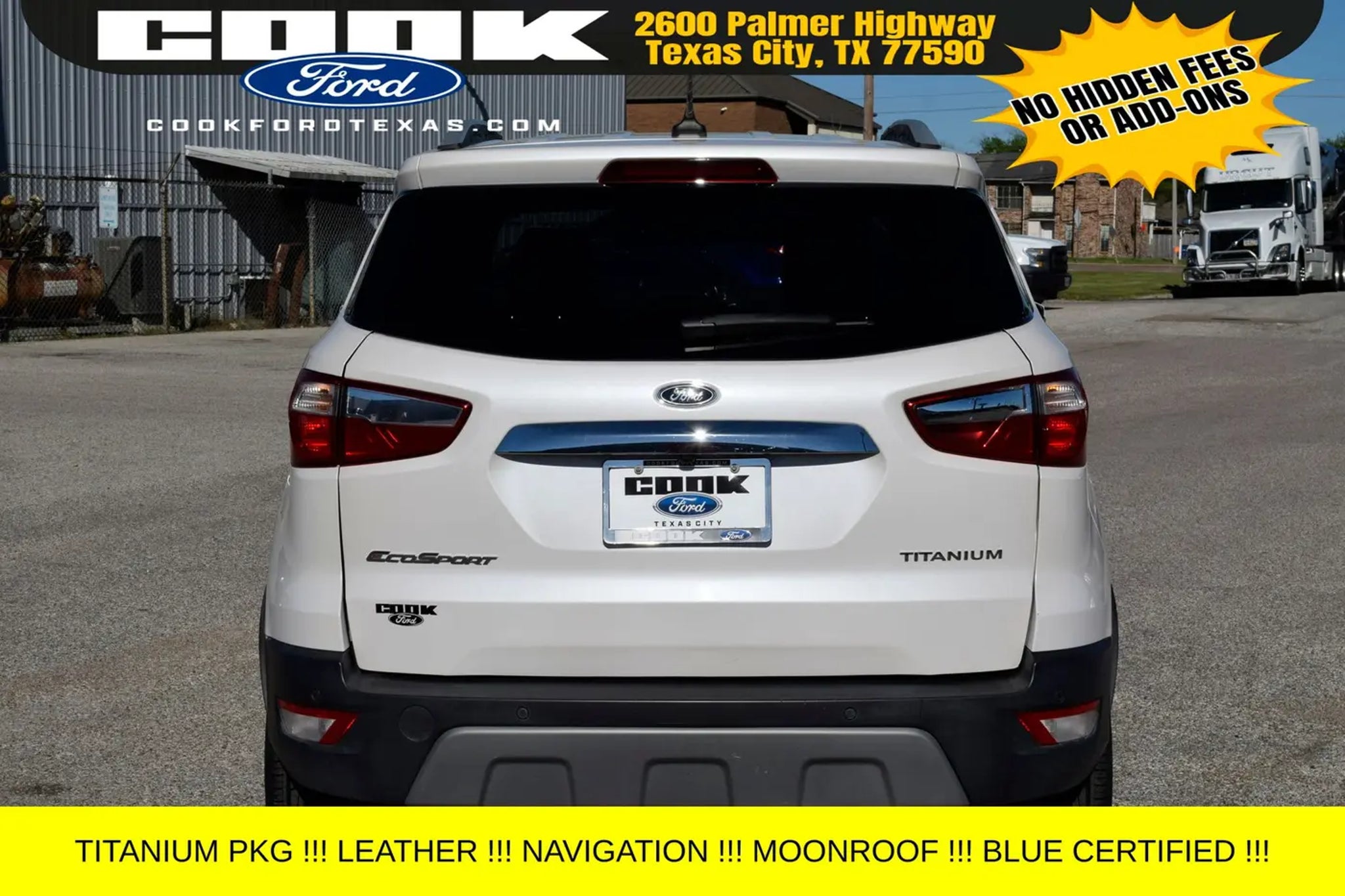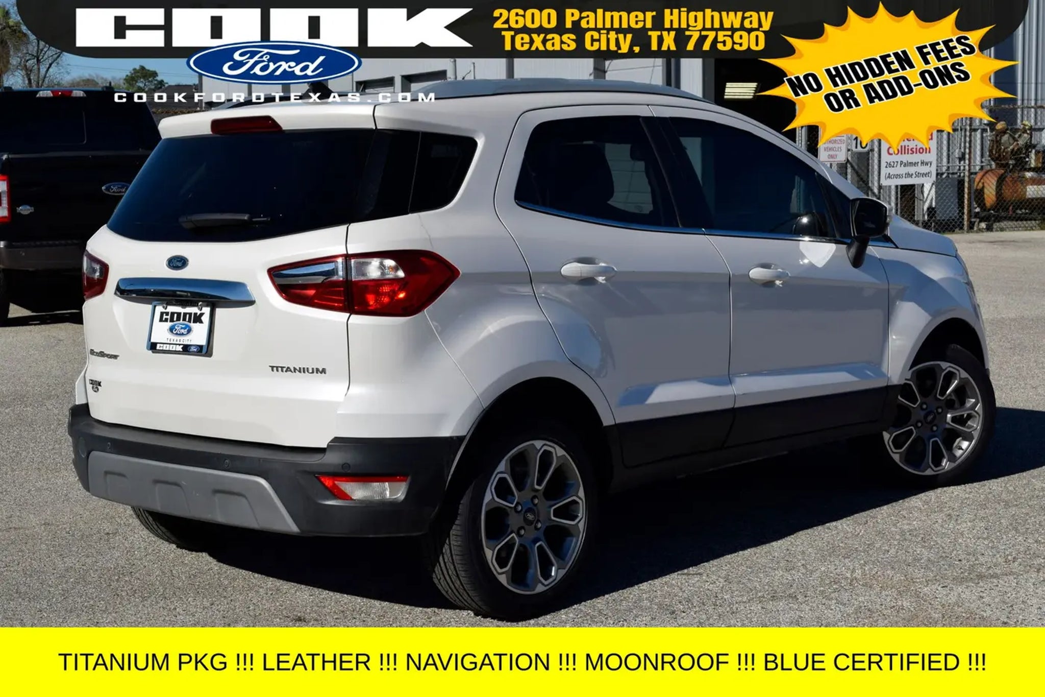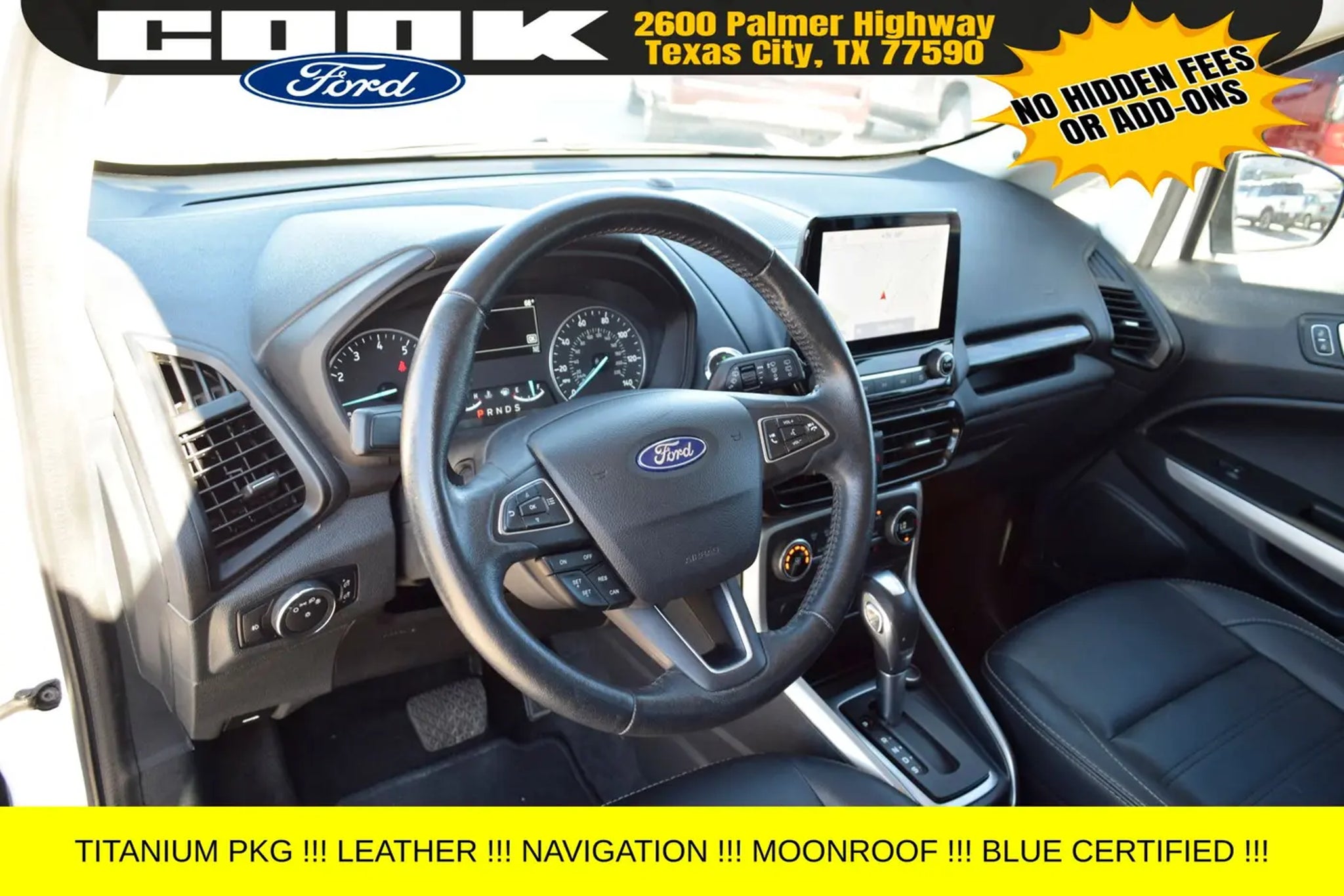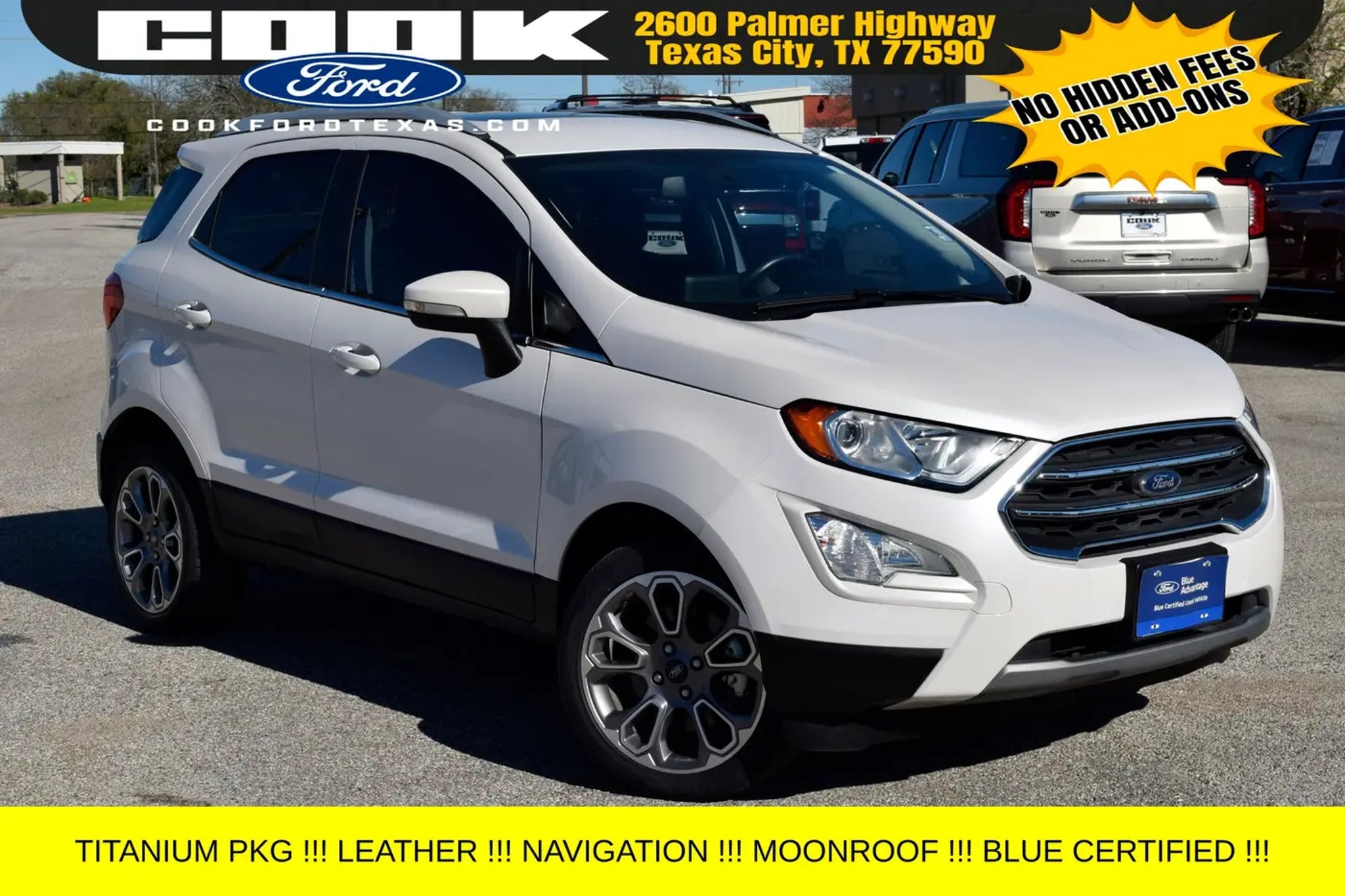 Certification Program Details: Ford Blue Advantage: Blue Certified * 139 Point Inspection * Transferable Warranty * Vehicle History * Warranty Deductible: $100 * Roadside Assistance * Limited Warranty: 3 Month/4,000 Mile (whichever comes first) after new car warranty expires or from certified purchase date * and 11,000 FordPass Rewards Points to use toward first maintenance visit This stunning 2021 Ford EcoSport Titanium in White Platinum Metallic Tri-Coat is a standout in our showroom. Equipped with an impressive array of premium features, this certified pre-owned SUV is ready to elevate your driving experience. - Navigation System - Power moonroof - 10 Speakers - SYNC 3 Communications & Entertainment System - Automatic temperature control - Power driver seat - 4-Wheel Disc Brakes - Rear Parking Sensors - Heated Front Bucket Seats Powered by the efficient EcoBoost 1.0L I3 engine and paired with a 6-Speed Automatic transmission, this EcoSport delivers an exceptional 27 city / 29 highway MPG, making it the perfect companion for your daily commute or weekend adventures. With its sleek exterior and well-appointed interior, this certified pre-owned Ford EcoSport Titanium is a true standout in its class. As part of the Ford Blue Advantage program, this EcoSport has undergone a rigorous 139-point inspection, ensuring it meets the highest standards of quality and reliability. With a transferable warranty, vehicle history report, and 11,000 FordPass Rewards Points to use towards your first maintenance visit, you can drive with confidence knowing that this vehicle has been meticulously cared for. Whether you're looking for a practical, fuel-efficient SUV or a premium driving experience, this 2021 Ford EcoSport Titanium is an exceptional choice. We invite you to schedule a test drive and experience the exceptional value and performance this certified pre-owned vehicle has to offer. Don't miss your opportunity to make this EcoSport your own.