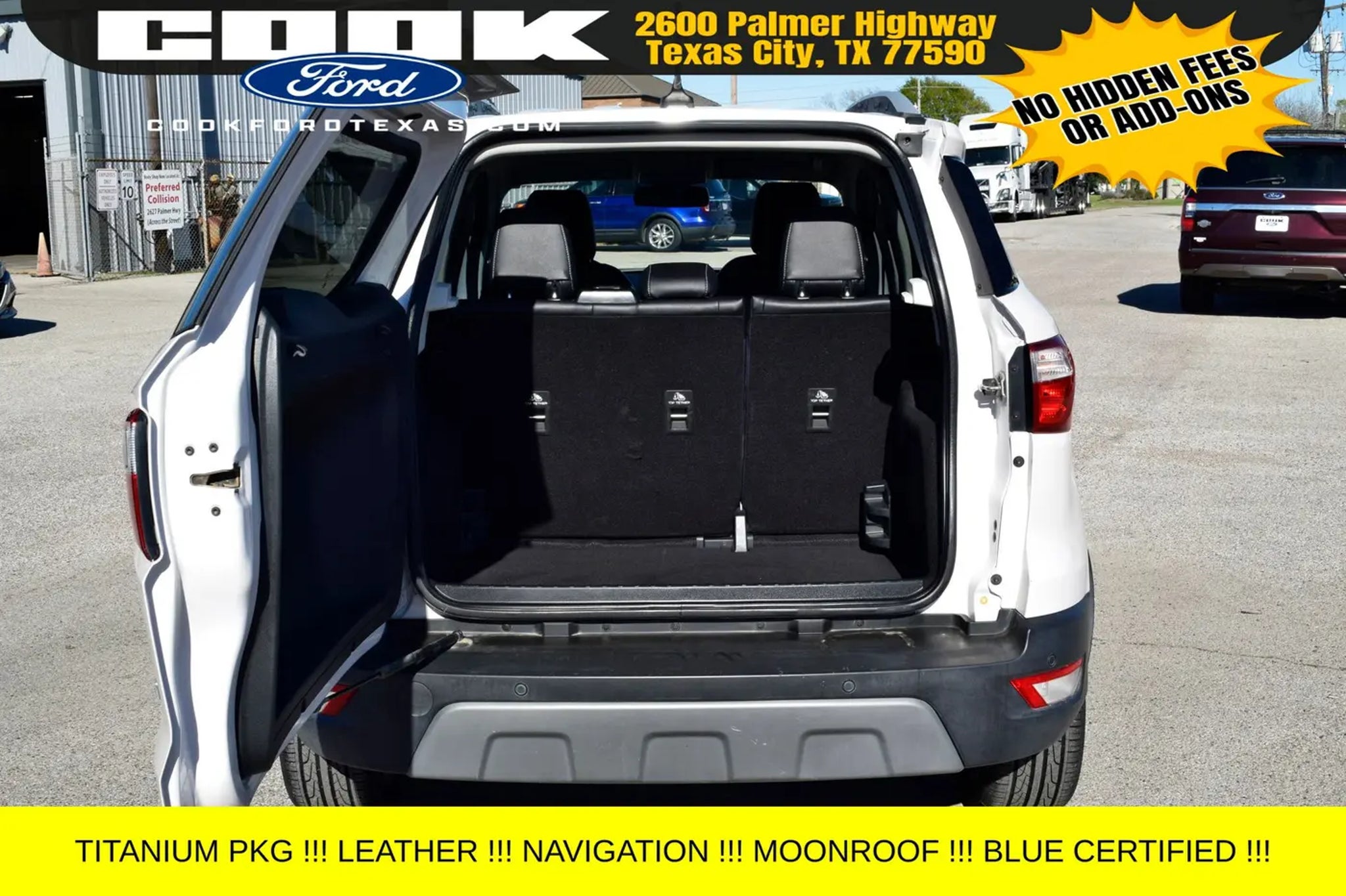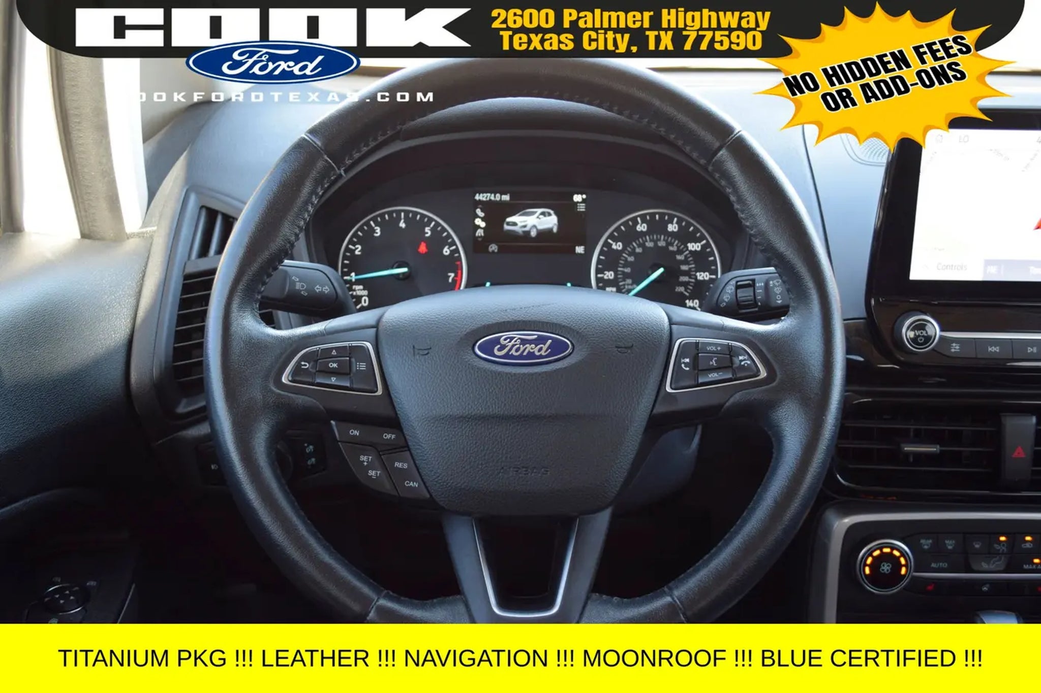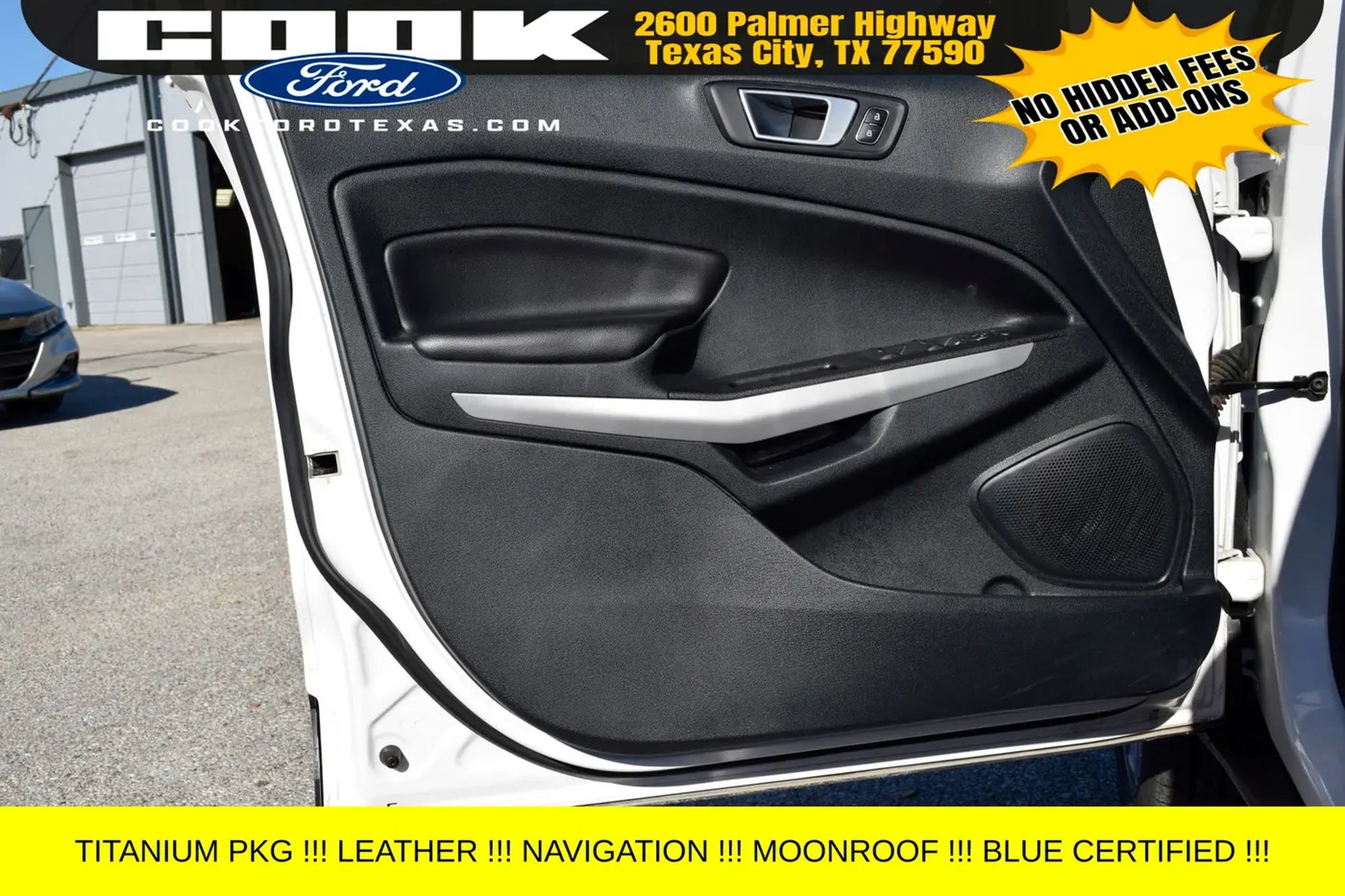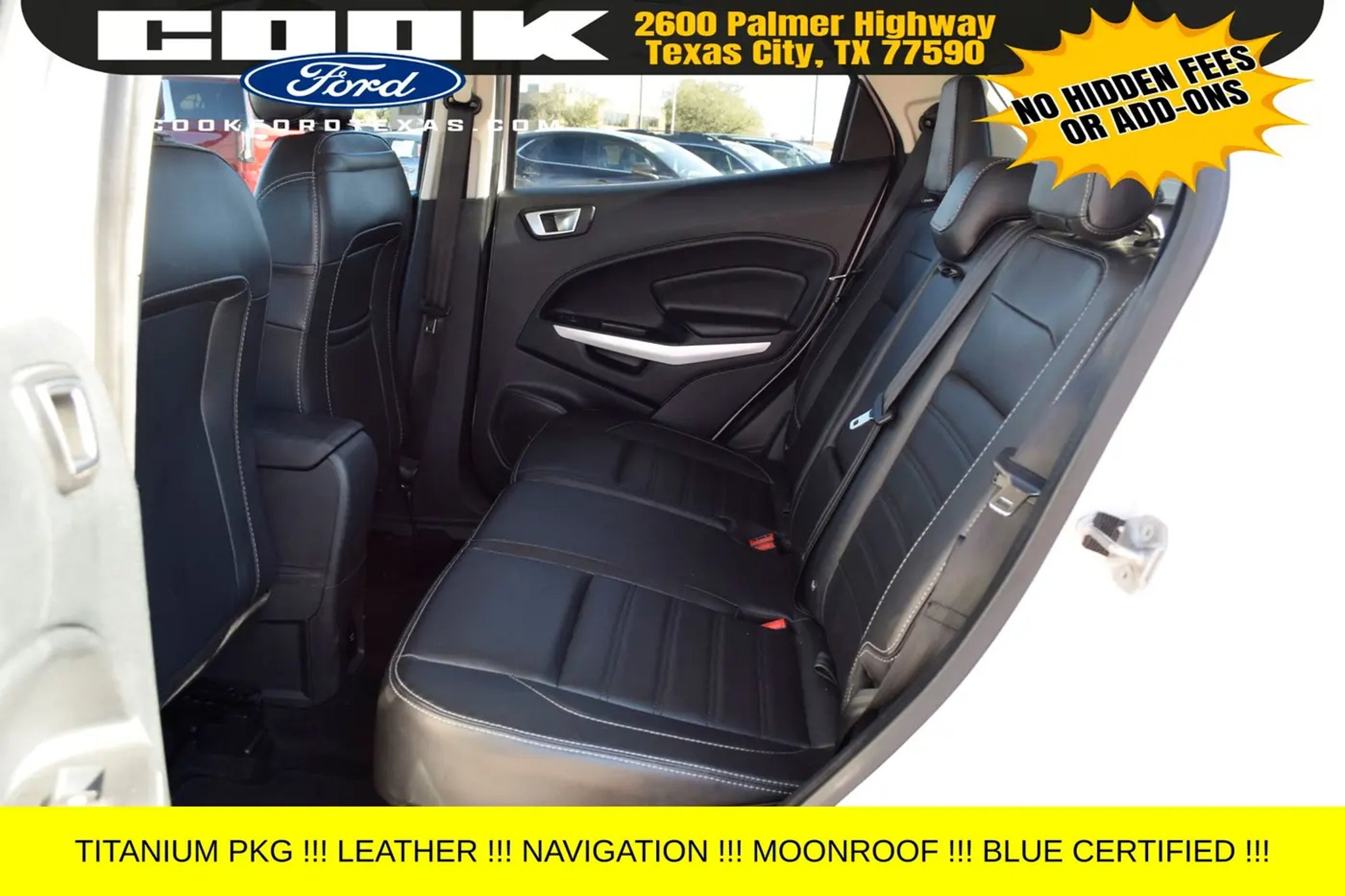 Certification Program Details: Ford Blue Advantage: Blue Certified * 139 Point Inspection * Transferable Warranty * Vehicle History * Warranty Deductible: $100 * Roadside Assistance * Limited Warranty: 3 Month/4,000 Mile (whichever comes first) after new car warranty expires or from certified purchase date * and 11,000 FordPass Rewards Points to use toward first maintenance visit This stunning 2021 Ford EcoSport Titanium in White Platinum Metallic Tri-Coat is a standout in our showroom. Equipped with an impressive array of premium features, this certified pre-owned SUV is ready to elevate your driving experience. - Navigation System - Power moonroof - 10 Speakers - SYNC 3 Communications & Entertainment System - Automatic temperature control - Power driver seat - 4-Wheel Disc Brakes - Rear Parking Sensors - Heated Front Bucket Seats Powered by the efficient EcoBoost 1.0L I3 engine and paired with a 6-Speed Automatic transmission, this EcoSport delivers an exceptional 27 city / 29 highway MPG, making it the perfect companion for your daily commute or weekend adventures. With its sleek exterior and well-appointed interior, this certified pre-owned Ford EcoSport Titanium is a true standout in its class. As part of the Ford Blue Advantage program, this EcoSport has undergone a rigorous 139-point inspection, ensuring it meets the highest standards of quality and reliability. With a transferable warranty, vehicle history report, and 11,000 FordPass Rewards Points to use towards your first maintenance visit, you can drive with confidence knowing that this vehicle has been meticulously cared for. Whether you're looking for a practical, fuel-efficient SUV or a premium driving experience, this 2021 Ford EcoSport Titanium is an exceptional choice. We invite you to schedule a test drive and experience the exceptional value and performance this certified pre-owned vehicle has to offer. Don't miss your opportunity to make this EcoSport your own.