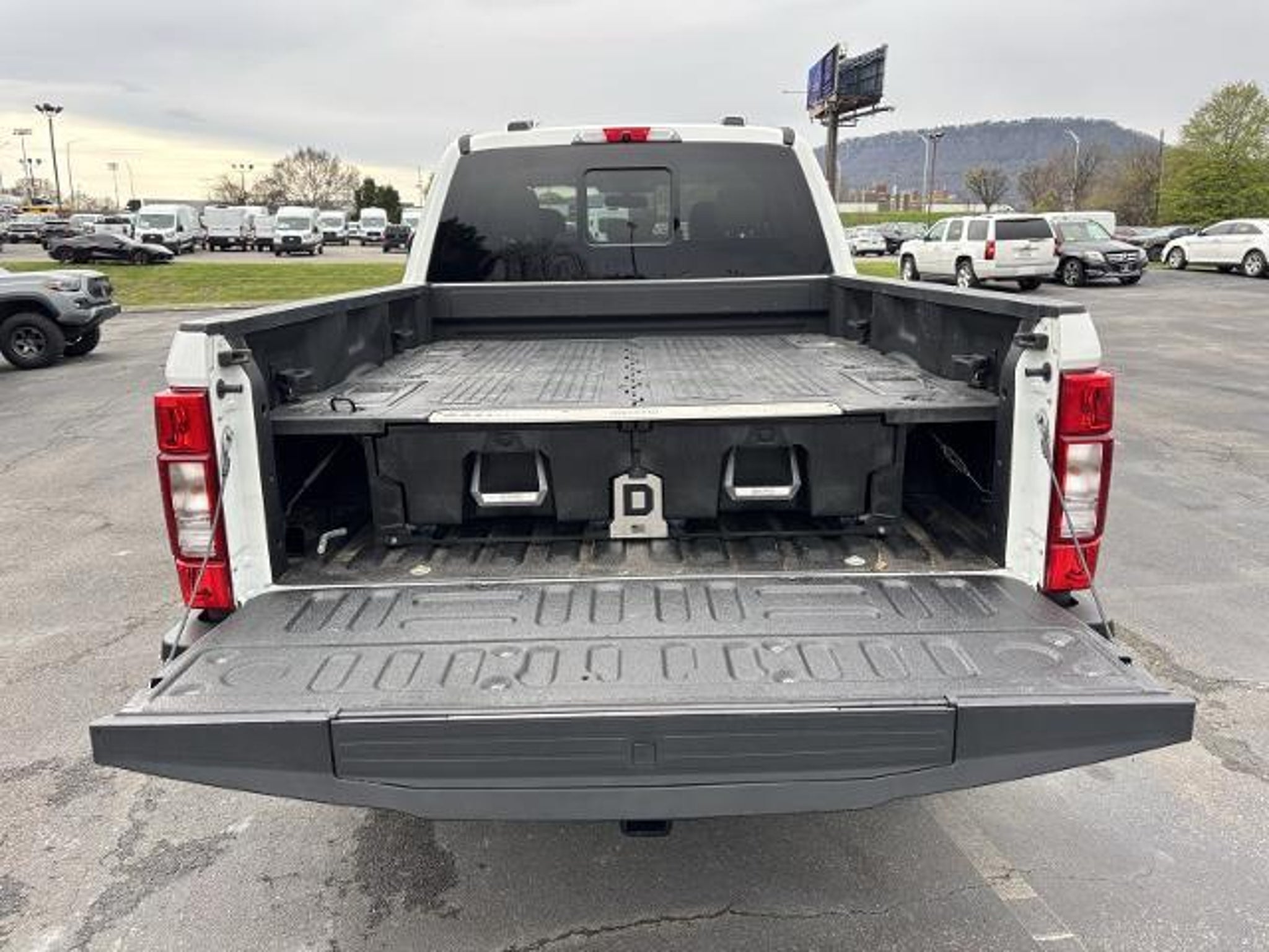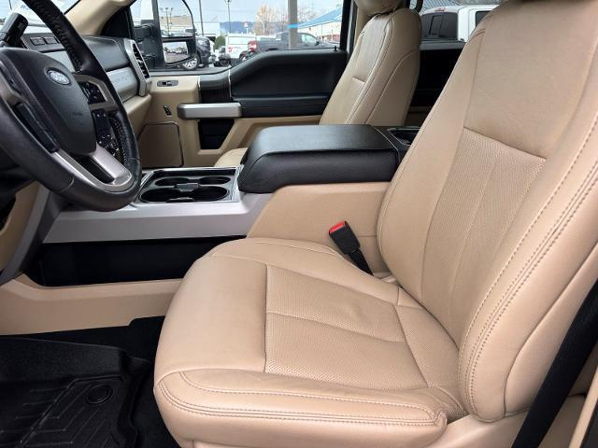 2020 Ford F-250SD Lariat F-250 SuperDuty Lariat, 4D Crew Cab, Power Stroke 6.7L V8 DI 32V OHV Turbodiesel, 10-Speed Automatic, 4WD, White, Medium Light Camel Leather, 10 Speakers, 110V/400W Outlet, 397 Amp Alternators, 4-Wheel Disc Brakes, 6 Angular Chrome Extended Running Boards, ABS brakes, Adjustable pedals, Air Conditioning, Alloy wheels, AM/FM radio: SiriusXM, Auto High-beam Headlights, Auto-dimming Rear-View mirror, Automatic temperature control, Brake assist, Bumpers: chrome, Compass, Cruise Control, Delay-off headlights, Driver door bin, Driver vanity mirror, Dual front impact airbags, Dual front side impact airbags, Easy EntryÂ/Exit Memory Driver's Seat Feature, Electronic Stability Control, Emergency communication system: SYNC 3 911 Assist, Engine Block Heater, Flow-Through Console, Front anti-roll bar, Front Bucket Seats, Front Center Armrest, Front dual zone A/C, Front fog lights, Front Leather Seating Surfaces 40/Console/40, Front reading lights, Fully automatic headlights, FX4 Off-Road Package, GVWR: 10,000 lb Payload Package, Heated door mirrors, Heated Steering Wheel, High Capacity Trailer Tow Package, Hill Descent Control, Illuminated entry, Lariat Value Package, Leather steering wheel, LED Box Lighting, Low tire pressure warning, Memory Power-Adjustable Pedals, Off-Road Specifically Tuned Shock Absorbers, Order Code 608A, Outside temperature display, Overhead airbag, Overhead console, Panic alarm, Passenger door bin, Passenger vanity mirror, Power door mirrors, Power driver seat, Power Heated/Ventilated Driver Seat w/Memory, Power Heated/Ventilated Passenger Seat, Power passenger seat, Power steering, Power windows, PowerScope Trailer Tow Mirrors w/Heat, PowerScope Trailer Tow Mirrors w/Memory, Radio data system, Radio: B&O System by Bang & Olufsen, Rapid-Heat Supplemental Cab Heater, Rear CHMSL Camera, Rear Parking Sensors, Rear reading lights, Rear seat center armrest, Rear step bumper, Rear window defroster, Rearview Camera, Remote keyless entry, Remote Start System, Security system, SiriusXM Radio, Split folding rear seat, Steering wheel mounted audio controls, SYNC 3 Communications & Entertainment System, Tachometer, Tailgate Step & Handle, Telescoping steering wheel, Tilt steering wheel, Traction control, Trip computer, Turn signal indicator mirrors, Unique FX4 Off-Road Box Decal, Universal Garage Door Opener (UGDO), Upfitter Switches (6), Variably intermittent wipers, Voice-Activated Touchscreen Navigation System, Wheels: 18 Bright Machined Cast Aluminum, Windshield Wiper De-Icer