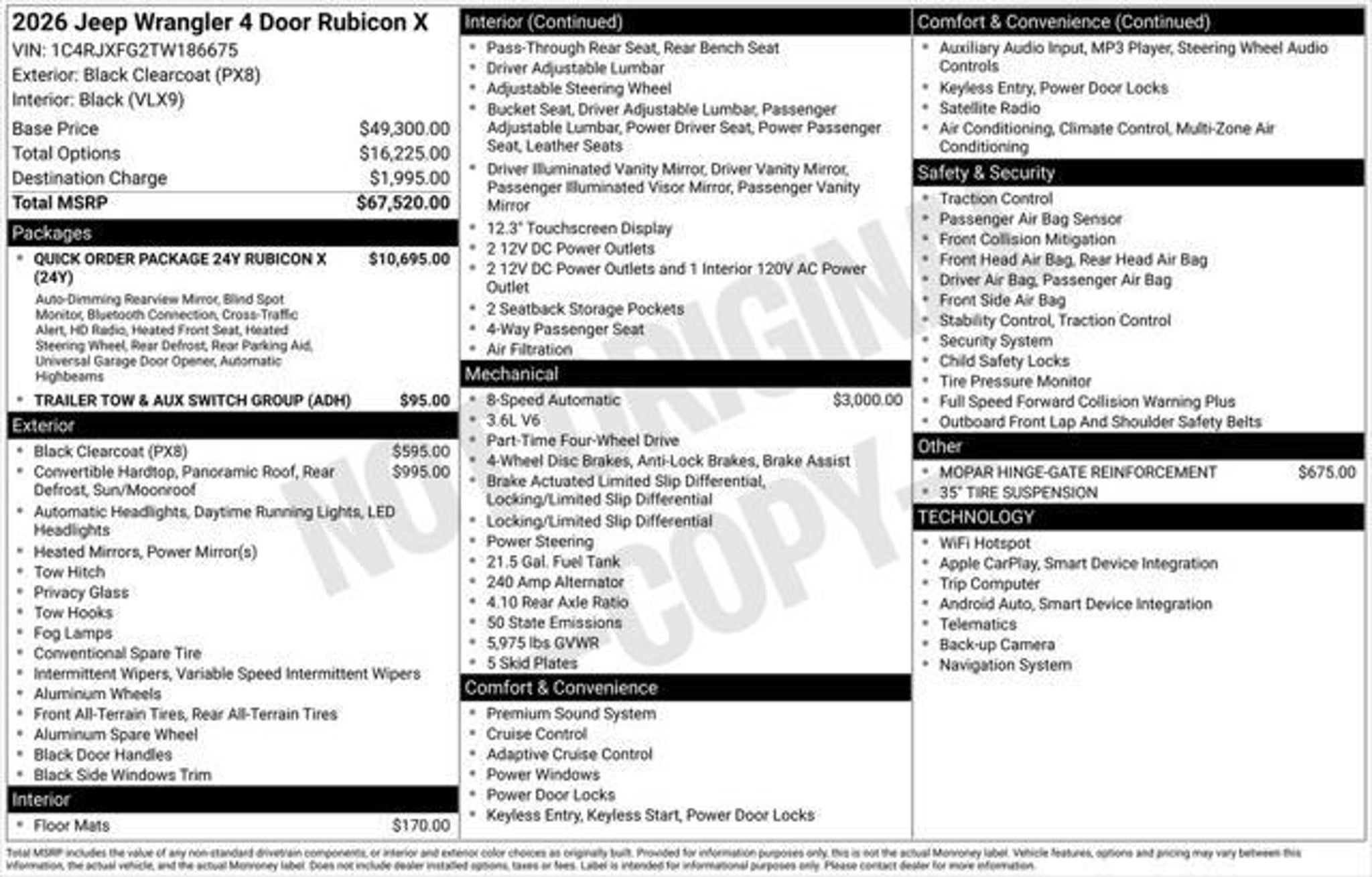 Details > 2026 Jeep Wrangler 4X4 Rubicon 4DR SUV For Sale in Bridgeport, WV Private Party Sellers Click here to place your ad now! You auta tell them you saw the ad in AutaBuy when you call or email. 1/25 2/25 3/25 4/25 5/25 6/25 7/25 8/25 9/25 10/25 11/25 12/25 13/25 14/25 15/25 16/25 17/25 18/25 19/25 20/25 21/25 22/25 23/25 24/25 25/25 View 25 Photos View All Add to My Garage Parked in Your Garage! Jenkins Hyundai Contact Seller: I would like to: Make Offer Check Availability Ask A Question Request More Photos Check Financing Options Send a copy of this message to me Add this listing to my garage Send to Mobile Mileage 815 Exterior Color Black Clearcoat Interior Color Black Doors 4 Engine 3.6L V6 Transmission 8 Speed Stock # SLO5878A VIN 1C4RJXFG2TW186675 Estimated Monthly Payment $1,096 mo Apply Now J.J. Best Banc & Co. 2026 Jeep Wrangler 4X4 Rubicon 4DR SUV Description: Jenkins Hyundai · Mileage: 815 · Color: Black Clearcoat Price: $63,000. Mileage 815 Exterior Color Black Clearcoat Interior Color Black Doors 4 Engine 3.6L V6 Transmission 8 Speed Stock # SLO5878A VIN 1C4RJXFG2TW186675 Estimated Monthly Payment $1,096 mo Apply Now J.J. Best Banc & Co. Add to My Garage Parked in Your Garage! Message Seller Jenkins Hyundai Contact Seller: I would like to: Make Offer Check Availability Ask A Question Request More Photos Check Financing Options Send a copy of this message to me Add this listing to my garage Offered for sale by Jenkins Hyundai BRIDGEPORT, WV Price: $63,000. Offered for sale by Jenkins Hyundai BRIDGEPORT, WV [entire inventory] Ask Auta Intelligence The first collector-car AI built directly into a classic car marketplace How many Wranglers were produced in Black? What trim levels were available for this model? What factory options were available on this model? What safety features does this model offer? How far is this from me? What does this VIN number tell me? How many of these were produced? Can you show me more suvs for a similar price? What colors did these come in? What engine options did these come with? How many passengers can this seat comfortably? When was this model first introduced? What kind of mileage do these get? Where is this located? What transmission options did these offer? How easy are parts to find for this model? Tell me about this model Do you have a similar car to sell? List It Now! Questions about this car? Ask Auta Intelligence for production numbers, available options, etc. · Subscribe to AutaBuy! · Send a Gift Subscription Notice to a Friend