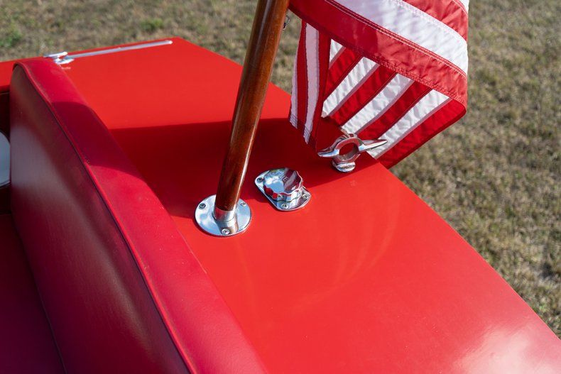 Exterior: The 17' wood hull was refurbished in 2018, and it is finished in white with a red deck, a varnished transom, and black bottom paint. Equipment includes a split windscreen, fore and aft flag holders, stainless-steel deck hardware, and navigation lights.