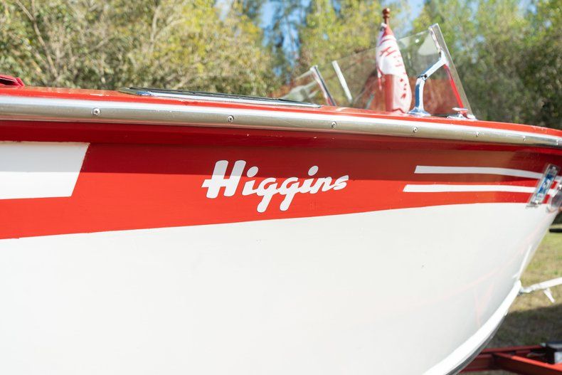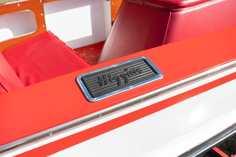 Description: This 1946 Higgins Speedster is a 17' wood runabout was refinished in white and red with black bottom paint during a refurbishment that was reportedly completed by Jeff Oppenheimer, Vice President of the Higgins Classic Boat Club, in 2018. Power is from a 218ci inline-six paired with a forward-reverse transmission, and equipment includes a split windscreen, navigation lights, flag holders, stainless-steel deck hardware, and two rows of bench seats upholstered in red vinyl.