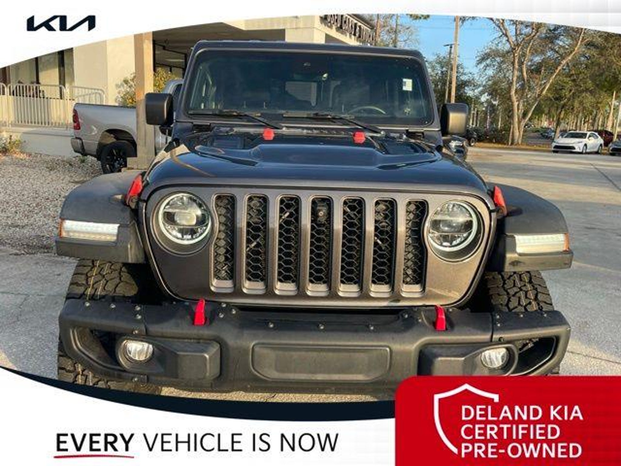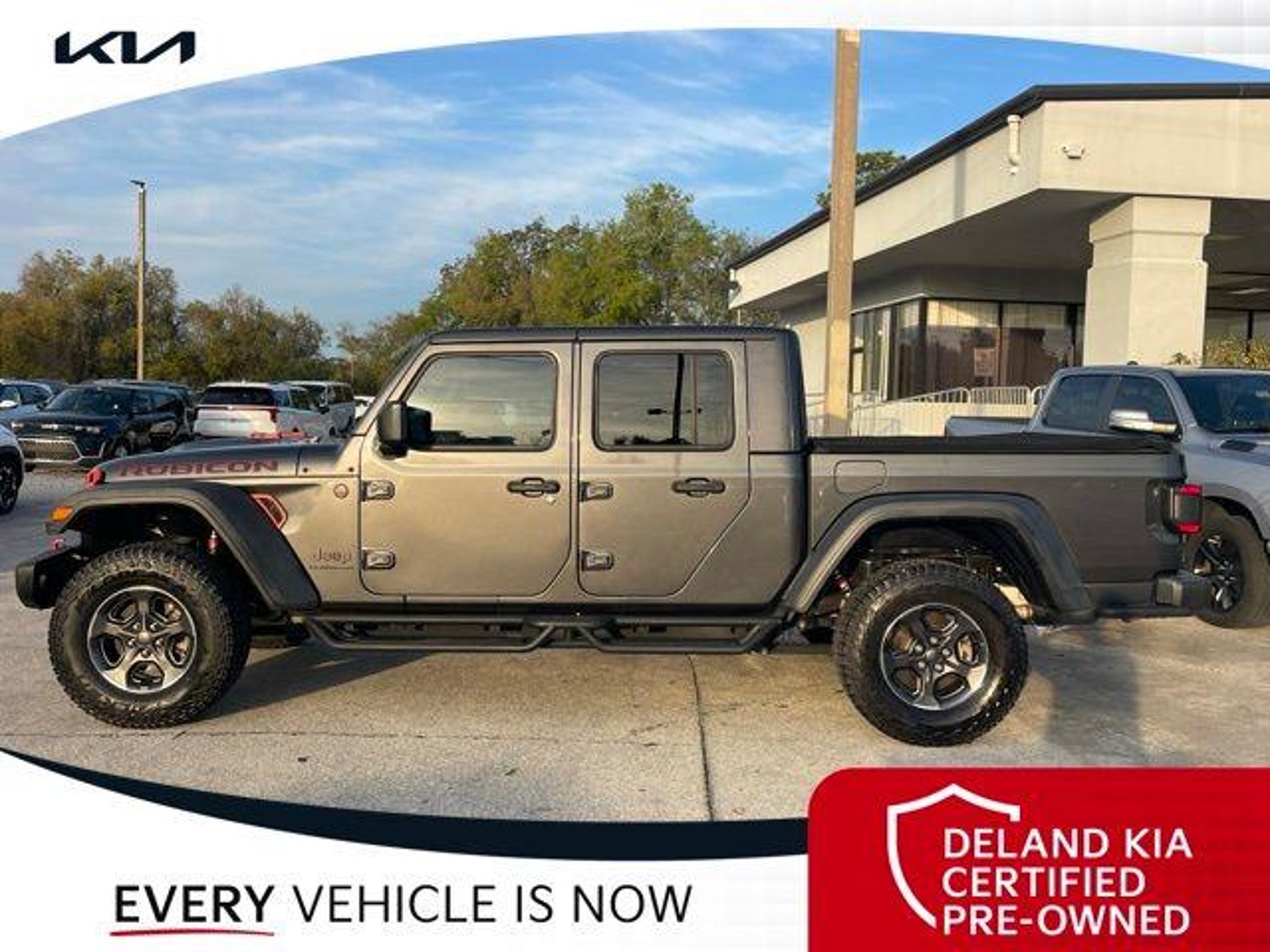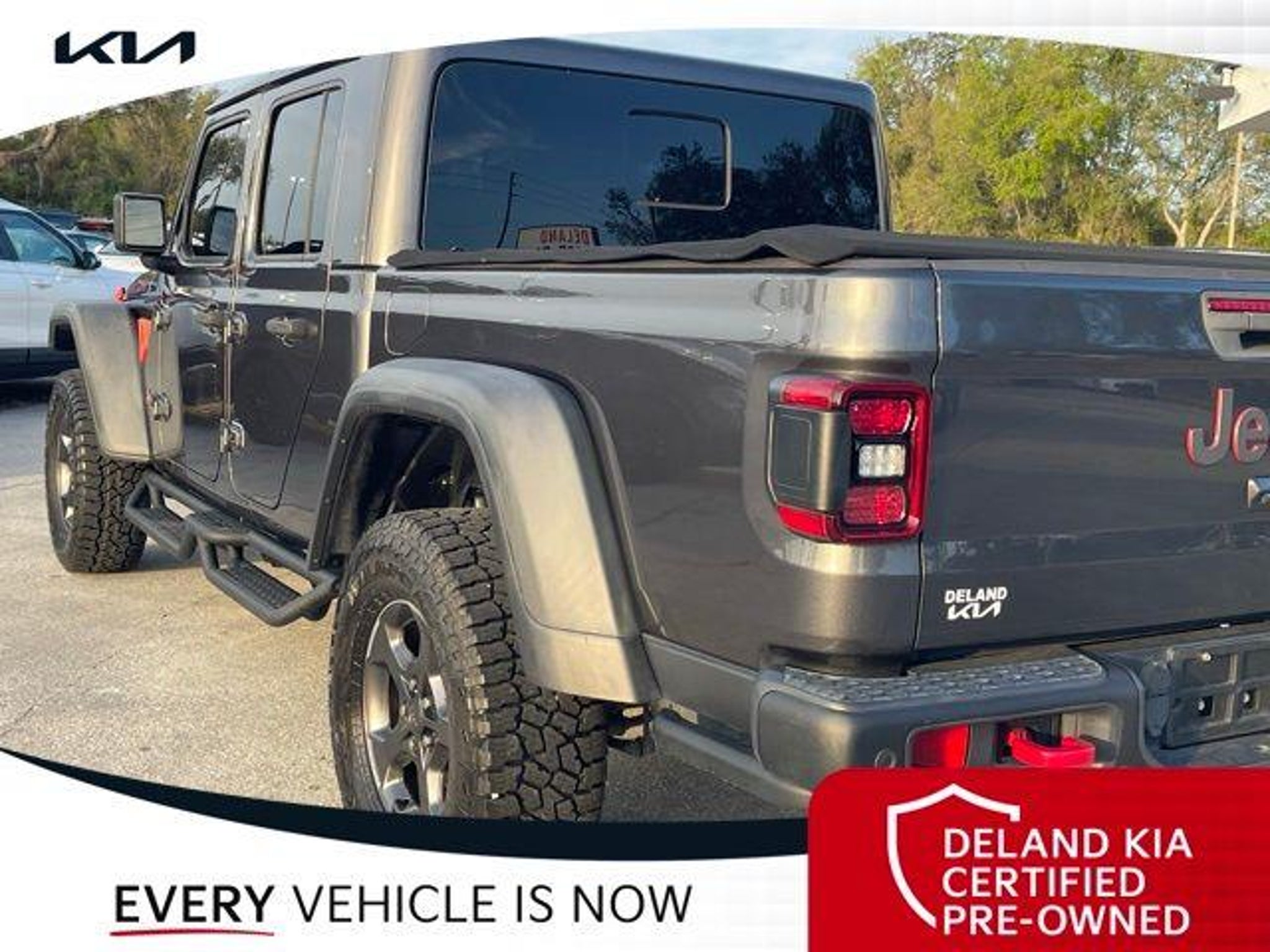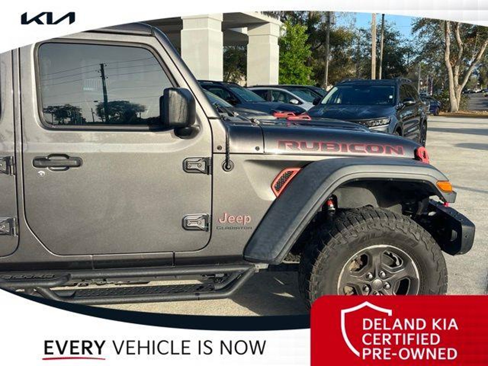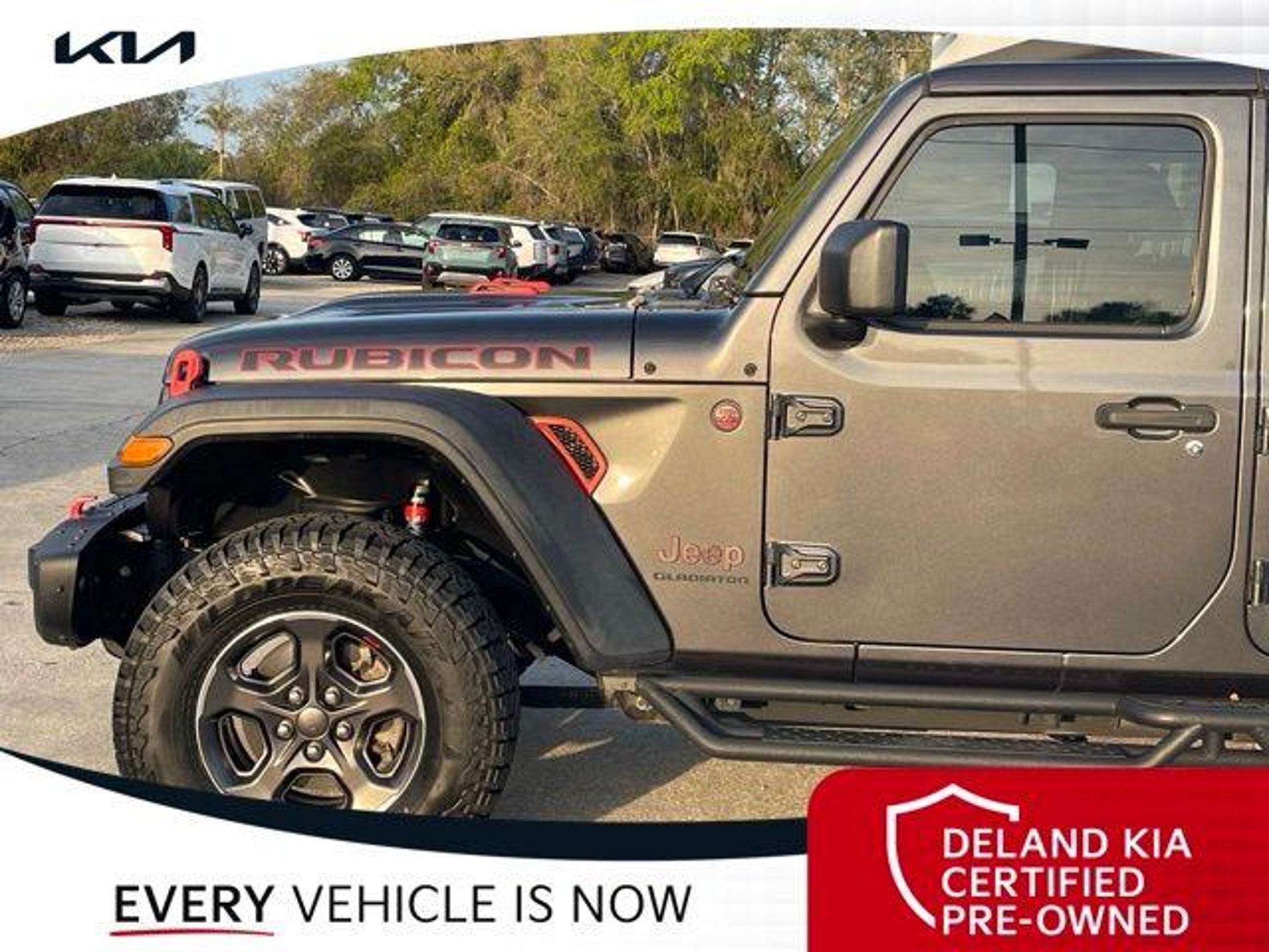 Recent Arrival! Granite Crystal Metallic Clearcoat 2020 Jeep Gladiator Rubicon 0 MONEY DOWN AVAILABLE***, KIA CERTIFIED***10 YR/100K WARRANTY***BUY WITH CONFIDENCE, LIFETIME OIL CHANGES, CARFAX ACCIDENT FREE, NAVIGATION, Backup Camera, Running Boards. Odometer is 11996 miles below market average! Deland Kia, We're Closer Than You Think!!!! Se habla Espanol!! Awards: * NACTOY 2020 North American Truck of the Year * 2020 KBB.com 10 Favorite New-for-2020 Cars Equipped with 8.4 Radio & Premium Audio Group (1-Year SiriusXM Guardian Trial, 5-Year SiriusXM Traffic Service, 5-Year SiriusXM Travel Link Service, Alpine Premium Audio System, Auto-Dimming Rear-View Mirror, Emergency/Assistance Call, For Details, Visit DriveUconnect.com, HD Radio, Radio: Uconnect 4C Nav w/8.4 Display, SiriusXM Traffic Plus, and SiriusXM Travel Link), Advanced Safety Group (Advanced Brake Assist and Full Speed Forward Collision Warning Plus), Cargo Group w/Trail Rail System (240 Amp Alternator, Exterior 115V AC Outlet, and Lockable Rear Underseat Storage), LED Lighting Group (Daytime Running Lamps LED Accents, Front LED Fog Lamps, LED Park Turn Lamps, LED Reflector Headlamps, and LED Taillamps), Quick Order Package 24R, Safety Group (Blind Spot & Cross Path Detection and ParkSense Rear Park Assist System), 4-Wheel Disc Brakes, 4.10 Rear Axle Ratio, 8 Speakers, 97 mph Maximum Speed Calibration, ABS brakes, Air Conditioning, Alloy wheels, AM/FM radio: SiriusXM, Apple CarPlay/Android Auto, Automatic temperature control, Bluetooth Wireless Speaker, Brake assist, Compass, Delay-off headlights, Driver door bin, Driver vanity mirror, Dual front impact airbags, Dual front side impact airbags, Electronic Stability Control, Front anti-roll bar, Front Bucket Seats, Front Center Armrest w/Storage, Front dual zone A/C, Front fog lights, Front reading lights, Fully automatic headlights, Garage door transmitter, Heated door mirrors, Illuminated entry, Integrated Off-Road Camera, Integrated roll-over protection, Leather steering wheel, Low tire pressure warning, Manufacturer's Statement of Origin, Occupant sensing airbag, Outside temperature display, Panic alarm, ParkView Rear Back-Up Camera, Passenger door bin, Passenger vanity mirror, Performance Suspension, Power door mirrors, Power steering, Power windows, Premium Black Sunrider Soft Top, Premium Cloth Low-Back Bucket Seats, Radio data system, Radio: Uconnect 4 w/7 Display, Rear anti-roll bar, Rear reading lights, Remote keyless entry, Roll-Up Tonneau Cover, Security system, Speed control, Split folding rear seat, Spray In Bedliner, Steel Front Bumper, Steering wheel mounted audio controls, Tachometer, Telescoping steering wheel, Tilt steering wheel, Traction control, Trip computer, Variably intermittent wipers, Voltmeter, and Wheels: 17 x 7.5 Granite Crystal AluminuM.