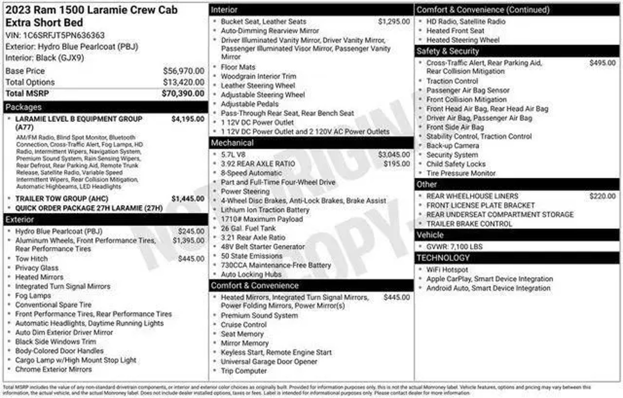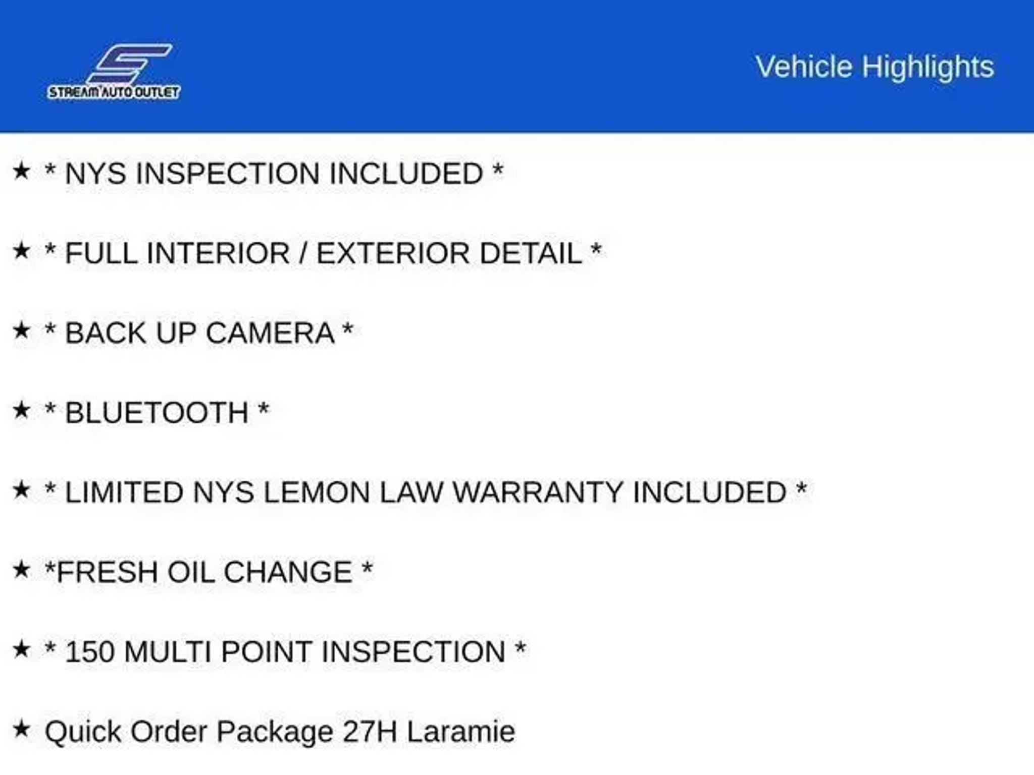 Discover the exceptional 2023 Ram 1500 Laramie, a true workhorse that combines power, capability, and refined luxury. With its impressive HEMI 5.7L V8 engine, 8-speed automatic transmission, and 4-wheel drive, this truck is ready to tackle any task with confidence. - NYS Inspection Included - Full Interior/Exterior Detail - Limited NYS Lemon Law Warranty Included - Fresh Oil Change - 150 Multi-Point Inspection The Laramie Level B Equipment Group elevates your driving experience with features like a 12-inch touchscreen display, a premium harman/kardon sound system, and advanced driver-assist technologies like Blind Spot and Cross Path Detection. The Trailer Tow Group ensures seamless towing capabilities, while the 20-inch premium painted and polished wheels add a touch of sophistication. Slip into the plush, leather-trimmed bucket seats and enjoy the convenience of power-adjustable lumbar support, heated and ventilated front seats, and a heated steering wheel. The rear power sliding window and rear underseat storage provide versatility to accommodate your needs. Safety is paramount in the 2023 Ram 1500 Laramie, with features like ParkSense Front/Rear Park Assist, Rear Back-Up Camera, and Electronic Stability Control. The LED reflector headlamps and front fog lamps ensure excellent visibility, while the rain-sensitive windshield wipers and auto high-beam control enhance your driving experience. Connectivity is seamless with the Uconnect 5 navigation system, 4G LTE Wi-Fi hotspot, and integration with Apple CarPlay and Android Auto. Stay connected and entertained on the go. This exceptional 2023 Ram 1500 Laramie is more than just a truck "“ it's a statement of power, capability, and refined luxury. Experience the difference for yourself and schedule a test drive today. We're confident you'll be impressed by its uncompromising performance and impressive features.