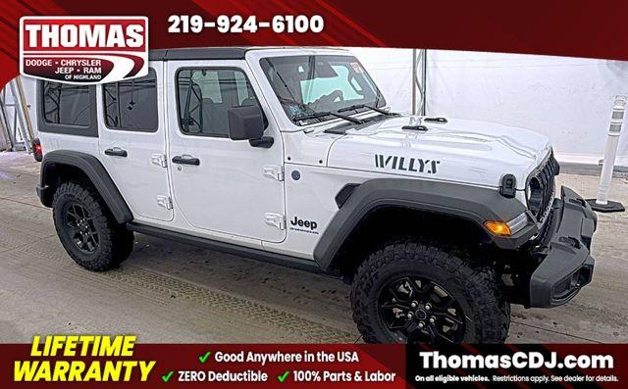 2025 Bright White Clearcoat Jeep Wrangler One Owner, 3-Piece Hard Top, 2-Door Passive Entry, Front Door Locks, 4-Wheel Drive Swing Gate Decal, 4.10 Rear Axle Ratio, 7 & 4 Pin Wiring Harness, 8 Speakers, Air Conditioning w/Auto Temperature Control, Air Filtering, Alloy wheels, Apple CarPlay/Android Auto, Auxiliary Switches, Black 3-Piece Hard Top, Black Grille, Class II Receiver Hitch, Compass, Convenience Group, Conventional Differential Front Axle, E-Locker Rear Axle, Emergency/Assistance Call, Freedom Panel Storage Bag, Front fog lights, Front LED Fog Lamps, Fully automatic headlights, Heated door mirrors, Heated Front Seats, Heated Steering Wheel, LED Premium Reflector Headlamps, Molded in Color Rubicon Highline Flare, Off-Road Plus Mode, ParkView Rear Back-Up Camera, Power door mirrors, Quick Order Package 29W Willys 4xe, Radio: Uconnect 5 w/12.3 Display, Rear Window Defroster, Rear Window Wiper/Washer, Remote keyless entry, Remote Start System, Security system, Speed control, Traction control, Universal Garage Door Opener, Wheels: 20 x 8 Machined/Painted Gray, Willy's Suspension, Willys 4xe Hood Decal. LIFETIME WARRANTY FOREVER! On ALL eligible new & used vehicles - $0 Deductible Parts and Labor! - Valid Anywhere in the USA! - Can be Serviced at any Licensed Facility in the USA! - No Expiration Full Powertrain Coverage for Your Entire Ownership! * NO CATCH & NO COST TO YOU! * On All Eligible New and Used Vehicles * Only at ThomasDCJ.com.