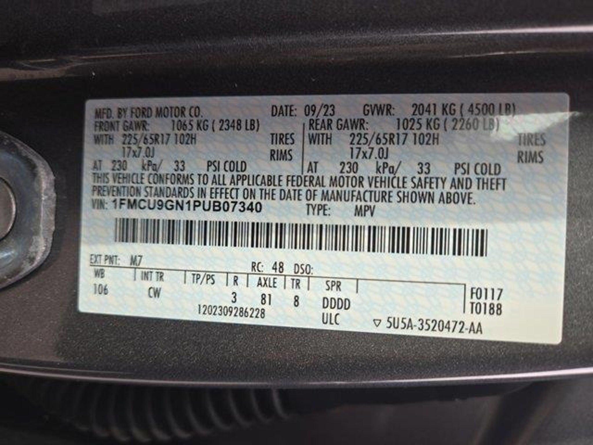 VIN 1FMCU9GN1PUB07340