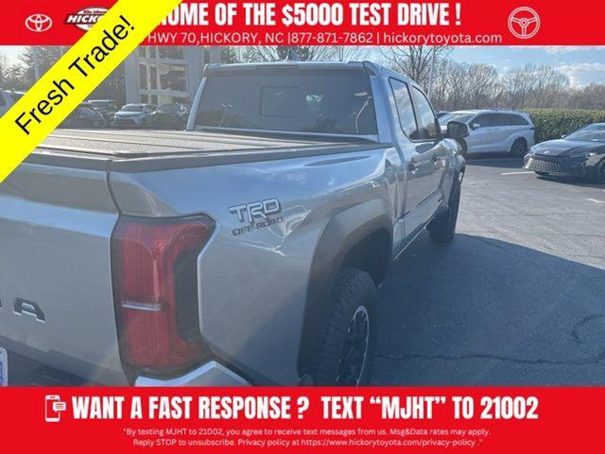 Details > 2026 Toyota Tacoma 4X4 TRD Off-Road 4DR Double Cab 5.0 FT SB 8A For Sale in Hickory, NC Private Party Sellers Click here to place your ad now! You auta tell them you saw the ad in AutaBuy when you call or email. 1/25 2/25 3/25 4/25 5/25 6/25 7/25 8/25 9/25 10/25 11/25 12/25 13/25 14/25 15/25 16/25 17/25 18/25 19/25 20/25 21/25 22/25 23/25 24/25 25/25 View 25 Photos View All Add to My Garage Parked in Your Garage! Mike Johnson's Hickory Toyota Contact Seller: I would like to: Make Offer Check Availability Ask A Question Request More Photos Check Financing Options Send a copy of this message to me Add this listing to my garage Send to Mobile Mileage 1,771 Doors 4 Engine 2.4L I4 Transmission 8 Speed Auto Stock # 67131A VIN 3TMLB5JN0TM218262 Estimated Monthly Payment $818 mo Apply Now J.J. Best Banc & Co. 2026 Toyota Tacoma 4X4 TRD Off-Road 4DR Double Cab 5.0 FT SB 8A Description: 2026 Toyota Tacoma TRD Off-Road 4WD 8-Speed Automatic 2.4L 4-Cylinder Recent Arrival! Before you buy, give Mike a try! More info at · Mileage: 1,771 Price: $47,499. Price: $47,023. Mileage 1,771 Doors 4 Engine 2.4L I4 Transmission 8 Speed Auto Stock # 67131A VIN 3TMLB5JN0TM218262 Estimated Monthly Payment $818 mo Apply Now J.J. Best Banc & Co. Add to My Garage Parked in Your Garage! Message Seller Mike Johnson's Hickory Toyota Contact Seller: I would like to: Make Offer Check Availability Ask A Question Request More Photos Check Financing Options Send a copy of this message to me Add this listing to my garage Offered for sale by Mike Johnson's Hickory Toyota HICKORY, NC Price: $47,499. Price: $47,023. Offered for sale by Mike Johnson's Hickory Toyota HICKORY, NC [entire inventory] Ask Auta Intelligence The first collector-car AI built directly into a classic car marketplace How far is this from me? What colors did these come in? What factory options were available on this model? What transmission options did these offer? Where is this located? What size tires does this run from the factory? What's the typical towing capacity in this configuration? Can you show me more pickups/trucks for a similar price? What trim levels were available for this model? How many of these were produced? When was this model first introduced? What kind of mileage do these get? Tell me more about this model How easy are parts to find for this model? What does this VIN number tell me? What engine options did these come with? Do you have a similar car to sell? List It Now! Questions about this car? Ask Auta Intelligence for production numbers, available options, etc. · Subscribe to AutaBuy! · Send a Gift Subscription Notice to a Friend