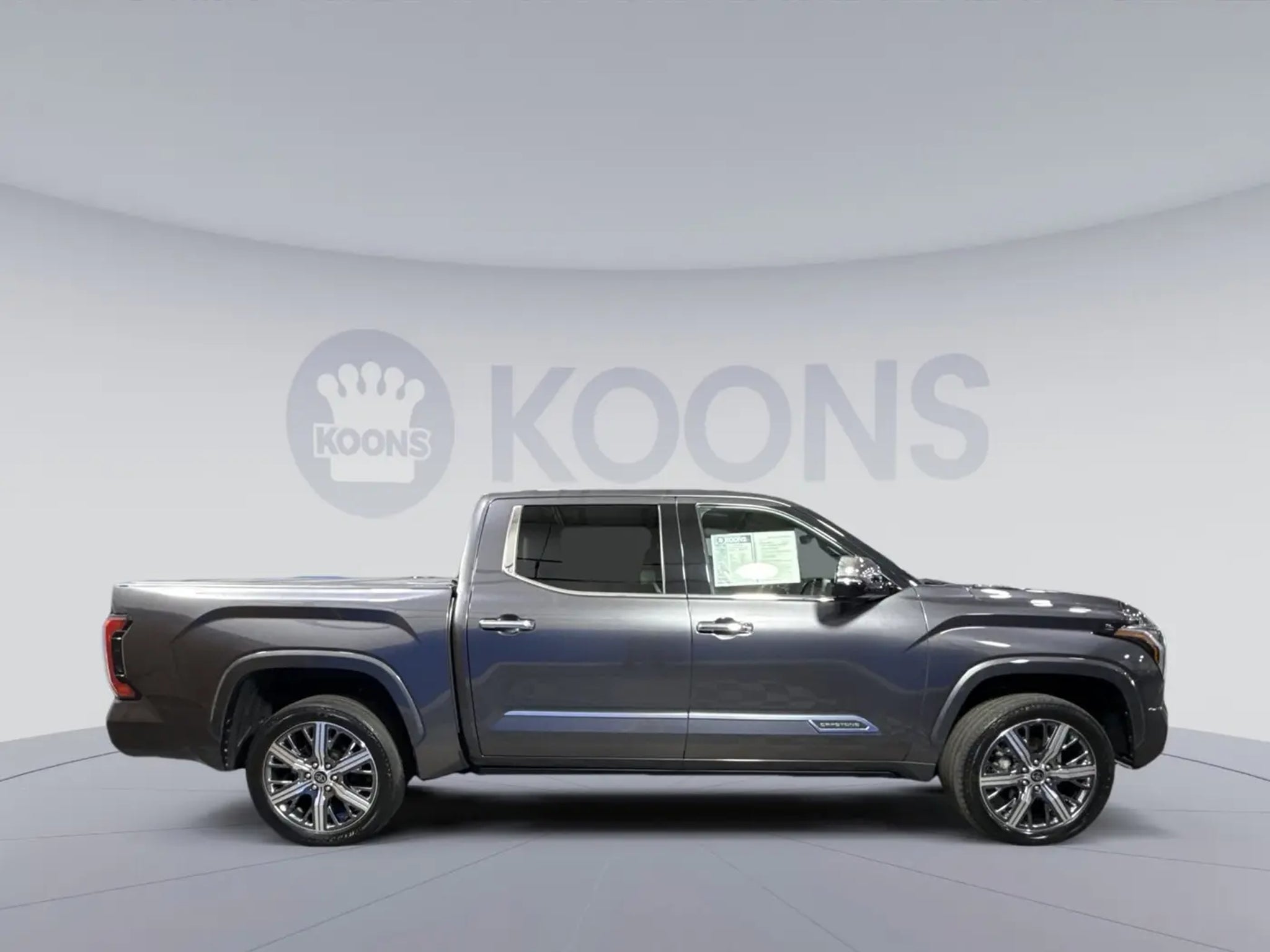 RECALL NOTICE: Some vehicles offered for sale may be subject to unrepaired manufacturer safety recalls. To determine the recall status of a vehicle, visit https:// below KBB Fair Purchase Price! 2023 Toyota Tundra Hybrid Capstone Magnetic Gray Metallic3.4L V6, AM/FM radio: SiriusXM, Apple CarPlay/Android Auto, Auto High-beam Headlights, Auto-dimming door mirrors, Auto-dimming Rear-View mirror, Brake assist, Bumpers: body-color, Delay-off headlights, Electronic Stability Control, Emergency communication system: Safety Connect (10-year trial), Front Bucket Seats, Front Center Armrest, Front dual zone A/C, Front fog lights, Fully automatic headlights, Heads-Up Display, Heated & Ventilated Front Bucket Seats, Heated front seats, Heated rear seats, Heated steering wheel, Navigation System, Outside temperature display, Overhead console, Power moonroof, Power passenger seat, Radio: Premium Audio w/JBL, Rear seat center armrest, Rear step bumper, Semi-Aniline Leather Seat Trim, Split folding rear seat, Steering wheel mounted audio controls, Telescoping steering wheel, Turn signal indicator mirrors, Ventilated front seats, Ventilated rear seats, 12 Speakers, 3.31 Axle Ratio, 4-Wheel Disc Brakes, ABS brakes, Air Conditioning, Alloy wheels, Automatic temperature control, Compass, Driver door bin, Driver vanity mirror, Dual front impact airbags, Dual front side impact airbags, Front anti-roll bar, Front reading lights, Front wheel independent suspension, Garage door transmitter: HomeLink, Heated door mirrors, Illuminated entry, Knee airbag, Leather Shift Knob, Low tire pressure warning, Memory seat, Occupant sensing airbag, Overhead airbag, Panic alarm, Passenger door bin, Passenger vanity mirror, Power door mirrors, Power driver seat, Power steering, Power windows, Radio data system, Rain sensing wipers, Rear reading lights, Rear window defroster, Remote keyless entry, Security system, Speed control, Speed-sensing steering, Steering wheel memory, Tachometer, Tilt steering wheel, Traction control, Trip computer, Variably intermittent wipers, Voltmeter, Wheels: 22 Dark Chrome Alloy, 3.4L V6, AM/FM radio: SiriusXM, Apple CarPlay/Android Auto, Auto High-beam Headlights, Auto-dimming door mirrors, Auto-dimming Rear-View mirror, Brake assist, Bumpers: body-color, Delay-off headlights, Electronic Stability Control, Emergency communication system: Safety Connect (10-year trial), Front Bucket Seats, Front Center Armrest, Front dual zone A/C, Front fog lights, Fully automatic headlights, Heads-Up Display, Heated & Ventilated Front Bucket Seats, Heated front seats, Heated rear seats, Heated steering wheel, Navigation System, Outside temperature display, Overhead console, Power moonroof, Power passenger seat, Radio: Premium Audio w/JBL, Rear seat center armrest, Rear step bumper, Semi-Aniline Leather Seat Trim, Split folding rear seat, Steering wheel mounted audio controls, Telescoping steering wheel, Turn signal indicator mirrors, Ventilated front seats, Ventilated rear seats.RECALL NOTICE: Some vehicles offered for sale may be subject to unrepaired manufacturer safety recalls. To determine the recall status of a vehicle, visit https:// or click here. We make every effort to provide accurate information, but please verify options and price before purchasing. All vehicles are subject to prior sale. All financing is subject to approved credit. All prices exclude tax, tags, title, registration, electronic filing fee and processing fee of $995. Prices include all applicable rebates and incentives. Additional rebates and incentives may apply to those who qualify. Pricing may not be compatible with special factory financing. Prices are valid based on manufacturer incentive program time periods, which vary. MSRP is the Manufacturer's Suggested Retail Price (MSRP) only and actual dealer pricing may vary. Due to availability, some images and options shown may be stock images or examples and may not reflect exact vehicle color, trim, options, or other specifications. Consult dealer for more information and details.