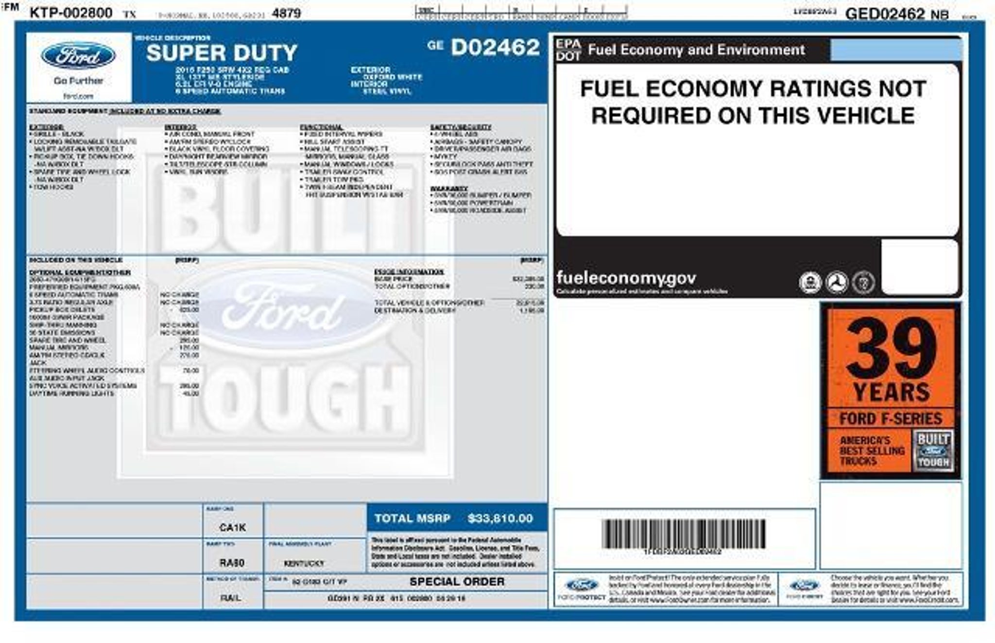 Introducing the 2016 Ford F-250SD XL, a rugged and capable workhorse that's ready to take on any task you throw its way. With its powerful 6.2L V8 engine, this truck delivers the performance and versatility you need to conquer even the toughest jobs. - SYNC W/MYFORD COMMUNICATIONS/ENTERTAINMENT SYSTEM - Radio: AM/FM Stereo/Single-CD/MP3 Player - SPARE TIRE, WHEEL, CARRIER & JACK - GVWR: 10,000 lb Payload Package - Brake assist - Rear step bumper - Cloth 40/20/40 Split Bench Seat - Front Center Armrest w/Storage This F-250SD XL is more than just a workhorse ? it's a true companion. With its durable exterior and well-appointed interior, it's built to handle the demands of your busy lifestyle. The SYNC? system keeps you connected and in control, while the Payload Package ensures you can haul everything you need. And with features like the rear step bumper and cloth seating, you'll enjoy both functionality and comfort. But the real star of the show is the 6.2L V8 engine. This powerful powerplant delivers the muscle you need to tackle any job, whether it's hauling heavy loads or navigating rough terrain. And with the TorqShift 6-Speed Automatic transmission, you'll enjoy smooth, responsive performance every time you get behind the wheel. Efficiency is also a priority, with features like the daytime running lamps and variable intermittent wipers helping to keep your fuel costs in check. And with the 4-wheel disc brakes and electronic stability control, you can feel confident and in control, even in the most challenging conditions. Whether you're a contractor, a weekend warrior, or just someone who needs a reliable and capable truck, the 2016 Ford F-250SD XL is the perfect choice. With its impressive performance, versatile features, and rugged good looks, this truck is ready to take on whatever life throws your way. The listed online price reflects a $1,000 finance incentive and a $1,000 qualifying retail trade-in incentive; absence of either or both incentives will result in an increase of up to $2,000 to the final sale price.