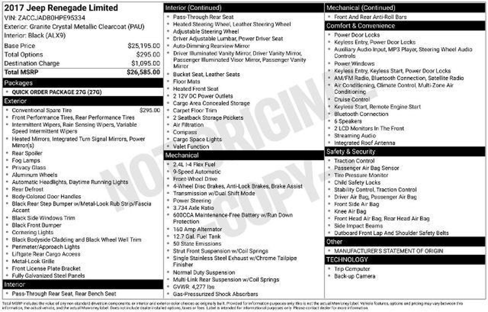 Discover the perfect blend of style, capability, and convenience in this exceptional 2017 Jeep Renegade Limited. Boasting a sleek gray exterior and a well-appointed interior, this versatile SUV is ready to elevate your driving experience. - Full-size temporary use spare tire - Steel spare wheel Under the hood, the 2.4L I4 MultiAir engine, paired with a 9-Speed 948TE Automatic transmission and Front-Wheel Drive, delivers a remarkable balance of power and efficiency, with an impressive 22 city and 30 highway MPG. The Renegade Limited comes equipped with a wealth of premium features that cater to your every need. Enjoy the convenience of keyless entry, the comfort of a power driver's seat, and the connectivity of the Uconnect 3 infotainment system with a 5-inch display. Stay connected with SiriusXM radio and steer with confidence thanks to the steering wheel-mounted audio controls. Elevate your driving experience with the Renegade's advanced safety features, including ABS brakes, Electronic Stability Control, and a ParkView Rear Back-Up Camera. Stay comfortable in any weather with dual-zone automatic climate control, a rear window defroster, and a heated steering wheel. Indulge in the luxurious leather-trimmed bucket seats, which offer both style and support. The split-folding rear seat provides versatility, allowing you to adapt the cabin to your needs. Enhance your driving pleasure with the 18-inch aluminum wheels and the convenience of rain-sensing wipers. This Jeep Renegade Limited is a true standout in its class, blending exceptional capabilities, advanced technology, and premium comfort features. Experience the difference for yourself and schedule a test drive today. We're confident you'll be impressed by the exceptional value and driving experience this Renegade has to offer.
