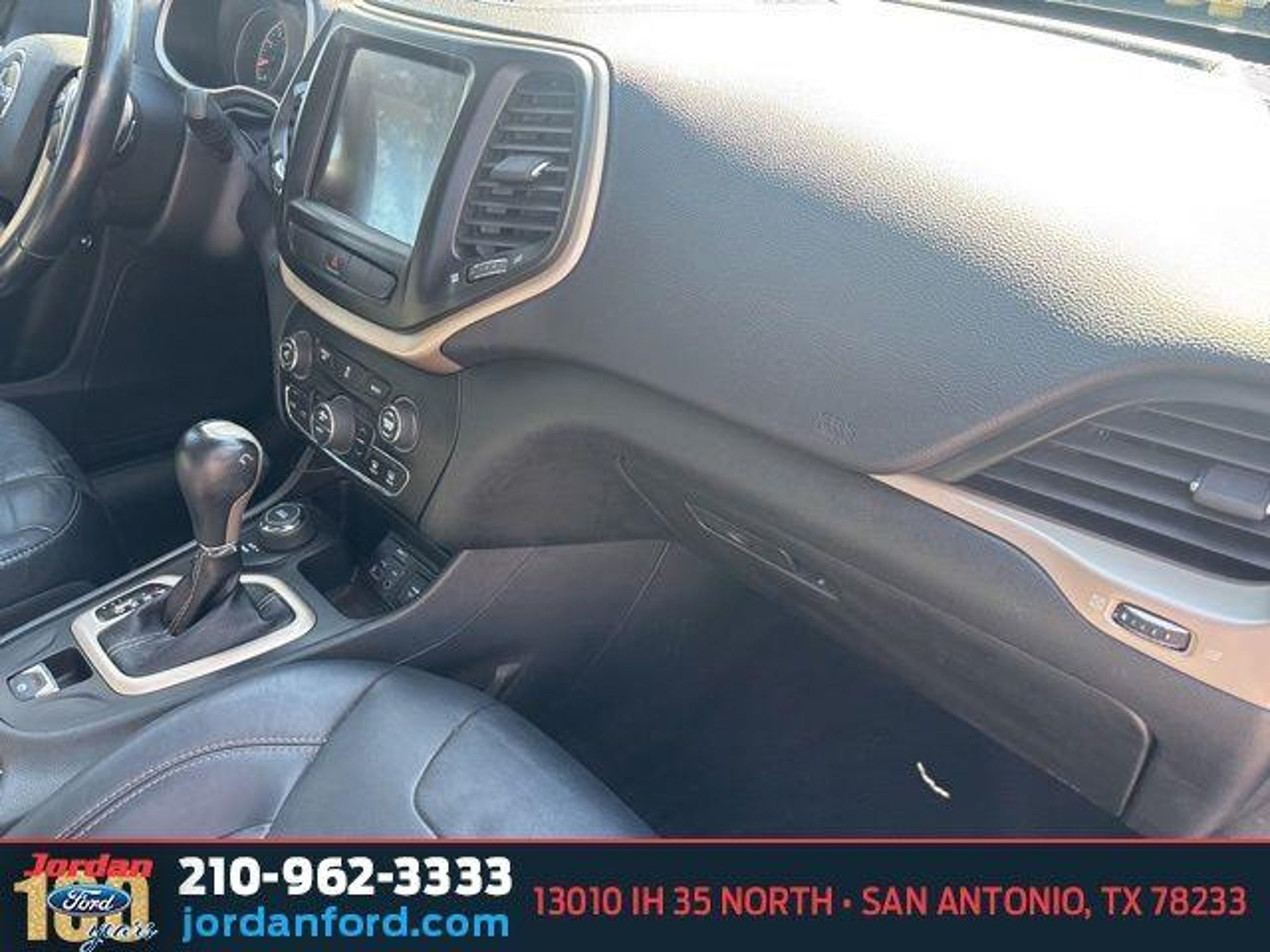 19/27 City/Highway MPG Granite Crystal Metallic Clearcoat 2014 Jeep Cherokee Limited 4WD 3.2L V6 9-Speed 948TE Automatic 1 Year Trial (Registration Required), 4-Wheel Disc Brakes, 6 Speakers, 8.4 Touch Screen Display, ABS brakes, Air Conditioning, Alloy wheels, AM/FM radio: SiriusXM, Anti-whiplash front head restraints, Auto-dimming Rear-View mirror, Automatic temperature control, Brake assist, Bumpers: body-color, Compass, Delay-off headlights, Driver door bin, Driver vanity mirror, Dual front impact airbags, Dual front side impact airbags, Electronic Stability Control, Emergency communication system, Four wheel independent suspension, Front anti-roll bar, Front Bucket Seats, Front Center Armrest, Front dual zone A/C, Front fog lights, Front reading lights, Fully automatic headlights, Garage door transmitter, GPS Antenna Input, GPS Navigation, HD Radio, Heated door mirrors, Heated front seats, Heated steering wheel, Illuminated entry, Integrated Voice Command w/Bluetooth, Knee airbag, Leather Shift Knob, Leather Trimmed Bucket Seats, Low tire pressure warning, Normal Duty Suspension, Occupant sensing airbag, Outside temperature display, Overhead airbag, Overhead console, Panic alarm, ParkView Rear Back-Up Camera, Passenger door bin, Passenger vanity mirror, Power door mirrors, Power driver seat, Power steering, Power windows, Quick Order Package 26G, Radio data system, Radio: Uconnect 8.4A AM/FM/BT/Access, Radio: Uconnect 8.4AN AM/FM/BT/Access/NAV, Rear anti-roll bar, Rear reading lights, Rear seat center armrest, Rear side impact airbag, Rear window defroster, Rear window wiper, Remote keyless entry, Roof rack: rails only, Security system, SIRIUSXM Traffic, SiriusXM Travel Link, Speed control, Speed-sensing steering, Split folding rear seat, Steering wheel mounted audio controls, Tachometer, Telescoping steering wheel, Tilt steering wheel, Traction control, Trip computer, Turn signal indicator mirrors, Uconnect Access, Variably intermittent wipers, Voltmeter, Wheels: 18 x 7 Polished Aluminum, Wireless Charging Pad. Call (210)653-3673 with any questions or to schedule a test drive! Jordan Ford has proudly served drivers in San Antonio, Texas, and surrounding areas like New Braunfels, Boerne, and Schertz for over 100 years. Since 1919, we?ve been dedicated to providing a simple, transparent car-buying experience with our Simple, Easy Menu Pricing?no hidden fees or surprises. Visit Jordan Ford, conveniently located at 13010 IH 35 North, San Antonio, TX 78233, to shop new Ford vehicles, quality used