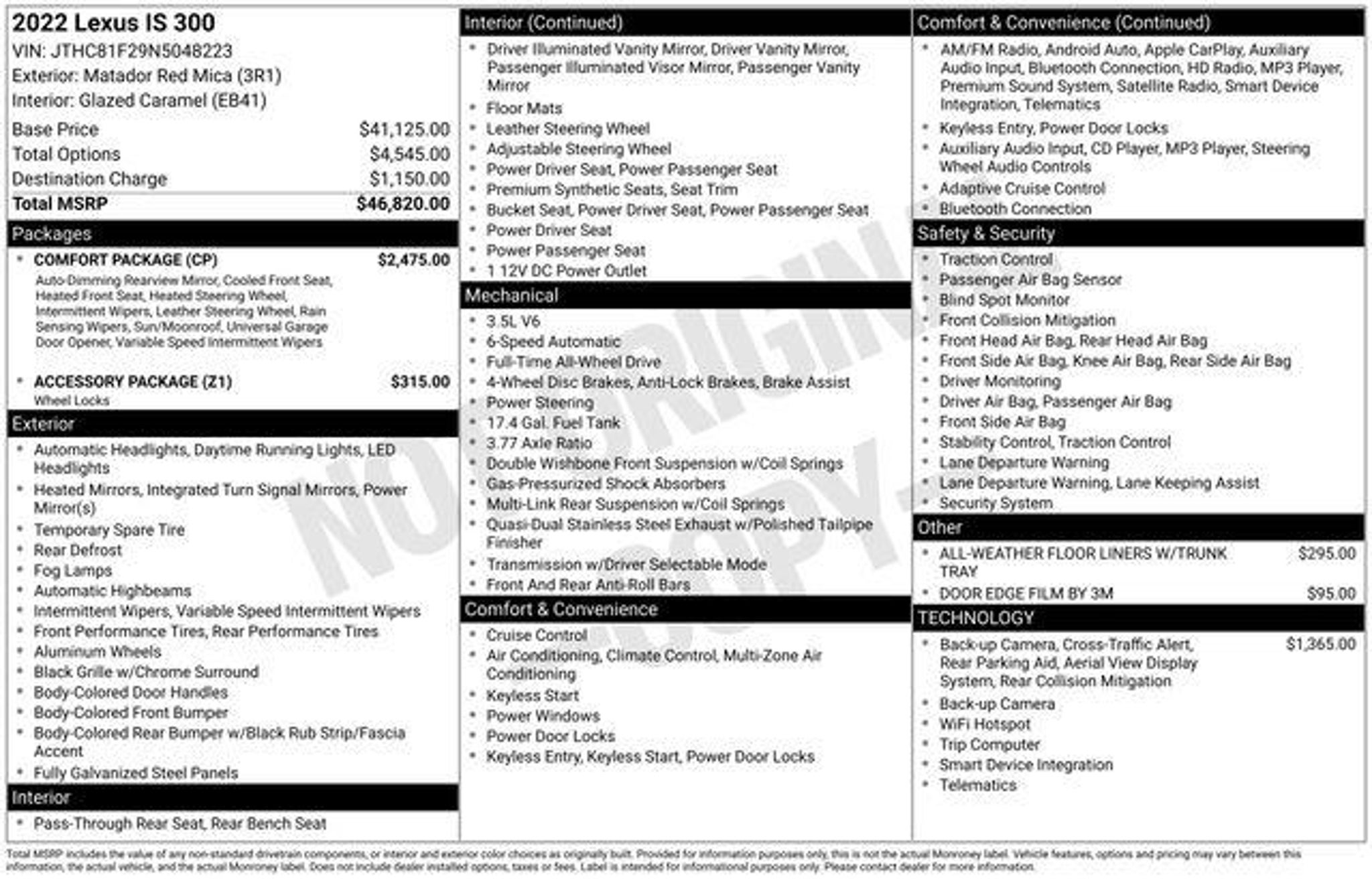 Discover the remarkable 2022 Lexus IS 300 - a driving experience that seamlessly blends sophistication, technology, and uncompromising performance. This stunning vehicle is more than just a car; it's a statement of refined taste and a testament to Lexus' commitment to excellence. Meticulously equipped to elevate your driving pleasure, this IS 300 boasts an impressive array of features: - Comfort Package: Heated leather-trimmed steering wheel, rain-sensing wipers, power moonroof, auto-dimming rearview mirror, and heated and ventilated front seats - Intuitive Park Assist with Panoramic View Monitor: Providing advanced parking assistance and rear cross-traffic braking - Accessory Package: Includes a cargo net, wheel bolt locks, and all-weather floor liners Powered by a potent 3.5L V6 DOHC Dual VVT-i engine and paired with a smooth 6-speed automatic transmission, this all-wheel-drive IS 300 delivers an exhilarating driving experience. With an impressive 19 city / 26 highway MPG, it offers the perfect balance of performance and efficiency. Step inside the luxurious cabin and you'll be greeted by a wealth of premium amenities, including a state-of-the-art multimedia system with an 8-inch color touchscreen, 10 premium speakers, and seamless integration with Apple CarPlay and Android Auto. The NuLuxe-trimmed seats provide exceptional comfort and support, while the power-adjustable driver's seat ensures a personalized fit. Safety is of the utmost importance, and the IS 300 delivers with a comprehensive suite of advanced driver-assistance technologies. Features like the Lexus Enform Safety Connect system, dual front and side impact airbags, and electronic stability control work together to provide a secure and confident driving experience. Elevate your daily commute and weekend adventures with the 2022 Lexus IS 300. This exceptional vehicle is a true testament to Lexus' commitment to craftsmanship, technology, and unparalleled driving dynamics. Experience the difference for yourself â visit our showroom today and discover the exceptional Lexus IS 300.