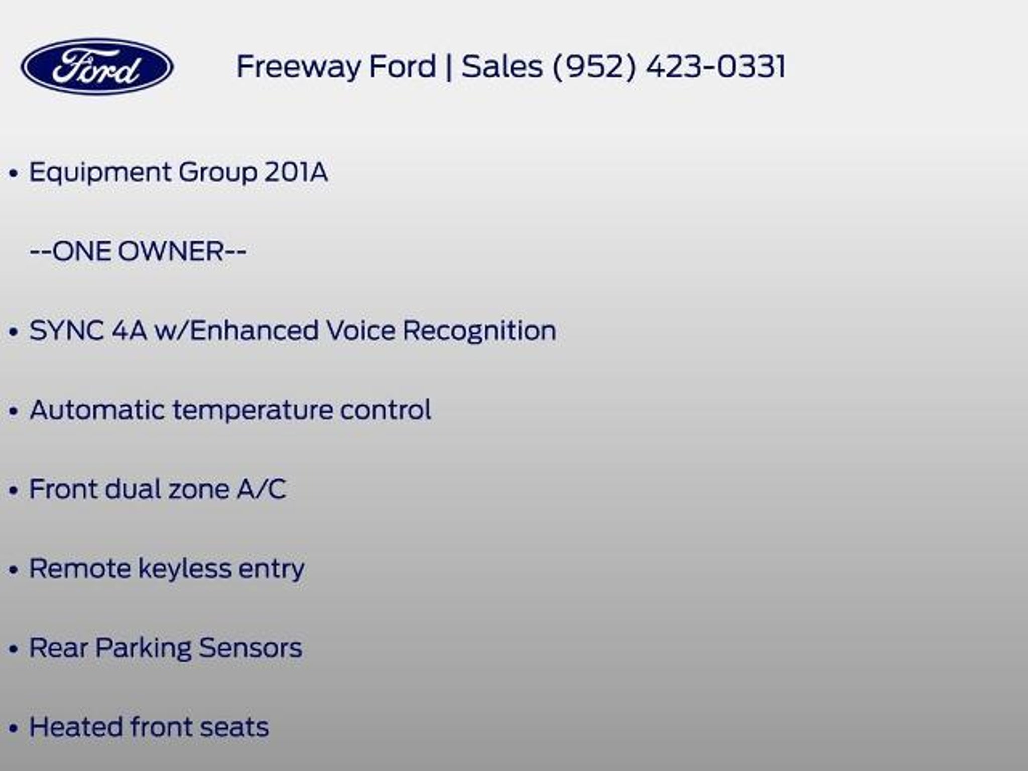 New Price! --ONE OWNER--, Automatic temperature control, Equipment Group 201A, Front dual zone A/C, Heated front seats, Rear Parking Sensors, Remote keyless entry, SYNC 4A w/Enhanced Voice Recognition, Wheels: 18 Sparkle Silver-Painted Aluminum. Certified. Certification Program Details: Ford Blue Advantage: Blue Certified * 139 Point Inspection * Transferable Warranty * Vehicle History * Warranty Deductible: $100 * Roadside Assistance * Limited Warranty: 3 Month/4,000 Mile (whichever comes first) after new car warranty expires or from certified purchase date * and 11,000 FordPass Rewards Points to use toward first maintenance visit 2023 Ford Edge SEL Silver Metallic AWD 8-Speed Automatic EcoBoost 2.0L I4 GTDi DOHC Turbocharged VCT 21/28 City/Highway MPG WHY BUY FROM US: Freeway Ford in MN has a strong and committed sales staff with many years of experience satisfying our customers needs. Freeway Ford is located in the heart of Bloomington, MN. We are about 3 miles from the Mall Of America. We have been providing Quality Care in our sales and servicing of Ford cars and trucks for over 40 years. Please confirm the accuracy of the included equipment by calling us prior to purchase.