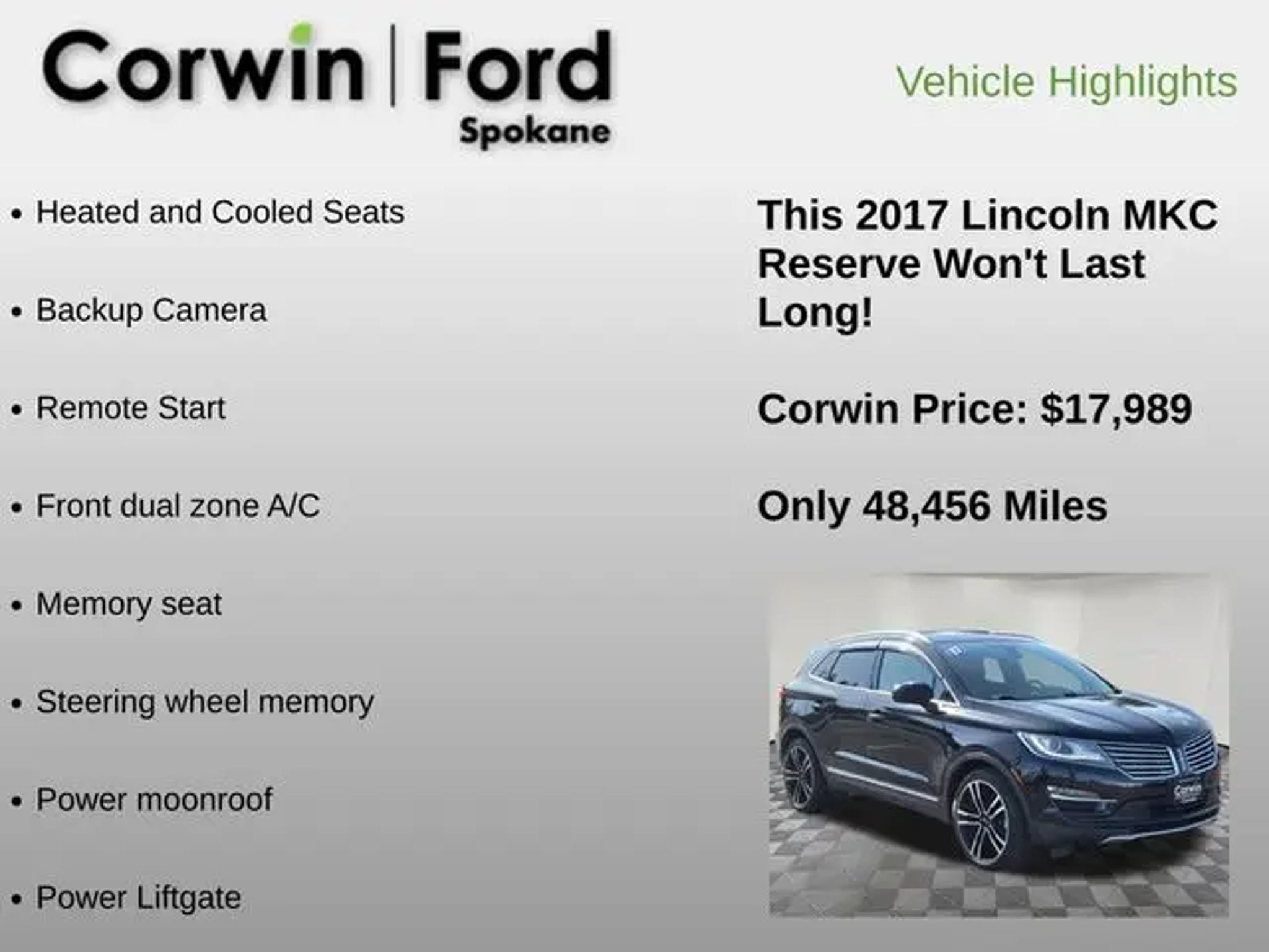 Recent Arrival! Discover excellence behind the wheel of our 2017 Lincoln MKC Reserve AWD presented in Black Velvet! Motivated by a TurboCharged 2.3 Liter 4 Cylinder that puts 285hp at your command with its 6 Speed Automatic transmission. This All Wheel Drive SUV delivers a quiet, serene ride with responsive steering and handling. It's poised and confident and provides nearly 26mpg on the highway. Please note the attractive wheels, chrome dual exhaust tips, and signature lighting on our Lincoln MKC. The hands-free liftgate, privacy glass, roof rack side rails, and approach detection add to the distinction! Our Lincoln MKC Reserve cabin delivers a high level of craftsmanship and attention. Savor the panoramic sunroof and the comfort of heated and cooled leather seats. Indulge yourself with a heated steering wheel, remote start, ambient lighting, active noise control, pushbutton start, and dual-zone automatic climate control. You need to maintain a safe connection. With the Sync 3 touchscreen electronics interface featuring Apple CarPlay®, Android Auto®, voice controls, Navigation, Bluetooth®, and premium audio, you can do just that! Lincoln will keep your family safe with features such as a blind spot information system, stability control, a rearview camera, airbags, and MyKey, allowing parents to set electronic parameters. Offering security, elegance, power, and comfort, our Lincoln MKC Reserve should be at the top of your list! Save this Page and Call for Availability. We Know You Will Enjoy Your Corwin Ford Spokane Test Drive Towards Ownership! See us today at Corwin Ford Spokane. Family owned for over 100 years! Excellent selection of New and Used vehicles, Financing options. Serving Spokane, Pasco, Kennewick, Richland, Walla Walla, Hermiston, Umatilla, Yakima, Sunnyside, Grandview, Dayton, Prescott, Denton County, Franklin County, Yakima County, Spokane County, Adams County, Grant County, and the Greater Columbia Basin. *All Prices plus applicable sales tax, license, and a negotiable documentary service fee up to $200 may be added to sales price or capitalized cost of the vehicle. One vehicle unless otherwise noted and subject to prior sale without notice. While supplies last. EPA mileage estimates are for newly manufactured vehicles only. Your actual mileage will vary depending on how you drive and maintain your vehicle.