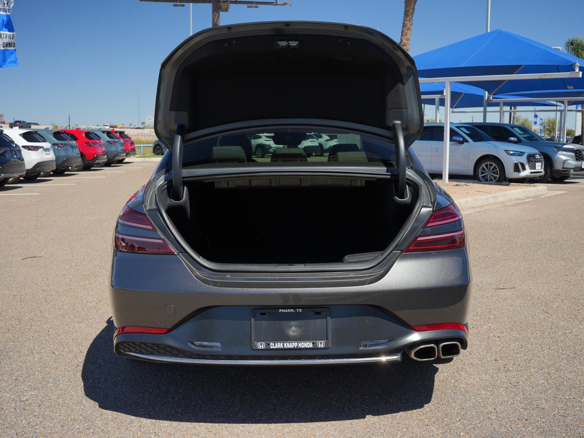 This 2023 GENESIS G70 2.0T|has a exterior and an interior color. 21,925 miles. Stock Number 56328A. You can connect with us by calling .\n \n\n\nNo Accidents! One Owner! \n \n\n OTHER NOTABLE FEATURES AND OPTIONS YOU SHOULD KNOW ABOUT: \n\n Option Group 01 \n\n\n\n Convenience GPS linked cruise control - Set it and forget it. Road trips used to be stressful, until GPS linked cruise control set the pace. Simply set the desired speed and the system uses GPS navigation data to maintain that speed without driver intervention - including slowing down for curves and anticipating hills. This can help minimize driver fatigue and improve overall fuel economy. Meet your ultimate co-pilot; GPS linked cruise control. Safety and Security Forward collision mitigation - Forward thinking. You look away for just a second and suddenly the vehicle in front of you has stopped. That's when the forward collision mitigation system comes to life. When it senses an impending impact, it will activate a combination of features to help prevent or reduce the severity of an accident. Forward collision mitigation is always looking ahead. Pedestrian impact prevention - An extra step toward safety. Pedestrians don't always stop, look, and listen, but with Pedestrian Impact Prevention, your vehicle is equipped to better see them and avoid them. This system constantly monitors the road ahead to identify and track pedestrians. It projects that image to an interior display screen, AND should an impact become likely, Pedestrian impact prevention takes steps to avoid a collision. Hands-on cruise control. Set it and forget it. Road trips used to be stressful. Cruise control only managed speed, but not distance or safety. Now, with hands-on cruise control, simply set your desired speed and let sensor technology maintain a safe distance between you and surrounding vehicles. It slows you down; speeds you up and even keeps you in your own lane. Meet your ultimate co-pilot with hands-on cruise control. Technology and Telematics Smart device mirroring - Smartphone, meet smart car. You can control your device through your vehicle's infotainment system. Smart device mirroring brings together safety and convenience by making it easier to find what you're looking for while keeping your eyes on the road. \n\n \n Cars have been part of the Clark family since 1933 when we opened our first dealership. After building a strong reputation with our family owned and operated business, we have expanded our offerings to include trusted automakers like Honda. Now a 33-year Honda veteran, Clark Knapp Honda is proud to offer friendly service in a beautiful, modern building. This newer and larger facility is home to an express service lane, complimentary Wi-Fi, a kids entertainment zone, and an on-site full-service Allstate insurance agency. Our updated modern facility puts drivers and their families first.