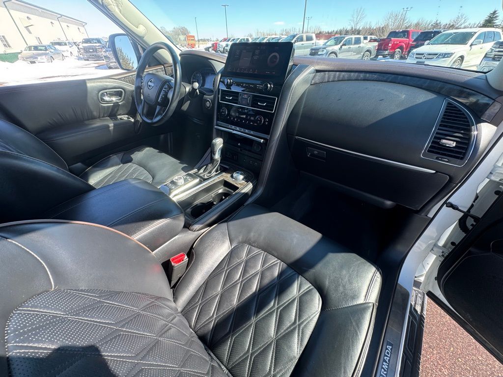 The Armada Platinum's Captain's Chairs Package elevates the interior experience offering seating for 7 with luxurious 2nd-row captain's chairs and a center console with a padded armrest. Bask in the comfort of the navigation system which seamlessly integrates with your smartphone for effortless connectivity.