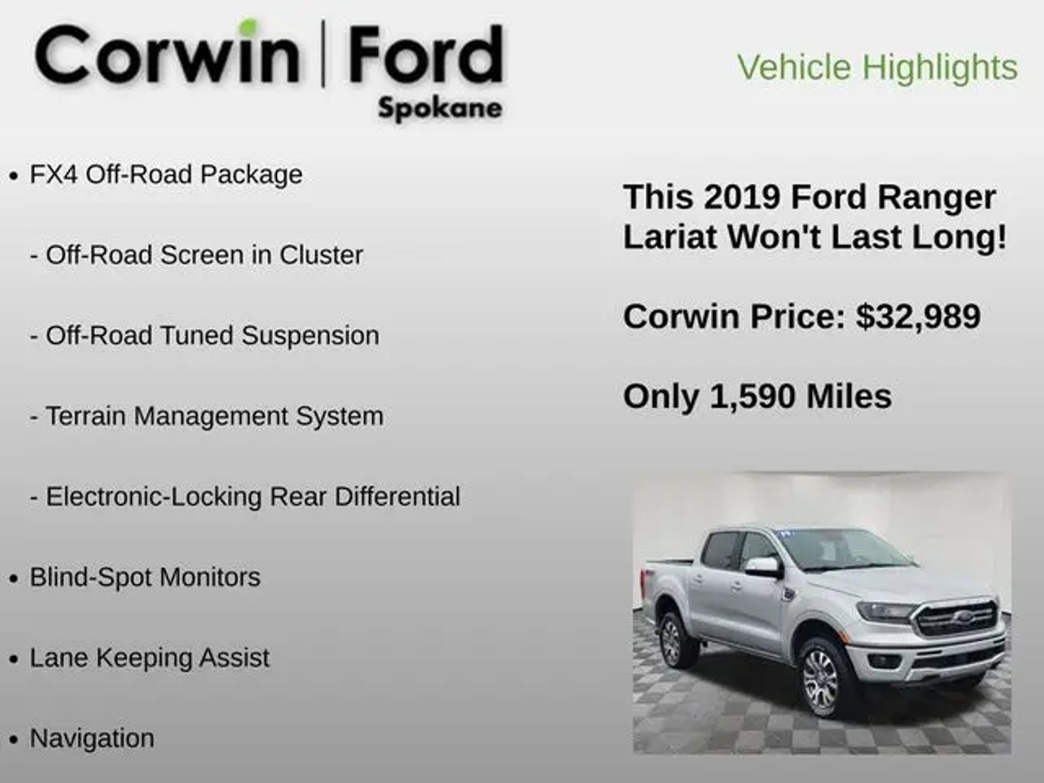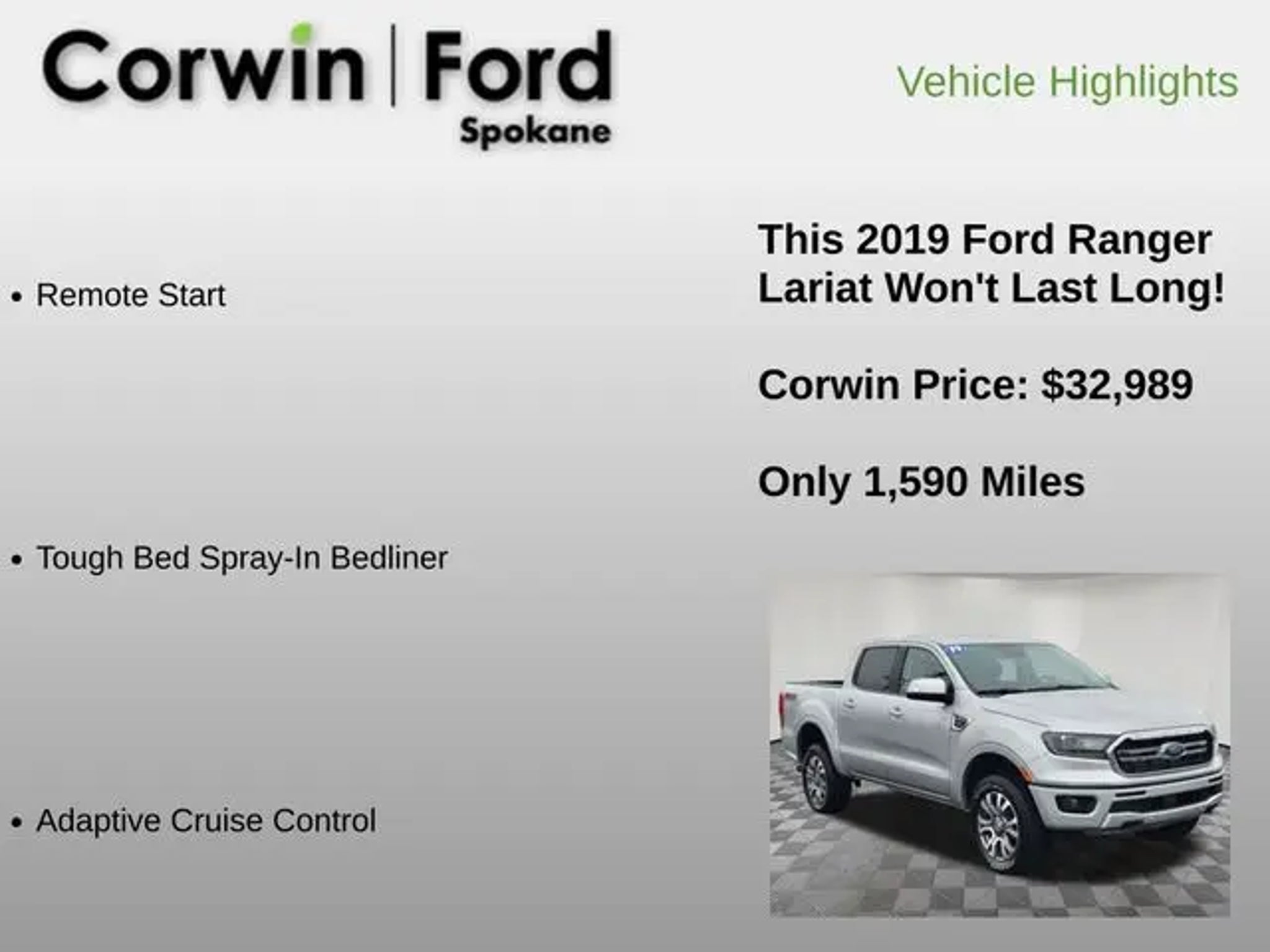 Introducing the 2019 Ford Ranger Lariat, a rugged and capable pickup that's ready to take on any adventure. With its powerful EcoBoost engine, impressive towing capacity, and advanced off-road capabilities, this Ranger is the perfect companion for your active lifestyle. - Blind-Spot Monitors - Lane Keeping Assist - Remote Start - Adaptive Cruise Control - 10-Speaker B&O Sound System - Terrain Management System - Tough Bed Spray-In Bedliner - Trailer Tow Package Beneath its striking silver exterior, this Ranger Lariat is packed with premium features that elevate your driving experience. The FX4 Off-Road Package equips it with the tools to tackle any terrain, from exposed steel bash plates to an off-road-tuned suspension. The Technology Package, meanwhile, keeps you connected and in control with advanced driver-assist features like Adaptive Cruise Control and Navigation. Whether you're hauling gear for your next outdoor adventure or navigating the daily commute, the 2019 Ford Ranger Lariat is up for the challenge. With its impressive fuel efficiency, spacious and well-appointed cabin, and uncompromising capability, this pickup is the perfect blend of work and play. Imagine yourself behind the wheel, effortlessly towing your boat or camper with the Ranger's class-leading towing capacity of up to 7,500 pounds. Envision the convenience of Remote Start, allowing you to warm up the cabin on a chilly morning, or the peace of mind that comes with Blind-Spot Monitors and Lane Keeping Assist. The Ranger Lariat is designed to make every journey more enjoyable and efficient. At our dealership, we're proud to offer this exceptional 2019 Ford Ranger Lariat. With its low mileage and well-equipped interior, it's a true standout in the midsize truck segment. We invite you to experience the Ranger's impressive capabilities for yourself. Schedule a test drive today and let us demonstrate how this versatile pickup can enhance your driving experience. We're confident that the 2019 Ford Ranger Lariat will exceed your expectations. Its blend of power, technology, and off-road prowess make it a compelling choice for those seeking a capable and refined pickup. Visit our showroom and let us show you why the Ranger Lariat is the perfect fit for your lifestyle.
