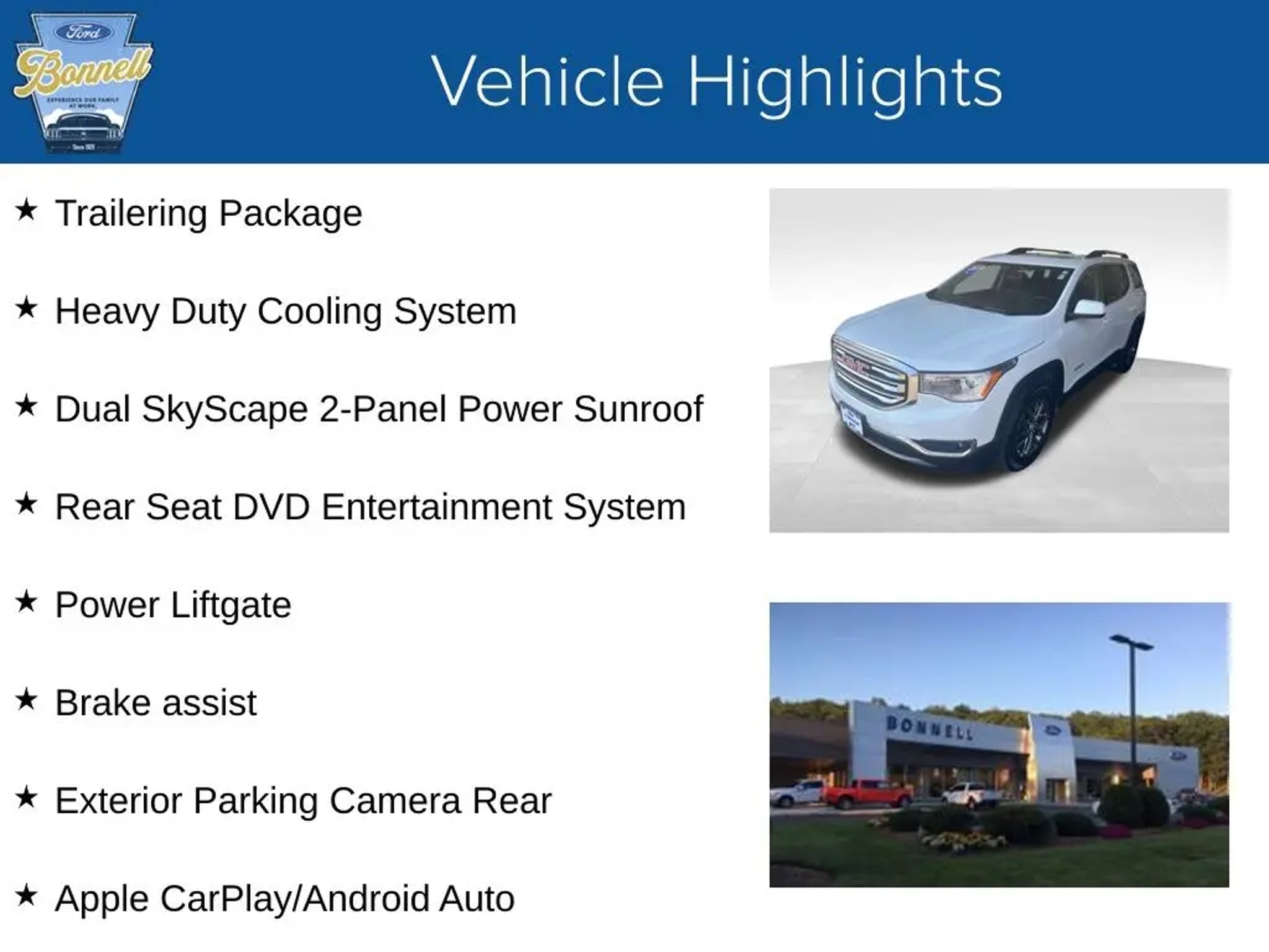 Summit White 2017 GMC Acadia SLT-1 AWD 6-Speed Automatic 3.6L V6 SIDI DOHC VVT AWD, Jet Black Leather, Apple CarPlay/Android Auto, Brake assist, Dual SkyScape 2-Panel Power Sunroof, Exterior Parking Camera Rear, Heated front seats, Heavy Duty Cooling System, Power Liftgate, Rear Seat DVD Entertainment System, Trailering Package. Recent Arrival! Awards: * 2017 IIHS Top Safety Pick with optional front crash prevention * 2017 KBB.com Brand Image Awards Reviews: * Cabin remains quiet and comfortable on long road trips; plenty of engine and interior configurations to fit a variety of uses; attractive exterior and interior styling. Source: Edmunds