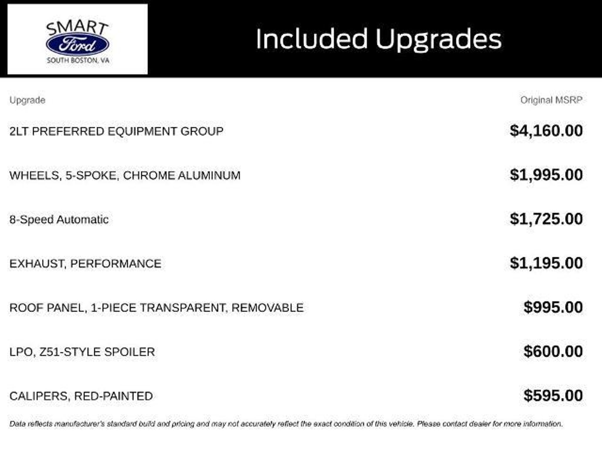 Recent Arrival! Arctic White 2015 Chevrolet Corvette Stingray RWD 6.2L V8 1-Piece Removable Transparent Roof Panel $995.00 Auto-Dimming Inside Frameless Rearview Mirror Body-Color Outside Heated Power-Adjustable Mirrors Luggage Shade Remote Vehicle Starter System Cargo Net Power Lumbar/bolster Seat Adjusters 8-Way Driver and Passenger Seat Adjusters Memory Package Performance Exhaust $1,195.00 Red Painted Calipers $595.00 2.41 Limited-Slip Rear Axle Ratio Z51-Style Spoiler $600.00 Chevrolet MyLink Audio System Mulan Perforated Leather Seating Surfaces GT Bucket Seats 18 X 8.5 Front and 19 X 10 Rear Chrome Aluminum Wheels $1,995.00 P245/40ZR18 Front and P285/35ZR19 Rear Run Flat Tires 8-Speed Paddle Shift Transmission with Auto Modes $1,725.00 Preferred Equipment Group 2LT $4,160.00 Federal Emissions Requirements 6.2L V8 DI Engine Heated and Vented Driver and Passenger Seats Bose Premium 9-Speaker Audio System Feature Painted Body-Color Carbon Fiber Removable Roof Panel 2LT Interior Trim Arctic White Adrenaline Red Head-Up Display Theft Deterrent System Bose Advanced 10-Speaker Audio System Feature Universal Home Remote SiriusXM Satellite Radio You can Fill out a Free Super Quick Pre-Approval Credit Application here! https://www.smartfordsouthboston.com/finance/apply-for-financing/ FINANCING FOR ALL TYPES OF CREDIT! SLOW PAYMENTS, BANKRUPTCY, REPOSESSION, COLLECTIONS, JUDGEMENTS, DIVORCE NO PROBLEM! MONTHLY PAYMENTS TO FIT ANY INCOME! TRADE-INS WELCOME! WE BUY CARS Everyday, Even if you don't buy ours! Prices do not include additional fees and costs of closing, including government fees and taxes, any finance charges, any dealer administrative fees, any emissions testing fees or other fees. All prices, specifications and availability subject to change without notice. Contact dealer for most current information. Memory Package, Preferred Equipment Group 2LT (2LT Interior Trim, Auto-Dimming Inside Frameless Rearview Mirror, Body-Color Outside Heated Power-Adjustable Mirrors, Bose Advanced 10-Speaker Audio System Feature, Cargo Net, Head-Up Display, Heated & Vented Driver & Passenger Seats, Luggage Shade, Power Lumbar/Bolster Seat Adjusters, Theft Deterrent System, and Universal Home Remote), 1-Piece Removable Transparent Roof Panel, 18 x 8.5 Fr & 19 x 10 Rr 5-Spoke Wheels, 18 x 8.5 Fr & 19 x 10 Rr Chrome Alum. Wheels, 2.41 Limited-Slip Rear Axle Ratio, 4-Wheel Disc Brakes, 8-Way Driver & Passenger Seat Adjusters, 9 Speakers, ABS brakes, Air Conditioning, Alloy wheels, AM/FM radio: SiriusXM, Automatic t