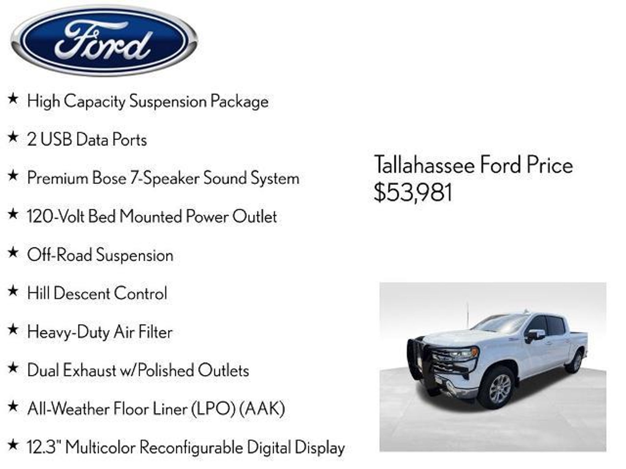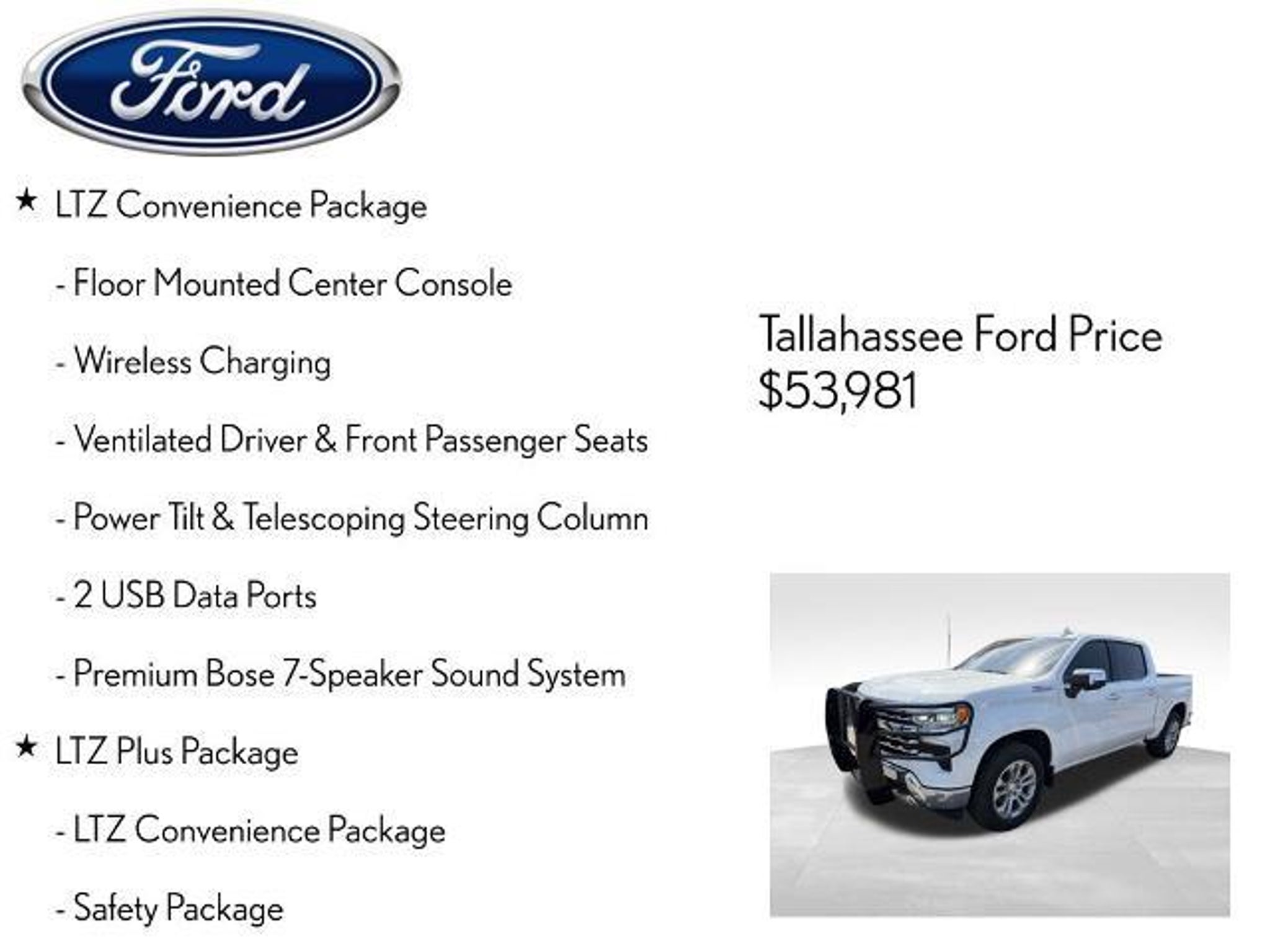 Elevate your driving experience with this exceptional 2024 Chevrolet Silverado 1500 LTZ. This powerful and versatile full-size pickup is designed to exceed your expectations, offering a remarkable blend of performance, capability, and premium features. - 6.2L EcoTec3 V8 engine with Dynamic Fuel Management for optimal power and efficiency - Z71 Off-Road and Protection Package with heavy-duty air filter, skid plates, and all-terrain tires - Active dual-exhaust system with sport-mode enabled - High-Capacity Suspension Package, LTZ Convenience Package, and LTZ Plus Package Indulge in the comfort and convenience of the Silverado LTZ, featuring a premium Bose 7-speaker sound system, a 12.3-inch reconfigurable digital display, and a 120-volt bed-mounted power outlet. Stay connected with the Chevrolet Infotainment 3 Premium system, wireless charging, and Wi-Fi hotspot capability. Experience the ultimate in off-road prowess with the Z71 Off-Road Package, which includes hill descent control, an off-road suspension, and skid plates to conquer any terrain. The Trailering Package and In-Vehicle Trailering System App make towing a breeze, while the Hitch Guidance and Hitch View features provide added confidence. Elevate your driving experience with the Silverado LTZ's advanced safety technologies, including Forward Collision Alert, Lane Keep Assist, Automatic Emergency Braking, and Rear Pedestrian Alert. The Surround Vision system and Rear Cross-Traffic Braking offer added peace of mind. Indulge in the luxurious interior, complete with perforated leather-appointed seats, heated and ventilated front seats, and a heated steering wheel. The power-adjustable driver and passenger seats with memory settings ensure a personalized fit. This 2024 Chevrolet Silverado 1500 LTZ is a true standout in the full-size truck segment, blending exceptional performance, advanced technology, and premium comfort. Experience the difference for yourself by scheduling a test drive today. The listed online price reflects a $1,000 finance incentive and a $1,000 qualifying retail trade-in incentive; absence of either or both incentives will result in an increase of up to $2,000 to the final sale price.