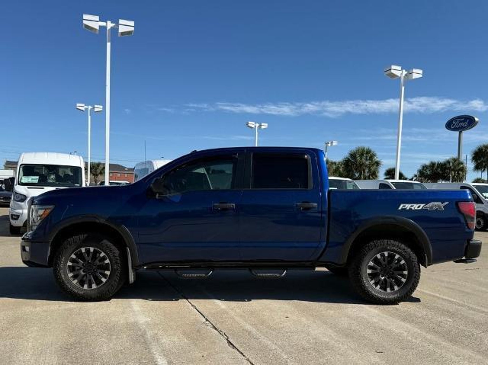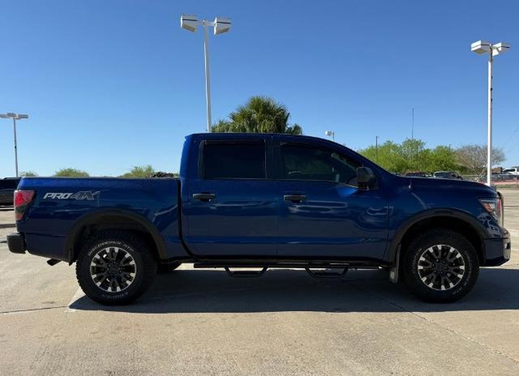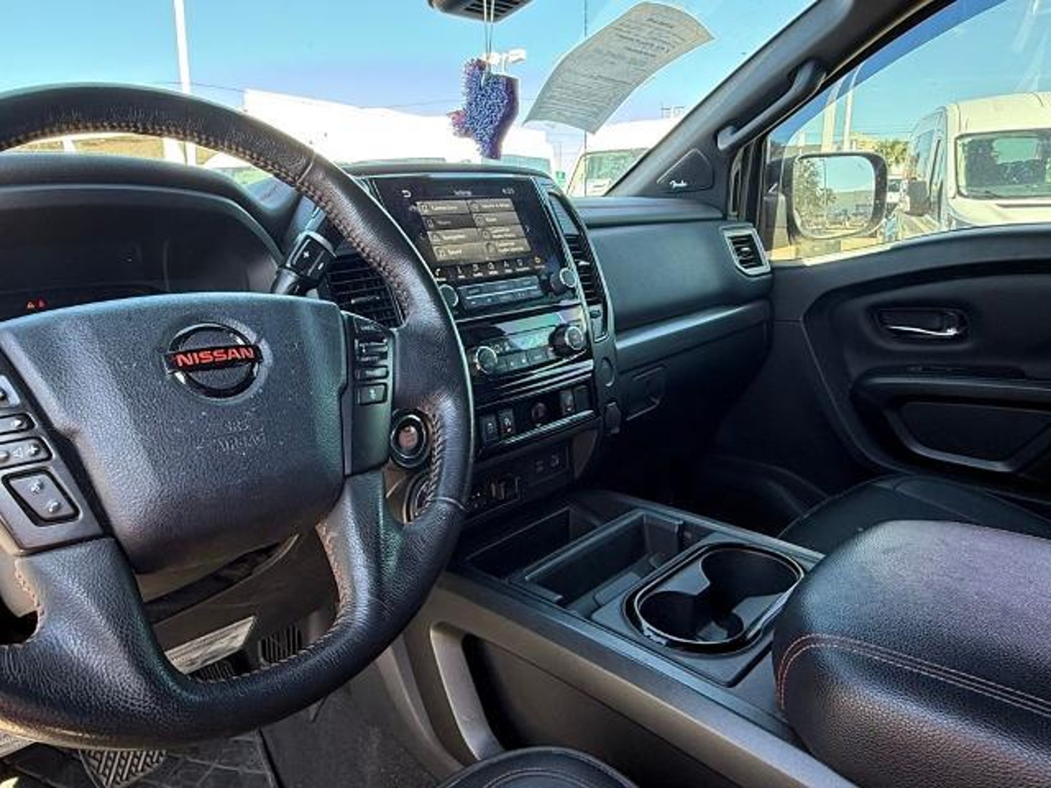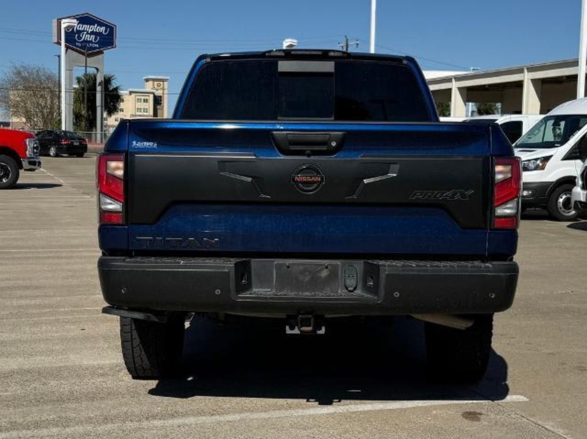 Deep Blue Pearl Metallic 2021 Nissan Titan PRO-4X 4WD 9-Speed Automatic 5.6L V8 DOHC 32V 400hp 4WD. This vehicle comes equipped with the following features and options: PRO-4X Utility Package (Fender Premium Audio System w/12 Speakers and Proximity Activation), 4WD, 3.692 Axle Ratio, 4-Wheel Disc Brakes, 6 Speakers, ABS brakes, Air Conditioning, Alloy wheels, AM/FM radio: SiriusXM, Auto High-beam Headlights, Auto-dimming Rear-View mirror, Auto-leveling suspension, Automatic temperature control, Blind Spot Warning, Brake assist, Cloth Seat Trim w/Vinyl Bolsters, Compass, Delay-off headlights, Driver door bin, Driver vanity mirror, Dual front impact airbags, Dual front side impact airbags, Electronic Stability Control, Emergency communication system: NissanConnect Services, Front anti-roll bar, Front Bucket Seats, Front Captain's Seats, Front Center Armrest, Front dual zone A/C, Front fog lights, Front reading lights, Front wheel independent suspension, Fully automatic headlights, Garage door transmitter: HomeLink, Heated door mirrors, Illuminated entry, Knee airbag, Leather steering wheel, Low tire pressure warning, Navigation system: NissanConnect Navigation, NissanConnect featuring Apple CarPlay and Android Auto, Occupant sensing airbag, Outside temperature display, Overhead airbag, Overhead console, Panic alarm, Passenger door bin, Passenger vanity mirror, Power door mirrors, Power driver seat, Power steering, Power windows, PRO-4X Badged Floor Mats (DISC), Pro4X Mud Flaps, Radio data system, Radio: NissanConnect w/Navigation, Rain sensing wipers, Rear anti-roll bar, Rear Bumper Step w/Electronic Tailgate Lock, Rear Parking Sensors, Rear seat center armrest, Rear Seat Entertainment (DISC), Rear step bumper, Rear window defroster, Remote keyless entry, Security system, Speed control, Speed-sensing steering, Speed-Sensitive Wipers, Split folding rear seat, Steering wheel mounted audio controls, Tachometer, Telescoping steering wheel, Tilt steering wheel, Traction control, Trip computer, Variably intermittent wipers, Voltmeter, and Wheels: 18 x 8 Painted Dark Finish Alloy. Recent Arrival!