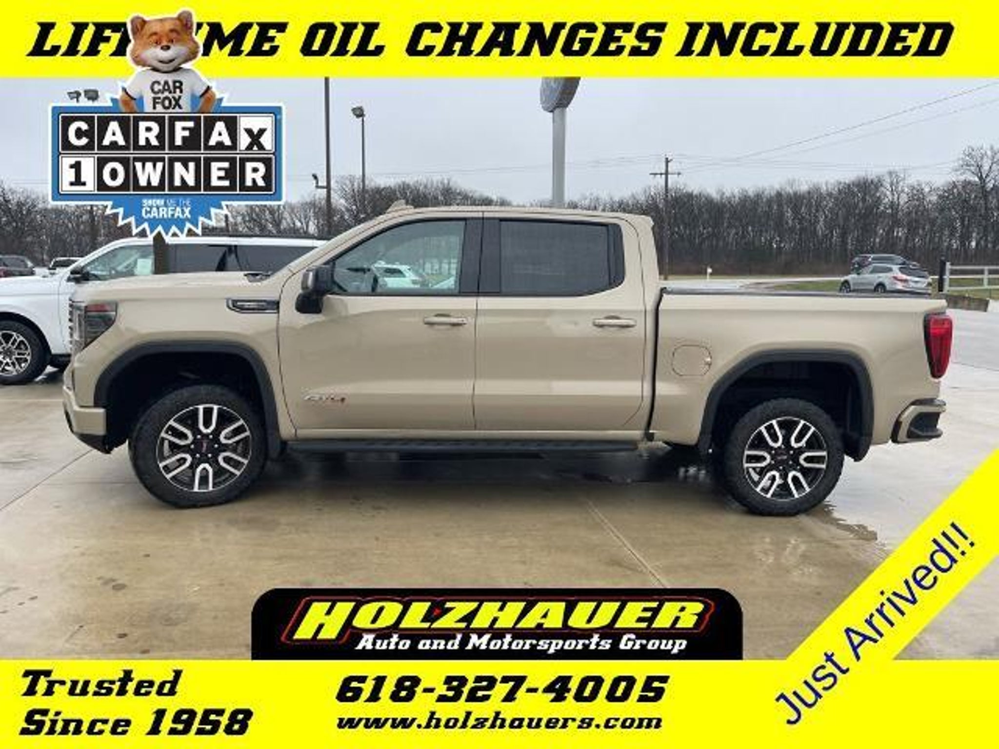 2022 GMC Sierra 1500 AT4 EcoTec3 6.2L V8 4WD Desert Sand Metallic ONE OWNER!!, 10-Way Power Driver Seat Adjuster w/Lumbar, 10-Way Power Passenger Seat Adjuster w/Lumbar, 120-Volt Bed Mounted Power Outlet, 120-Volt Instrument Panel Power Outlet, 220 Amp Alternator, 3.23 Rear Axle Ratio, Adaptive Cruise Control, Apple CarPlay/Android Auto, AT4 CarbonPro Edition, AT4 Preferred Package, AT4 Premium Package, Auto High-beam Headlights, Auto-Locking Rear Differential, Automatic temperature control, Bed View Camera, Black Chrome Header & Grille Insert Bars, Carbon Fiber Composite Bed, CarbonPro Hard Badge, Deep-Tinted Glass, Emergency communication system: OnStar and GMC Connected Services capable, Front dual zone A/C, Front fog lights, Front Prem Floor Liners w/Removable Carpet Insert, Front Rainsensing Wipers, GMC Connected Access Capable, HD Rear Vision Camera, HD Surround Vision, Heated 2nd Row Outboard Seats, Heated Driver & Front Outboard Passenger Seating, Heated Steering Wheel, Heavy-Duty Air Filter, Hill Descent Control, Hitch Guidance, Hitch Guidance w/Hitch View, In-Vehicle Trailering App, Integrated Trailer Brake Controller, Lane Keep Assist w/Lane Departure Warning, LED Cargo Area Lighting, Multicolor 15 Diagonal Head-Up Display, MultiPro Audio System by Kicker (LPO), Navigation System, Off-Road High Clearance Step (LPO), OnStar & GMC Connected Services Capable, Perforated Front Leather Seat Trim, Perimeter Lighting, Power Sliding Rear Window w/Rear Defogger, Power Sunroof, Preferred Equipment Group 4SB, Premium Bose 7-Speaker Sound System, Rain sensing wipers, Rear Camera Mirror, Rear Cross Traffic Braking, Rear Pedestrian Detection, Rear Prem Floor Liners w/Removable Carpet Insert, Rear Wheelhouse Liners, Rear window defroster, Red Recovery Hooks, Remote Vehicle Starter System, Sierra Safety Plus Package, SiriusXM w/360L, Spray-On Pickup Bed Liner w/AT4 Logo, Steering Wheel Audio Controls, Technology Package, Theft Deterrent System (Unauthorized Entry), Trailer Camera Provisions, Trailer Side Blind Zone Alert, Trailering Package, Ultrasonic Front & Rear Park Assist, Universal Home Remote, Ventilated Driver & Front Passenger Seats, Wheels: 20 x 9 Machined Aluminum, Wi-Fi Hotspot Capable, Wireless Charging, Wireless Phone Projection. CARFAX One-Owner. Our incredible selection, our low overhead and low prices simply cannot be matched. Teamed with our friendly small town service you'll see why Holzhauer Auto Group is one of the Midwest's largest and fastest growing dealerships. We dont just compete.
