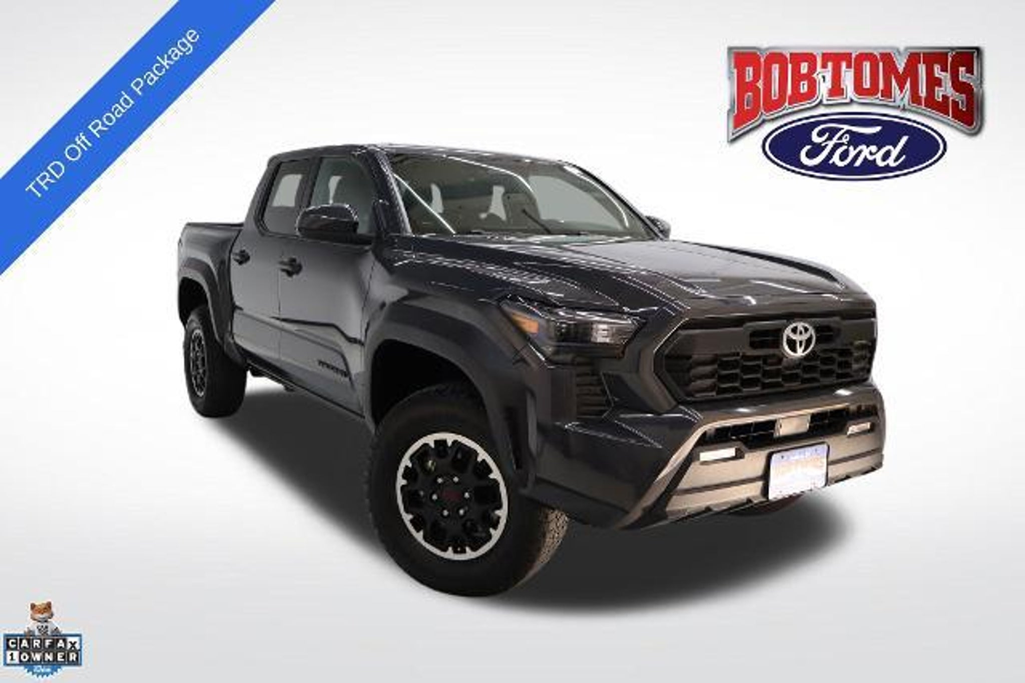 CARFAX One-Owner. Clean CARFAX. 2025 Toyota Tacoma 4D Double Cab TRD Off-Road Black 4WD 2.4L 4-Cylinder 8-Speed Automatic 4WD, TRD Off Road Package. TRD Off Road Package, 4WD, 3.583 Axle Ratio, 4-Wheel Disc Brakes, 6 Speakers, ABS brakes, Air Conditioning, Alloy wheels, AM/FM radio: SiriusXM, Anti-whiplash front head restraints, Apple CarPlay/Android Auto, Auto High-beam Headlights, Auto-dimming Rear-View mirror, Automatic temperature control, Brake assist, Bumpers: body-color, Driver door bin, Driver vanity mirror, Dual fro'nt side impact airbags, Dual front impact airbags, Electronic Stability Control, Emergency communication system: Safety Connect (1-year trial), Exterior Parking Camera Rear, Fabric Seat Trim, Four wheel independent suspension, Front anti-roll bar, Front Bucket Seats, Front Center Armrest, Front fog lights, Front reading lights, Fully automatic headlights, Heated door mirrors, Illuminated entry, Knee airbag, Leather Shift Knob, Leather steering wheel, Low tire pressure warning, Occupant sensing airbag, Outside temperature display, Overhead airbag, Overhead console, Panic alarm, Passenger door bin, Passenger vanity mirror, Power door mirrors, Power steering, Power windows, Radio: 8 Toyota Audio Multimedia, Rear step bumper, Rear window defroster, Remote keyless entry, Security system, Speed control, Speed-sensing steering, Steering wheel mounted audio controls, Tachometer, Telescoping steering wheel, Telescoping steering wheel, Tilt steering wheel, Traction control, Trip computer, Turn signal indicator mirrors, Variably intermittent wipers, and Wheels: 17 TRD Off-Road Alloy. Ford cars and trucks cost less in McKinney. Take that short drive up 75 to Bob Tomes Ford. Thank you for making your way to Bob Tomes Ford, your certified Ford dealer serving drivers throughout McKinney, Prosper, Frisco, Plano, Anna, Garland, Melissa, Fairview, Van Alstyne, Sherman, Celina, Denton, Lucas, Dennison, Bonham, Dallas, Blue Ridge, Richardson, Howe, Princeton, Gunter, Farmersville, Trenton, Murphy, Sachse, Wylie, Parker, Lavon and the surrounding areas. At our dealership, youâll find a solid selection of new Fords for sale, as well as a carefully inspected lineup of pre-owned vehicles. We also have a well-connected finance center run by a qualified team of finance experts, who can help you get the right loan or lease in a quick, easy, and transparent manner.