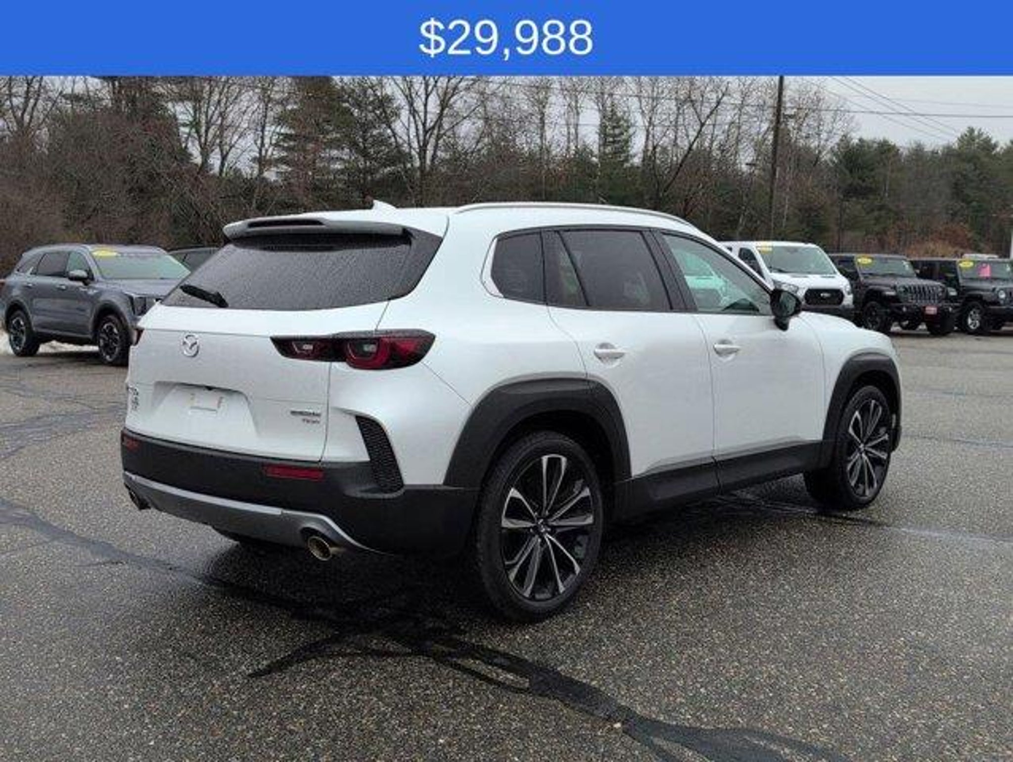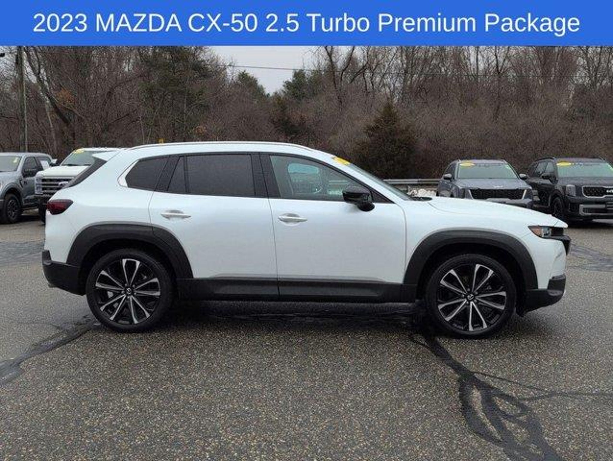 Discover the ultimate driving experience with the 2023 Mazda CX-50 2.5 Turbo Premium Package. This stunning SUV combines exceptional performance, advanced technology, and unparalleled style, making it the perfect companion for your adventurous lifestyle.Boasting a clean CARFAX history and a striking White exterior, this CX-50 is a true head-turner. Powered by a potent 2.5L I4 Turbocharged engine, this all-wheel-drive SUV delivers an exhilarating 227 horsepower, ensuring effortless acceleration and confident handling on any terrain. With an impressive 29 MPG on the highway, this CX-50 offers exceptional fuel efficiency, allowing you to explore the open road with confidence.- LOCAL TRADE- CLEAN CARFAX- WIND CHILL PEARL PAINT CHARGE- CARGO PACKAGE (Cargo Net, Cargo Blocks)- CARPET CARGO MAT- Heads-Up Display- Memory seat- Power driver seat- Power moonroof- Power Liftgate- AppLink/Apple CarPlay and Android Auto- 20 x 8J Aluminum Alloy WheelsStep inside the CX-50 and experience the epitome of modern luxury. Sink into the heated and ventilated leather-trimmed seats, where you'll enjoy the convenience of power adjustability and memory settings. The expansive moonroof floods the cabin with natural light, creating a truly airy and inviting atmosphere.The CX-50's advanced technology features keep you connected and in control. The Heads-Up Display projects vital information directly into your line of sight, allowing you to stay focused on the road. With Apple CarPlay and Android Auto integration, you can seamlessly access your favorite apps, music, and navigation right from the intuitive touchscreen display.Versatility is at the heart of the CX-50, with a spacious cargo area and a power liftgate for effortless loading and unloading. The Cargo Package, complete with a cargo net and blocks, ensures your belongings are securely stowed, no matter the adventure.Discover the perfect blend of performance, technology, and style with the 2023 Mazda CX-50 2.5 Turbo Premium Package. Experience the difference for yourself by scheduling a test drive at our dealership today. We're confident you'll be captivated by the exceptional driving dynamics and premium features that make this SUV a true standout in its class.