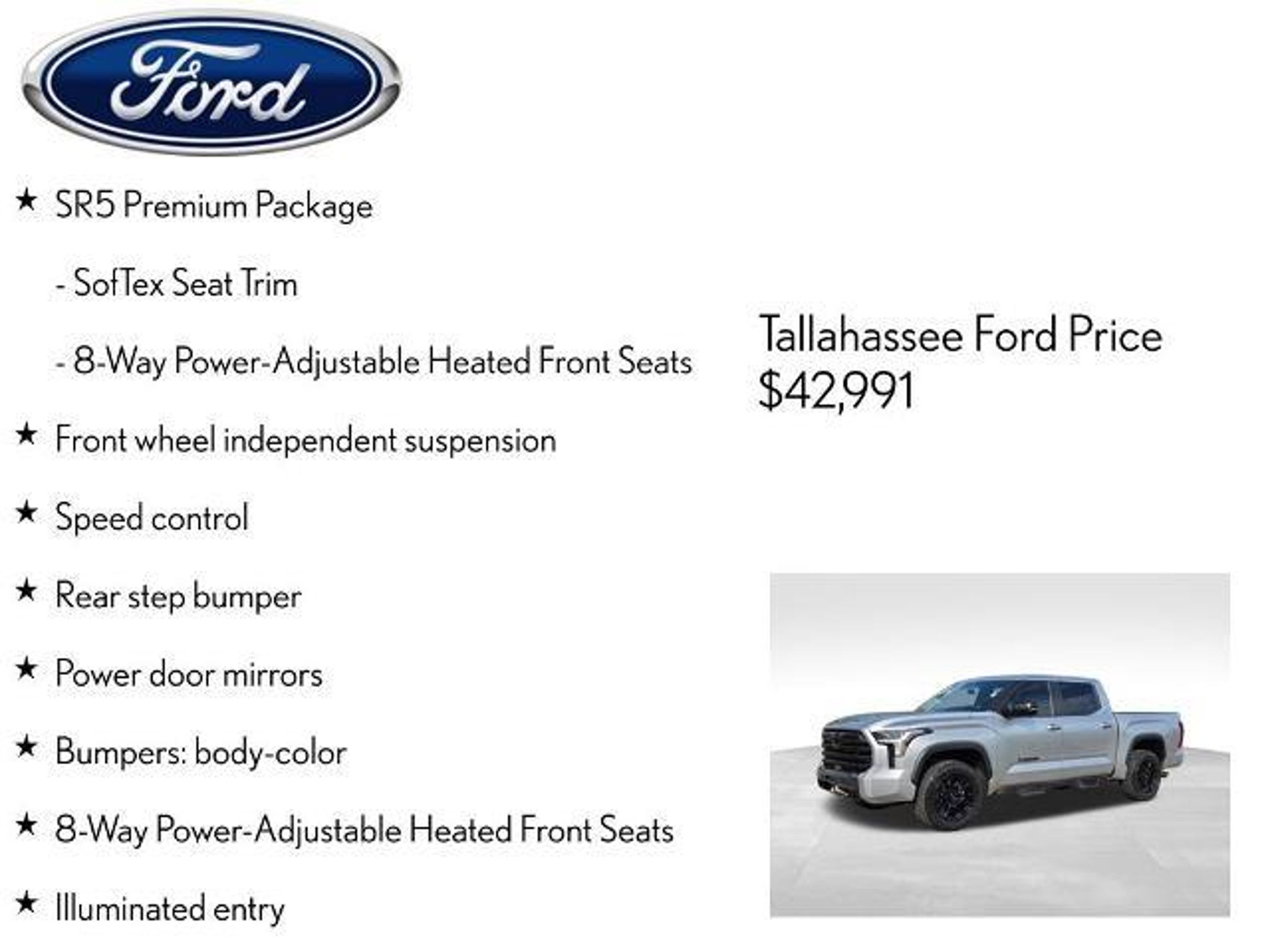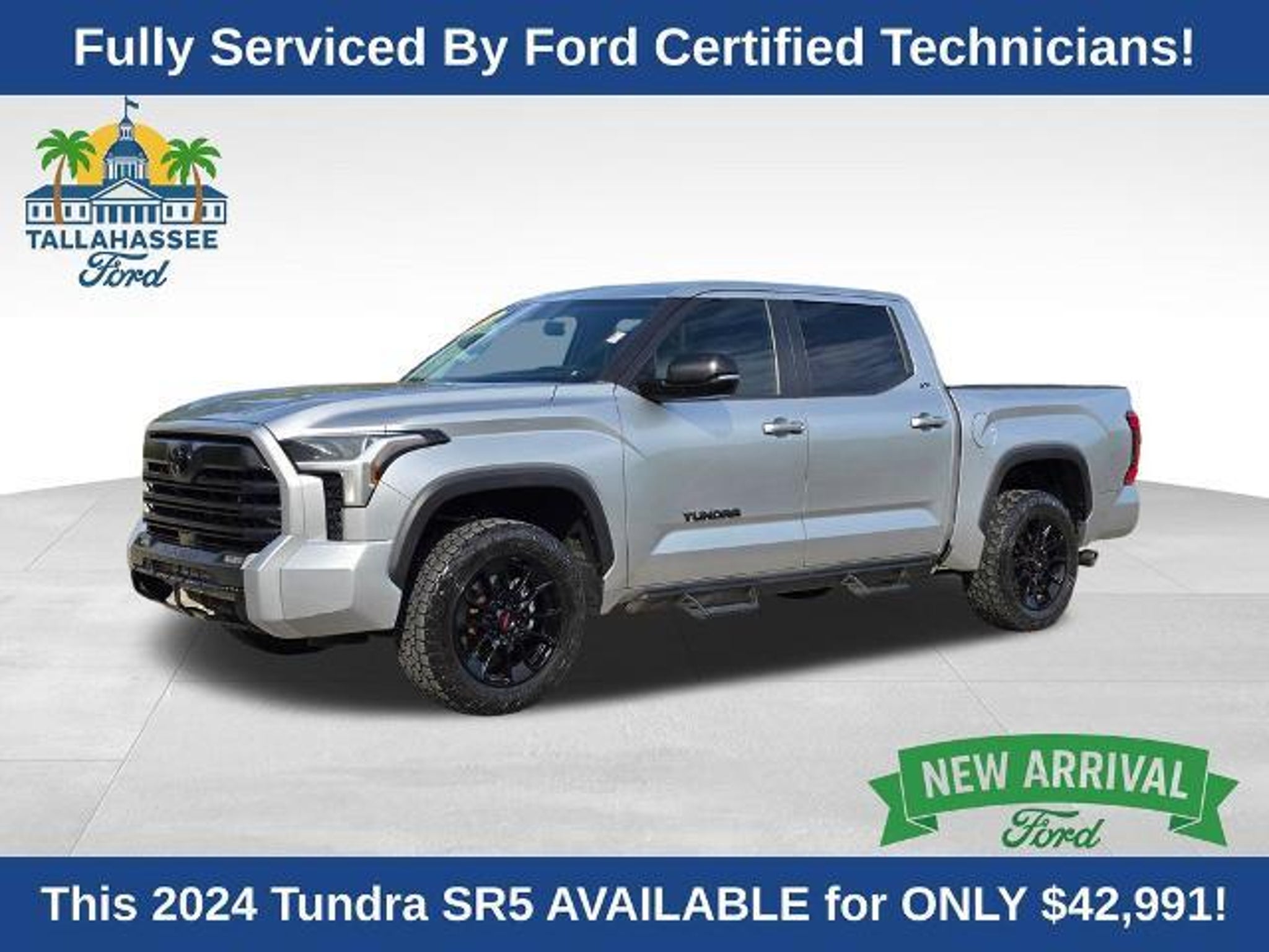 Discover the impressive 2024 Toyota Tundra SR5, a rugged and versatile pickup that's ready to take on any adventure. With its powerful 3.4L V6 engine, 10-speed automatic transmission, and 4WD capabilities, this Tundra is built to conquer the toughest terrain. - SR5 Premium Package: Dual-zone automatic climate control, color-keyed outer door handles, 8-way power-adjustable heated front seats, and 2-way power-adjustable lumbar support - SR5 Convenience Package: Blind Spot Monitor with Lane Change Assist, 32-gallon fuel tank, and Parking Support Alert/Brake - Heated leather steering wheel - Heated power black outside mirrors with LED turn signals and Blind Spot Monitor The Tundra SR5 also boasts a host of impressive features, including front wheel independent suspension, speed control, body-color bumpers, power door mirrors, and a rear step bumper. Inside, you'll find 8-way power-adjustable heated front seats, Apple CarPlay/Android Auto, illuminated entry, overhead console, and SofTex seat trim. Plus, with 18-inch alloy wheels and a 3.31 axle ratio, this truck is ready to take on any task with style and capability. Safety is a top priority in the Tundra SR5, with features like 9 speakers, SiriusXM radio, automatic temperature control, power windows, remote keyless entry, and a suite of advanced airbags and safety systems. The Exterior Parking Camera Rear and Auto High-beam Headlights add an extra layer of confidence and convenience. Whether you're hauling heavy loads, navigating rough terrain, or simply enjoying the open road, the 2024 Toyota Tundra SR5 is the perfect companion. Experience the power, versatility, and premium features that make this truck a true standout in its class. The listed online price reflects a $1,000 finance incentive and a $1,000 qualifying retail trade-in incentive; absence of either or both incentives will result in an increase of up to $2,000 to the final sale price.