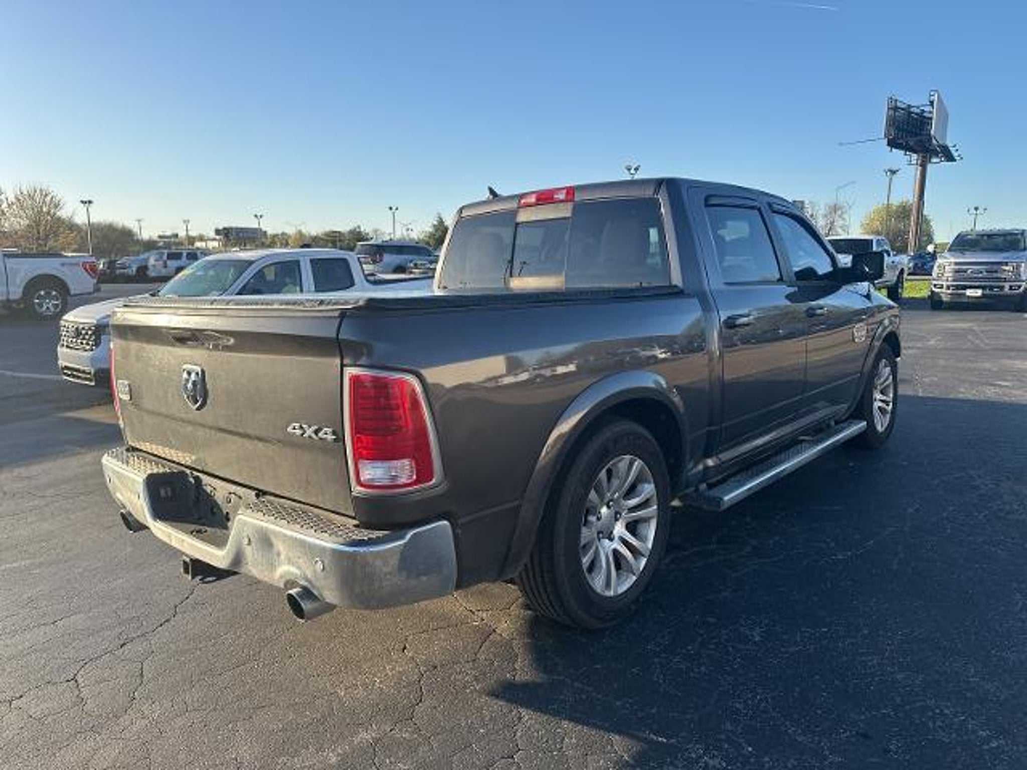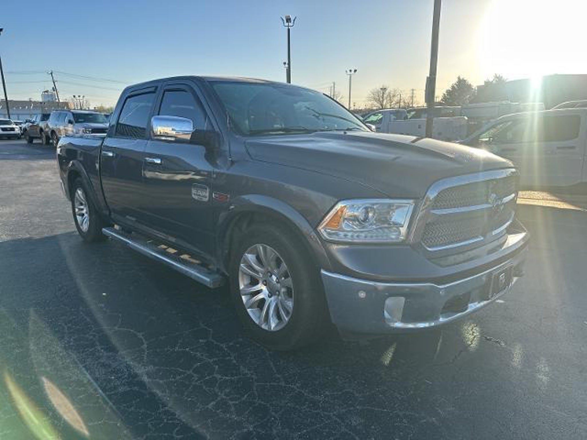 2014 Ram 1500 Laramie Longhorn 1500 Laramie Longhorn, 4D Crew Cab, EcoDiesel 3.0L V6, 8-Speed Automatic, 4WD, 10 Speakers, 115V Auxiliary Power Outlet, 20 x 9 Aluminum Polished/Gold Inserts Wheels, 3.21 Rear Axle Ratio, 4-Wheel Disc Brakes, ABS brakes, Adjustable pedals, Air Conditioning, Alloy wheels, AM/FM radio, Audio memory, Auto-dimming door mirrors, Auto-dimming Rear-View mirror, Automatic temperature control, Brake assist, Bucket Seats, Center Hub, Compass, Cruise Control, Delay-off headlights, Driver door bin, Driver vanity mirror, Dual front impact airbags, Dual front side impact airbags, Electronic Stability Control, Emergency communication system, Folding Flat Load Floor Storage, Front anti-roll bar, Front Bucket Seats, Front Center Armrest w/Storage, Front dual zone A/C, Front fog lights, Front reading lights, Front wheel independent suspension, Fully automatic headlights, Garage door transmitter, Genuine wood dashboard insert, Genuine wood door panel insert, Heated and Cooled Seats, Heated door mirrors, Heated Front Seats, Heated rear seats, Heated Second Row Seats, Heated Steering Wheel, Heated steering wheel, High Back Seats, Illuminated entry, Leather Shift Knob, Leather steering wheel, Low tire pressure warning, Memory seat, Navigation System, Occupant sensing airbag, Outside temperature display, Overhead airbag, Overhead console, Panic alarm, ParkView Rear Back-Up Camera, Passenger door bin, Passenger vanity mirror, Pedal memory, Power 10-Way Memory Driver & 6-Way Passenger Seats, Power door mirrors, Power driver seat, Power Lumbar Adjust, Power passenger seat, Power steering, Power windows, Premium Filigree Leather Seats, Radio data system, Radio: Uconnect 8.4AN AM/FM/SXM/HD/BT/NAV, Rear 60/40 Split Folding Seat, Rear anti-roll bar, Rear seat center armrest, Rear step bumper, Remote keyless entry, Security system, Split folding rear seat, Steering Wheel Mounted Audio Controls, Steering wheel mounted audio controls, Tachometer, Tilt steering wheel, Traction control, Trip computer, Turn signal indicator mirrors, Variably intermittent wipers, Ventilated Front Seats, Ventilated front seats, Voltmeter, (Must finance with Ford Motor Credit to receive online pricing - see dealer for details.) Proudly, 1500 Laramie Longhorn, 4D Crew Cab, EcoDiesel 3.0L V6, 8-Speed Automatic, 4WD. Granite Crystal Metallic Clearcoat 8-Speed Automatic