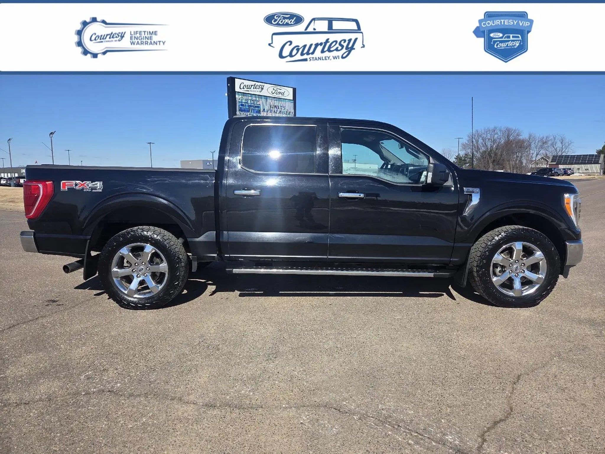 this Agate Black Metallic 2021 Ford F-150 XLT would be a welcomed addition to your family/business. Reach out to us at and reference this stock #15207T. No Accidents! One Owner! Why Buy From Courtesy Auto & Truck Center, Inc. Member Pricing representspremium quality of service toThe customer. With all premium,economy, and utility brands thecustomer has a guarantee theyCan lean on."¢ Custom vehicle ordering and delivery"¢ Service pick-up and drop-off"¢ Mobile service vehicle"¢ Rewards program for service"¢ Loaners $19.95 per day New Vehicles (under factory warranty)Lifetime engine limited warranty*. 1-Year Zurich Shield® limited warranty. Courtesy Certified (under 85,000 miles)Lifetime Engine Limited Warranty 1-Year Zurich Shield® Limited Warranty Courtesy Certified (85,001-100,000 miles) 1-Year Zurich Shield® Limited Warranty *Some exclusions apply. This Limited Warranty does not provide coverage if your vehicle:A. Is equipped to plow snow, whether or not the plow blade is attached to your vehicle.B. Is used for commercial hauling, delivery, or limousine service.C. Is used for hauling or towing in excess of the manufacturer's limitations and specifications.D. Is used for rental, racing, speed contest or other competiton, police car, security vehicle, emergency vehicle, shuttle service, taxi or commercial towing.E. Has been declared a total loss or has been inssued a salvaged or branded title. *needs to be less that 5 years old and under 80k miles. All internally lubricated parts contained within the engine block and cylinder head(s). Cylinder head, engine block, and rotor housings when damaged as a result of the failure of a covered internally lubricated part. Coolant, fluids, lubricants, and filters when required in connection with the repair and replacement of a covered part. Important Package Information XLT Chrome Appearance Package Chrome Door and Tailgate Handles with Body-Color Bezel 2-Bar Style Grille with Chrome 2 Minor Bars Chrome Single-Tip Exhaust FX4 Off-Road Package Trailer Tow Package ($1,090 value) Class IV Trailer Hitch Receiver Integrated Trailer Brake Controller Pro Trailer Backup Assist Equipment Group 302A High ($3,730 value) Electronic 10-Speed Automatic Transmission Onboard 400W Outlet SYNC 4 with Enhanced Voice Recognition Class IV Trailer Hitch Receiver Remote Start System with Remote Tailgate Release LED Sideview Mirror Spotlights LED Box Lighting with Zone Lighting 8 Productivity Screen in Instrument Cluster Dual Zone Automatic Temperature Control Heated Front Seats LED Reflector Headlamps Leather-Wrapped Steering Wheel Intelligent Access with Push Button Start 10-Way Power Driver and Passenger Seats Rear Under-Seat Storage Safety and Security The vehicle is equipped with a system that senses, and then prepares, the vehicle and/or occupants, for an impending forward collision. The vehicle constantly monitors the roadway in front of the vehicle and identifies and tracks pedestrians on an interior display. If the system determines a likely impact, it will automatically take preventative steps to avoid hitting the pedestrian. Technology and Telematics Without the need for a manufacturer specific app to be installed on the smart device, the vehicle infotainment system can access and control functions of a smart device physically plugged-into the vehicle. AppLink/Apple CarPlay and Android Auto smart device wireless mirroring AppLink/Apple CarPlay/Android Auto smart device wireless mirroring Our Dealership We look forward to doing business with you! Give us a call at and schedule a test drive. We are located at 409 Junction Avenue Stanley WI 54768.