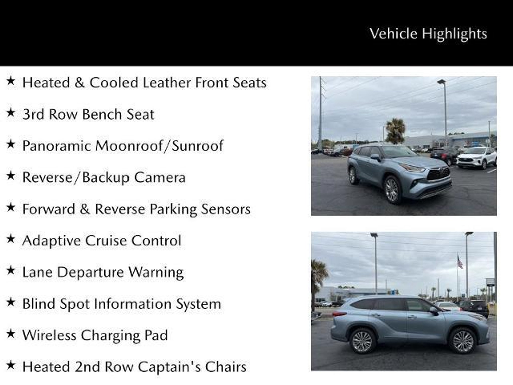 Efficiency, luxury, and advanced technology come together in this 2023 Toyota Highlander Hybrid Platinum, VIN 5TDFARAH6PS523384, with 57,189 miles. As the top-tier trim in the Highlander lineup, the Platinum model blends refined comfort with impressive hybrid efficiency and family-friendly versatility. Inside, the cabin is designed with premium materials and thoughtful features throughout. Heated and ventilated leather front seats provide year-round comfort, while heated second-row captainâs chairs offer a more upscale experience for passengers. A third-row bench seat adds flexibility for additional passengers when needed. Overhead, the panoramic moonroof brings natural light into the cabin, creating a bright and open atmosphere. Technology is a major highlight with a 12-inch touchscreen paired with a 12-inch digital gauge cluster, giving the driver a modern and highly functional interface. A 10-inch head-up display projects key driving information onto the windshield, helping you keep your eyes on the road. The JBL premium audio system with 11 speakers delivers rich sound quality, while wireless device charging keeps compatible devices powered without cables. Convenience features include a hands-free power liftgate for easier loading and power-folding mirrors that help in tight parking situations. The panoramic view monitor provides a 360-degree perspective around the vehicle to assist with parking and maneuvering. On the outside, 20-inch wheels, adaptive LED headlamps, and LED fog lamps enhance both styling and visibility, giving the Highlander a confident, upscale presence. Combining hybrid efficiency, premium comfort, and advanced technology, this Highlander Hybrid Platinum delivers a refined three-row SUV experience built for everyday driving and long family trips alike. ***ONE PREVIOUS OWNER*** Heated & Cooled Leather Front Seats, Heated 2nd Row Captain's Chairs, 3rd Row Bench Seat, Panoramic Moonroof/Sunroof, Reverse/Backup Camera, Forward & Reverse Parking Sensors, Adaptive Cruise Control, Lane Departure Warning, Blind Spot Information System, Wireless Charging Pad, 172 Point Inspection completed by our Factory Certified & ASC Trained Technicians, Recent Oil Change, Vehicle Detailed, Panoramic View Monitor, JBL Premium Audio w/11 Speakers, Heated Leather Steering Wheel, Hands-Free Power Liftgate, 10 Heads-Up Display, Heated PowerFold Side Mirrors w/Puddle Lamps, Adaptive LED Headlamps w/High Beam Assist & LED Fog Lamps, Pre-Collision System w/Pedestrian Detection, Road Sign Assist