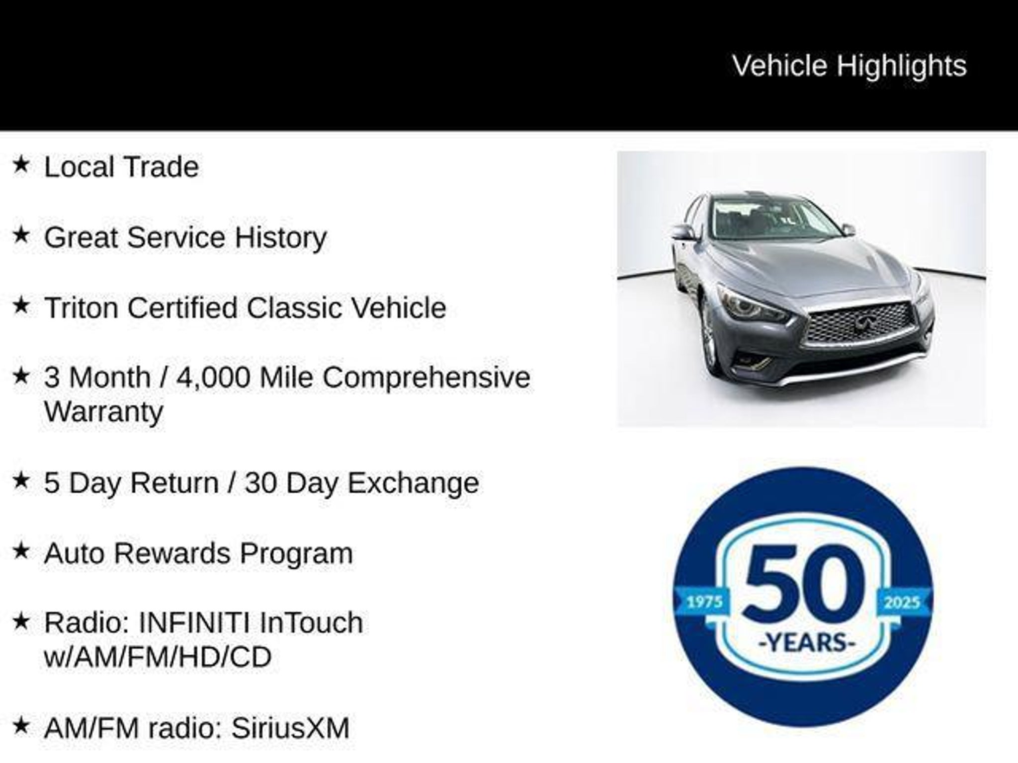Discover the perfect blend of luxury and performance in this stunning 2022 INFINITI Q50 LUXE. With its sleek gray exterior and powerful 3.0L V6 engine, this all-wheel-drive sedan is ready to elevate your driving experience. - Local Trade - Great Service History - Triton Certified Classic Vehicle - 3 Month / 4,000 Mile Comprehensive Warranty - 5 Day Return / 30 Day Exchange - Auto Rewards Program - Cargo Package - Rear USB Charging Ports - AM/FM radio: SiriusXM - Radio: INFINITI InTouch w/AM/FM/HD/CD - Automatic temperature control - Front dual zone A/C - Memory seat - Power driver seat - Steering wheel mounted audio controls - Power moonroof - Blind Spot Warning - Auto High-beam Headlights This Q50 LUXE is more than just a beautiful car "“ it's a true testament to INFINITI's commitment to craftsmanship and innovation. With its long list of premium features, including leather seating, a heated steering wheel, and a stunning power moonroof, this vehicle is designed to provide you with an unparalleled driving experience. But what sets this Q50 apart is its Triton Certified Classic Vehicle status. This means it has undergone a rigorous inspection and reconditioning process, ensuring that it meets the highest standards of quality and reliability. You can drive with confidence, knowing that this vehicle has been meticulously cared for and is ready to provide you with years of exceptional performance. Whether you're commuting to the office or embarking on a weekend getaway, the 2022 INFINITI Q50 LUXE is the perfect companion. With its impressive fuel efficiency, advanced safety technologies, and refined interior, this sedan is the embodiment of luxury and capability. Experience the difference for yourself. Visit our showroom today and let us demonstrate how this exceptional Q50 LUXE can elevate your driving experience. We're confident that once you take it for a test drive, you'll be captivated by its uncompromising quality and undeniable appeal.