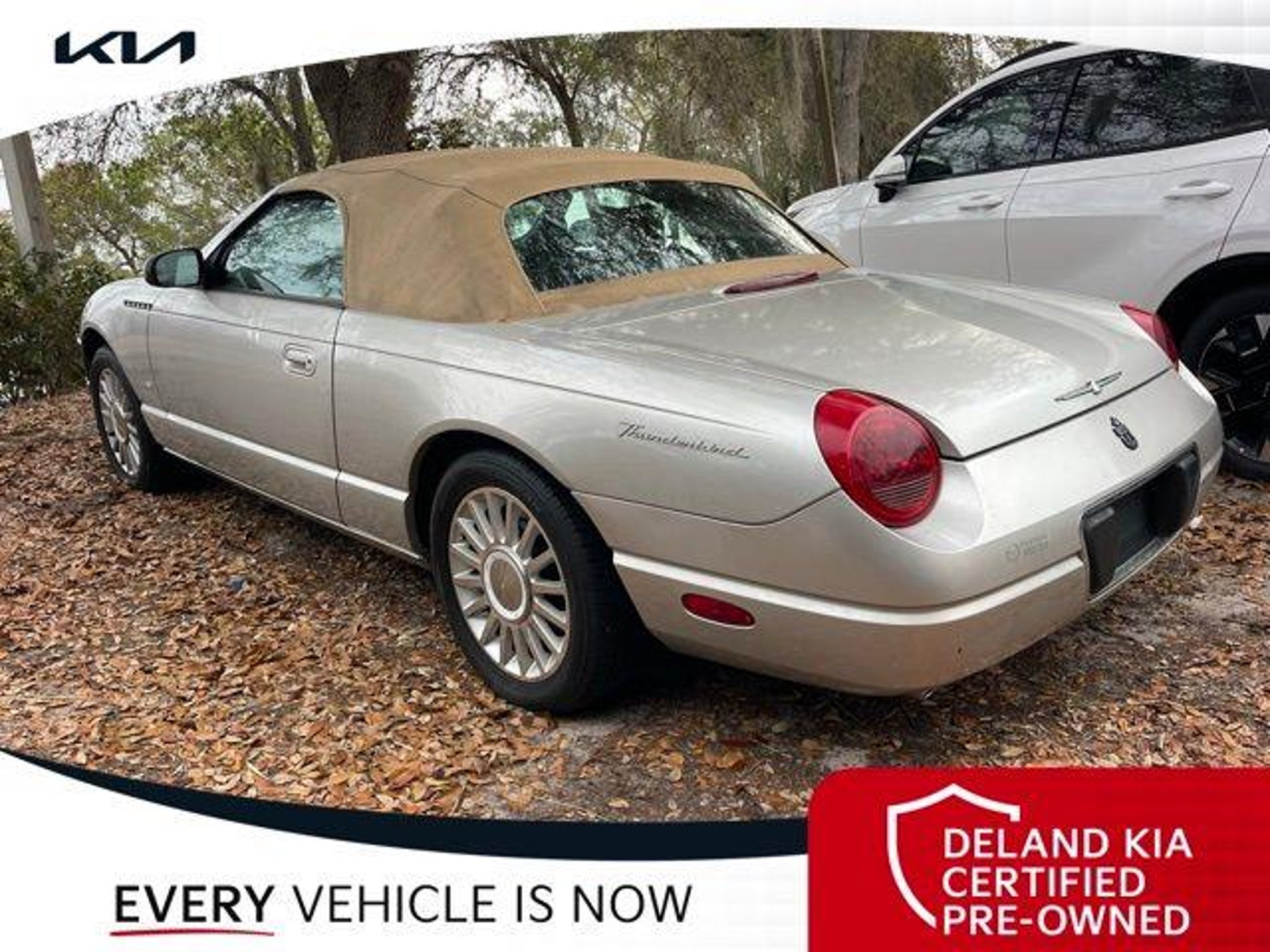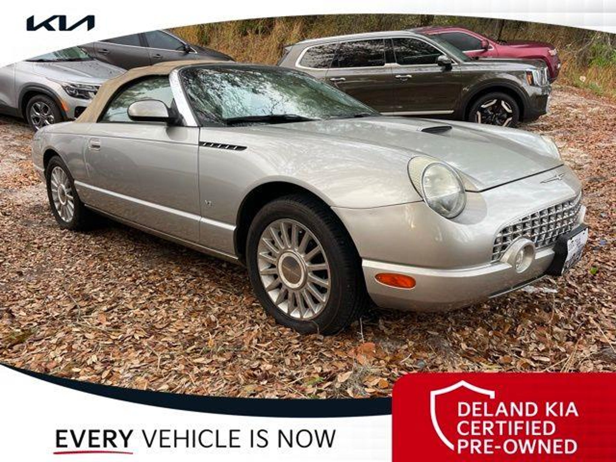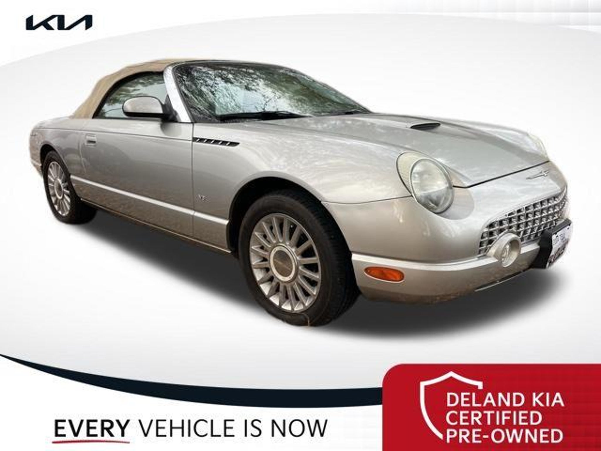 Discover the timeless allure of the 2004 Ford Thunderbird Base Convertible. Only 26K miles! This captivating roadster combines classic style with modern amenities, offering an unparalleled driving experience that will ignite your senses. Boasting a striking Silver exterior, this Thunderbird is equipped with a host of premium features that elevate your driving pleasure: - 0 MONEY DOWN AVAILABLE*** - LIFETIME OIL CHANGES - Light Sand Leather interior - Front dual zone A/C - Power driver seat - Remote keyless entry - Steering wheel mounted audio controls - Dual front side impact airbags - Power convertible roof - Power passenger seat - Alloy wheels Under the hood, the 3.9L V8 DOHC 32V engine paired with a 5-Speed Automatic transmission delivers exhilarating performance, while the rear-wheel-drive configuration ensures responsive handling and control. With an impressive fuel economy of 17 city/23 highway MPG, this Thunderbird strikes the perfect balance between power and efficiency. Immerse yourself in the premium Audiophile sound system, complete with an in-dash 6-CD changer, as you cruise down the open road. The automatic temperature control and rear window defroster ensure your comfort, no matter the weather. Safety is also a top priority, with features like ABS brakes, dual front impact airbags, and a security system providing you with peace of mind. Elevate your driving experience with the timeless elegance and modern conveniences of the 2004 Ford Thunderbird Base Convertible. This captivating roadster is waiting to take you on unforgettable adventures. Visit our showroom today and discover the true essence of driving pleasure. Deland Kia, We're Closer Than You Think!!!! Se habla Espanol!