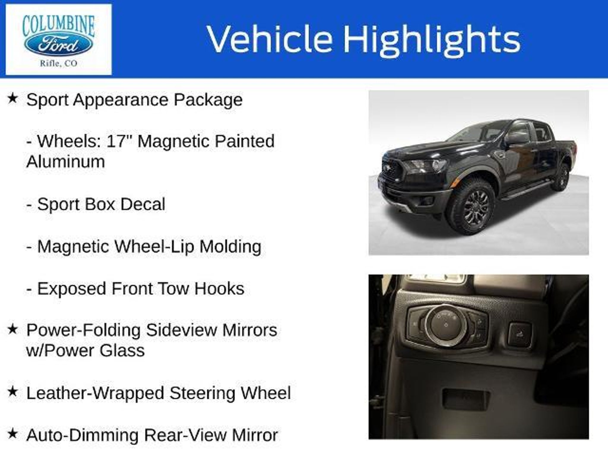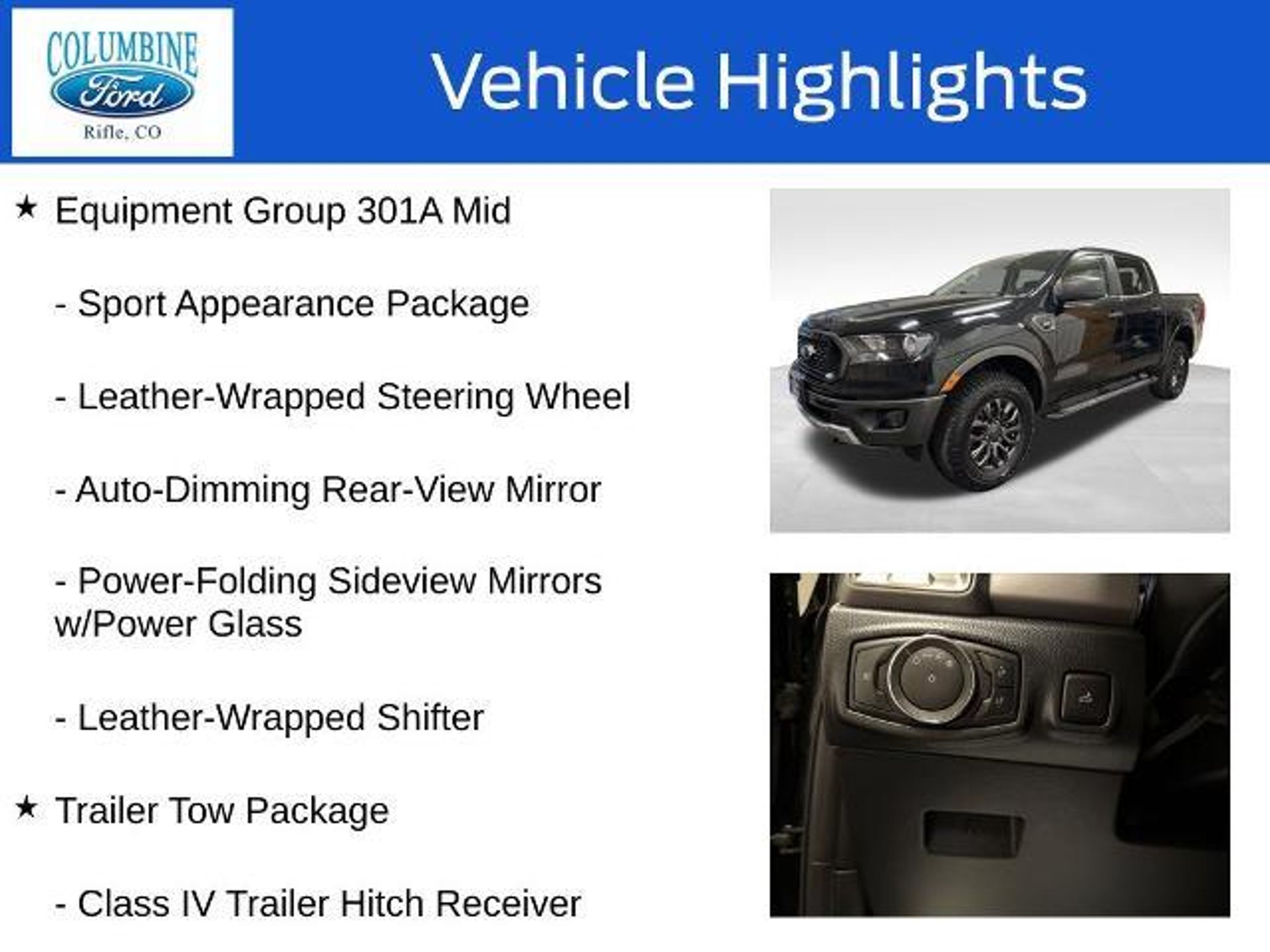 Bargain Corral!!! Welcome to our Bargain Corral Program, where value and transparency come standard. At Columbine Ford, we know our communities need reliable, affordable vehicles?especially those with a little extra mileage or a few more years behind them. Instead of fully reconditioning these solid pre-owned vehicles (and pricing them out of reach) or wholesaling them to dealers who sell them without disclosure, we offer them as-is, clearly inspected, and competitively priced. Any vehicle over 10 years old or 100,000 miles typically qualifies. Take advantage of exceptional savings and drive home a well-loved vehicle with plenty of life left to give! - Sport Appearance Package - Trailer Tow Package - Power-Folding Sideview Mirrors w/Power Glass - Auto-Dimming Rear-View Mirror - Leather-Wrapped Shifter - Leather-Wrapped Steering Wheel - Class IV Trailer Hitch Receiver This 2020 Ford Ranger XLT is a rugged and capable off-road companion, ready to take you on your next adventure. Equipped with the EcoBoost 2.3L I4 GTDi DOHC Turbocharged VCT engine and 4-wheel drive, this Ranger delivers impressive power and performance. The FX4 Off-Road Package adds even more capability, with features like an exposed steel bash plate, off-road-tuned suspension, and an electronic-locking rear differential. Beyond its impressive performance, this Ranger also offers a host of premium features that elevate the driving experience. The Sport Appearance Package gives the exterior a bold, sporty look, while the Trailer Tow Package ensures you can confidently haul your gear. Inside, you'll enjoy the convenience of power-folding side mirrors, an auto-dimming rearview mirror, and a leather-wrapped steering wheel and shifter. Whether you're tackling rugged terrain or navigating the daily commute, this 2020 Ford Ranger XLT is a versatile and well-equipped companion. With its blend of capability, comfort, and convenience, it's the perfect choice for those who demand more from their truck. At Columbine Ford, we're proud to be Western Colorado's most trusted dealership and a multi-year recipient of Ford's prestigious President's Award for exceptional customer satisfaction. Our team is committed to honesty, transparency, and delivering a hassle-free buying experience on every visit. Whether you're shopping new or pre-owned, you'll find unbeatable service, western Colorado's largest selection of vehicles, competitive pricing, and a dealership that truly cares. Visit us at 2828 Railroad Ave., Rifle, CO 81650 or call 970-625-1680. Exper