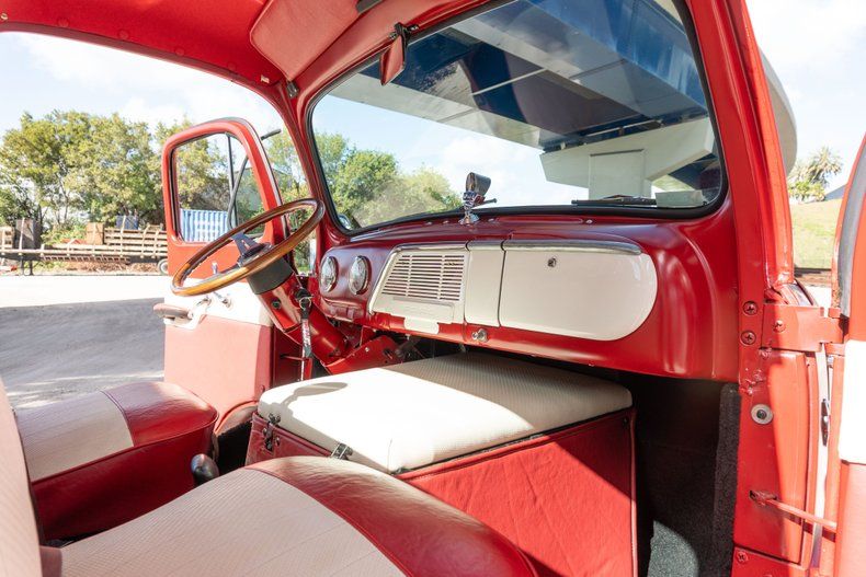 This custom pickup was built using a 1948 Ford F-6 COE cab and a custom-fabricated pickup bed mounted on a newer frame. Power comes from a 460ci V8 linked to a three-speed automatic transmission and a Dana 60 rear end, and highlights include 16" alloy wheels, front disc brakes, and a stepside cargo bed with a storage box. Inside, red and white upholstery is joined by a Nardi steering wheel on a tilt column in addition to Dolphin gauges. Work performed in late 2024 has involved adding an electric fuel pump and replacing the carburetor, fuel tank, and dual exhaust system.
