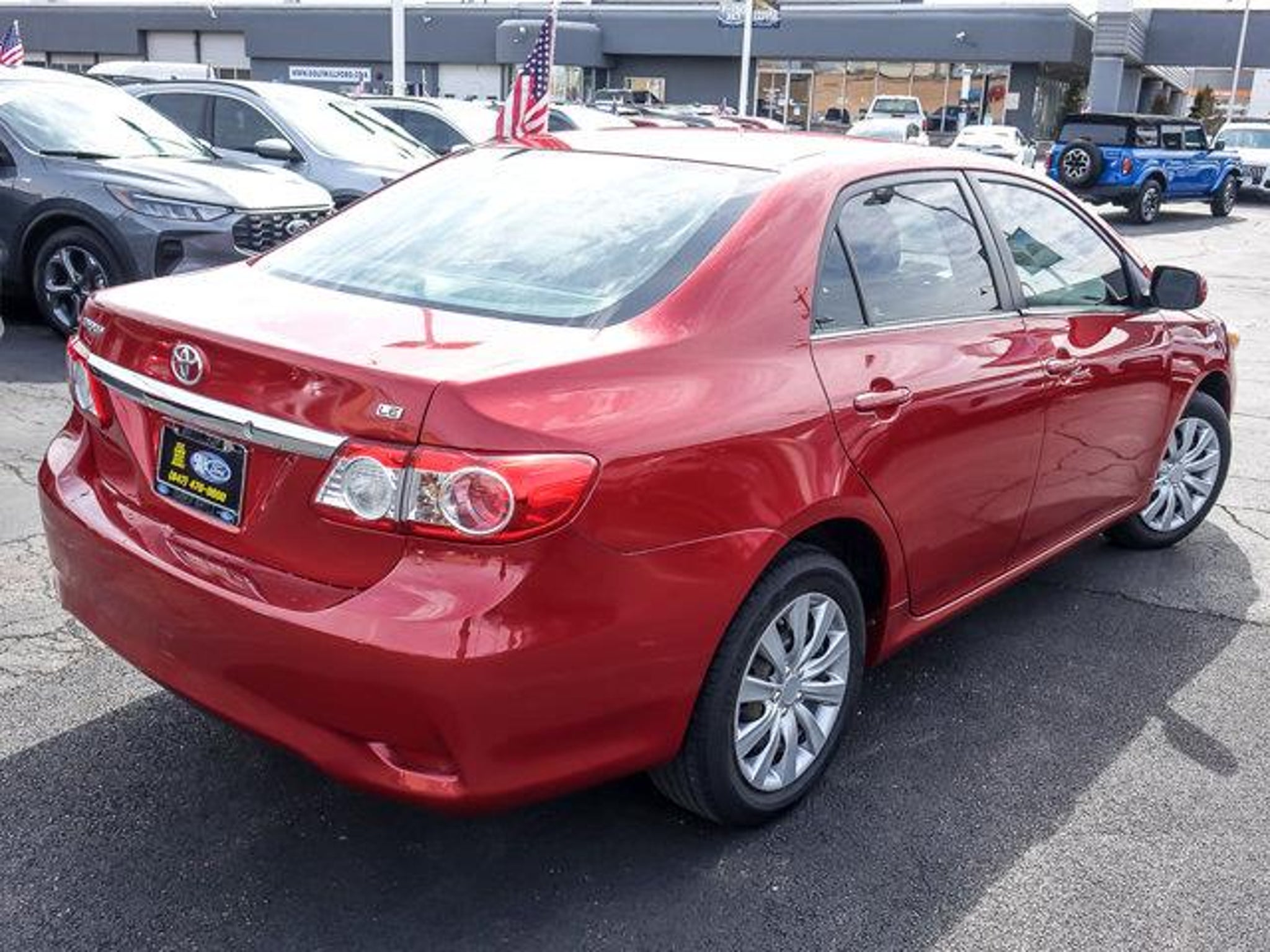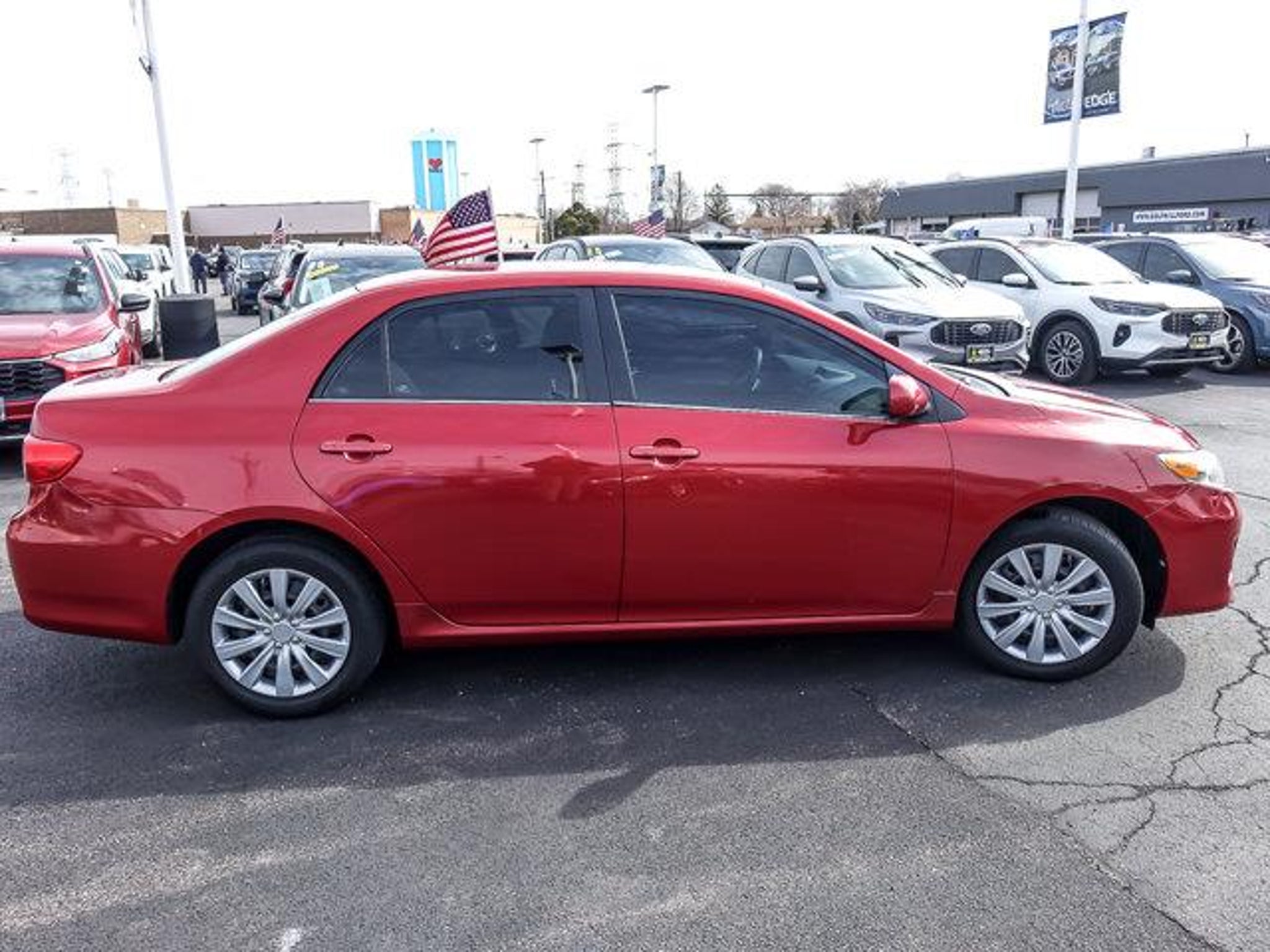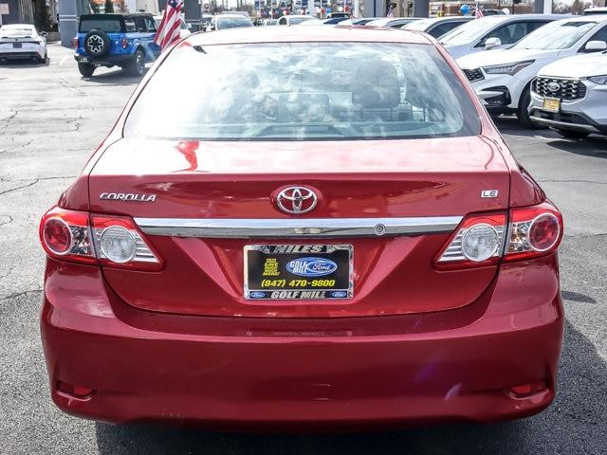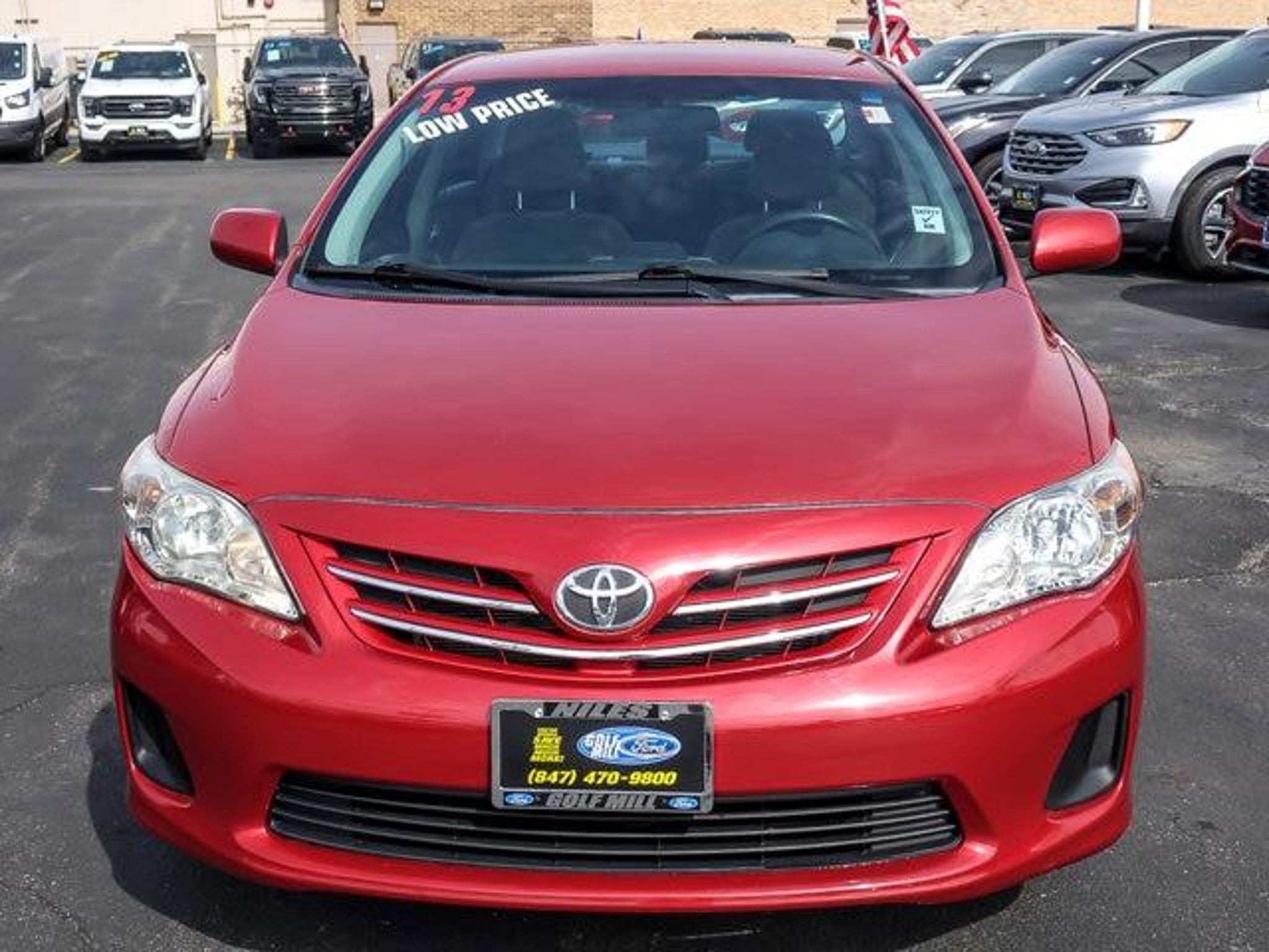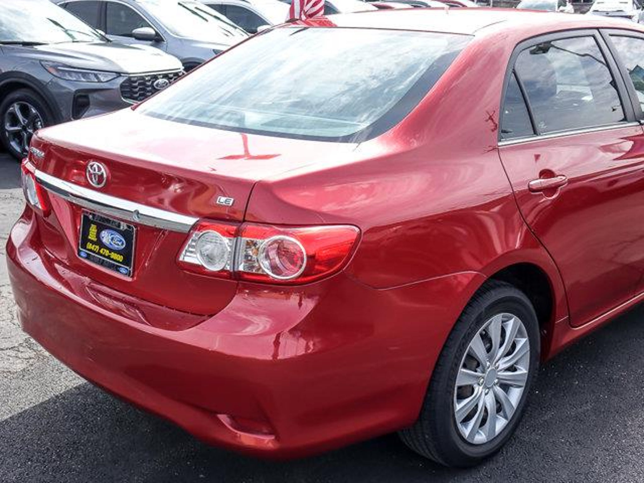 2013 Toyota Corolla LE Barcelona Red Metallic FWD 4D Sedan 1.8L I4 DOHC Dual VVT-i 4-Speed Automatic 26/34 City/Highway MPG **With some available options like ABS brakes, Air Conditioning, Anti-whiplash front head restraints, Brake assist, Bumpers: body-color, CD player, Driver door bin, Driver vanity mirror, Dual front impact airbags, Dual front side impact airbags, Electronic Stability Control, Front anti-roll bar, Front Bucket Seats, Front Center Armrest, Front reading lights, Front wheel independent suspension, Illuminated entry, Low tire pressure warning, Occupant sensing airbag, Outside temperature display, Overhead airbag, Panic alarm, Passenger door bin, Passenger vanity mirror, Power door mirrors, Power steering, Power windows, Rear anti-roll bar, Rear window defroster, Remote keyless entry, Speed-sensing steering, Split folding rear seat, Tachometer, Telescoping steering wheel, Tilt steering wheel, Traction control, and Trip computer ** Odometer is 15338 miles below market average! 26/34 City/Highway MPG #1 VOLUME FORD DEALER IN ILLINOIS & THE ENTIRE MIDWEST FOR 18 YEARS. Awards: * 2013 KBB.com 10 Best Used Compact Cars Under $10,000 * 2013 KBB.com Brand Image Awards * 2013 KBB.com Best Resale Value Awards