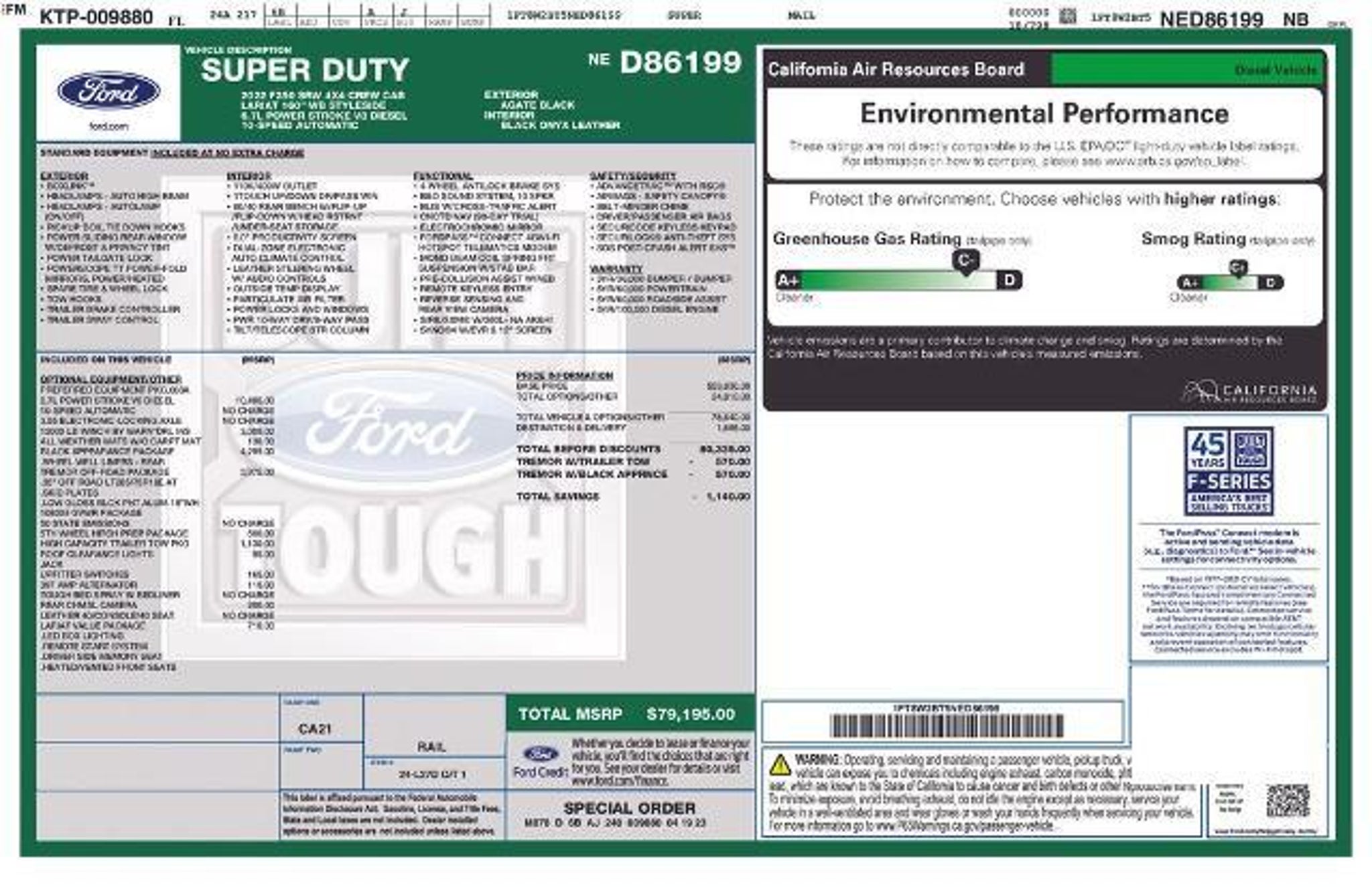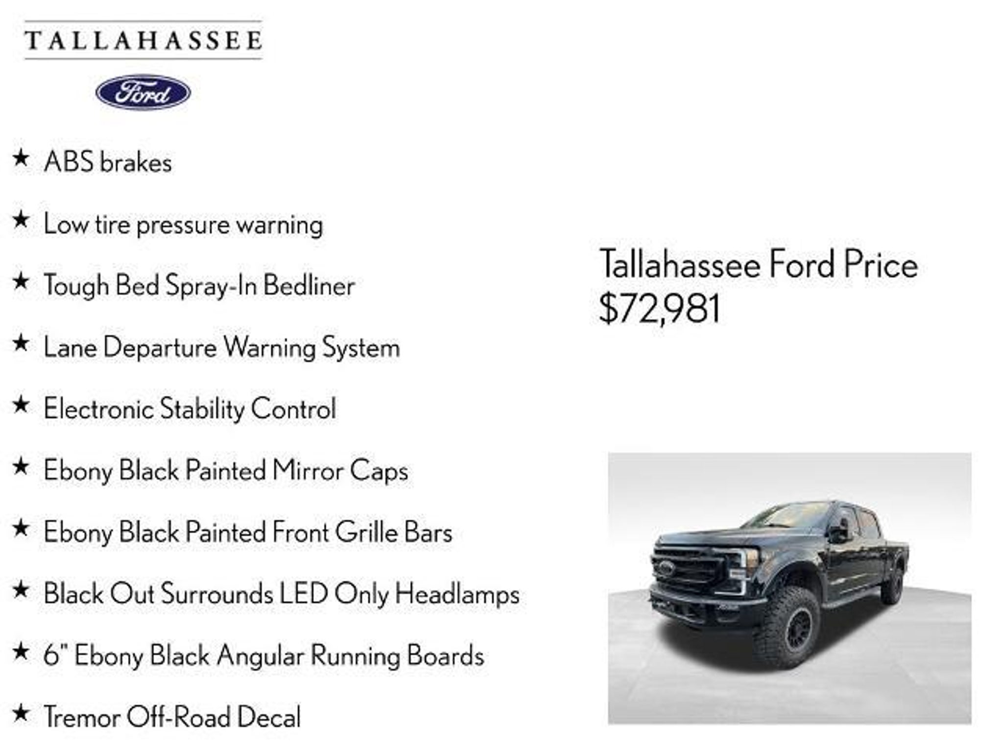Experience the unparalleled power and capability of the 2022 Ford F-250SD Lariat Tremor. This exceptional truck is built to conquer any terrain, whether you're tackling the toughest job sites or exploring the great outdoors. - One-Owner CarFax Certified Garage Kept! - 6.7L V8 Diesel Turbocharged (Power Stroke) with 10-Speed Automatic Transmission and 4WD - Tremor Off-Road Package with unique front springs, rear electronic locking differential, front limited slip differential, performance shock absorbers, and more - Black Appearance Package with black accents, 20-inch high-gloss black wheels, and tough bed spray-in liner - 12,000 LB Ford Performance Parts Winch by WARN with wireless and wired remote controls - High Capacity Trailer Tow Package with increased GVWR to 30,000 lbs - Lariat Value Package with memory power-adjustable pedals, heated/ventilated front seats, and more This F-250SD Lariat Tremor is the ultimate work and play companion. The powerful 6.7L V8 Diesel engine delivers exceptional towing and hauling capabilities, while the Tremor Off-Road Package ensures you can conquer any terrain with ease. The Black Appearance Package adds a bold, aggressive style that is sure to turn heads wherever you go. Designed with your needs in mind, this truck is packed with premium features that will enhance your driving experience. Enjoy the convenience of the SYNC 4 infotainment system, the comfort of the heated and ventilated front seats, and the added security of the rear camera with trailer hitch assist. Whether you're tackling a demanding job site or embarking on an off-road adventure, the 2022 Ford F-250SD Lariat Tremor is the ultimate tool for the job. Experience the power, capability, and style that this exceptional truck has to offer. Schedule a test drive today and discover why the F-250SD Lariat Tremor is the perfect choice for your next work or play vehicle. The listed online price reflects a $1,000 finance incentive and a $1,000 qualifying retail trade-in incentive; absence of either or both incentives will result in an increase of up to $2,000 to the final sale price.