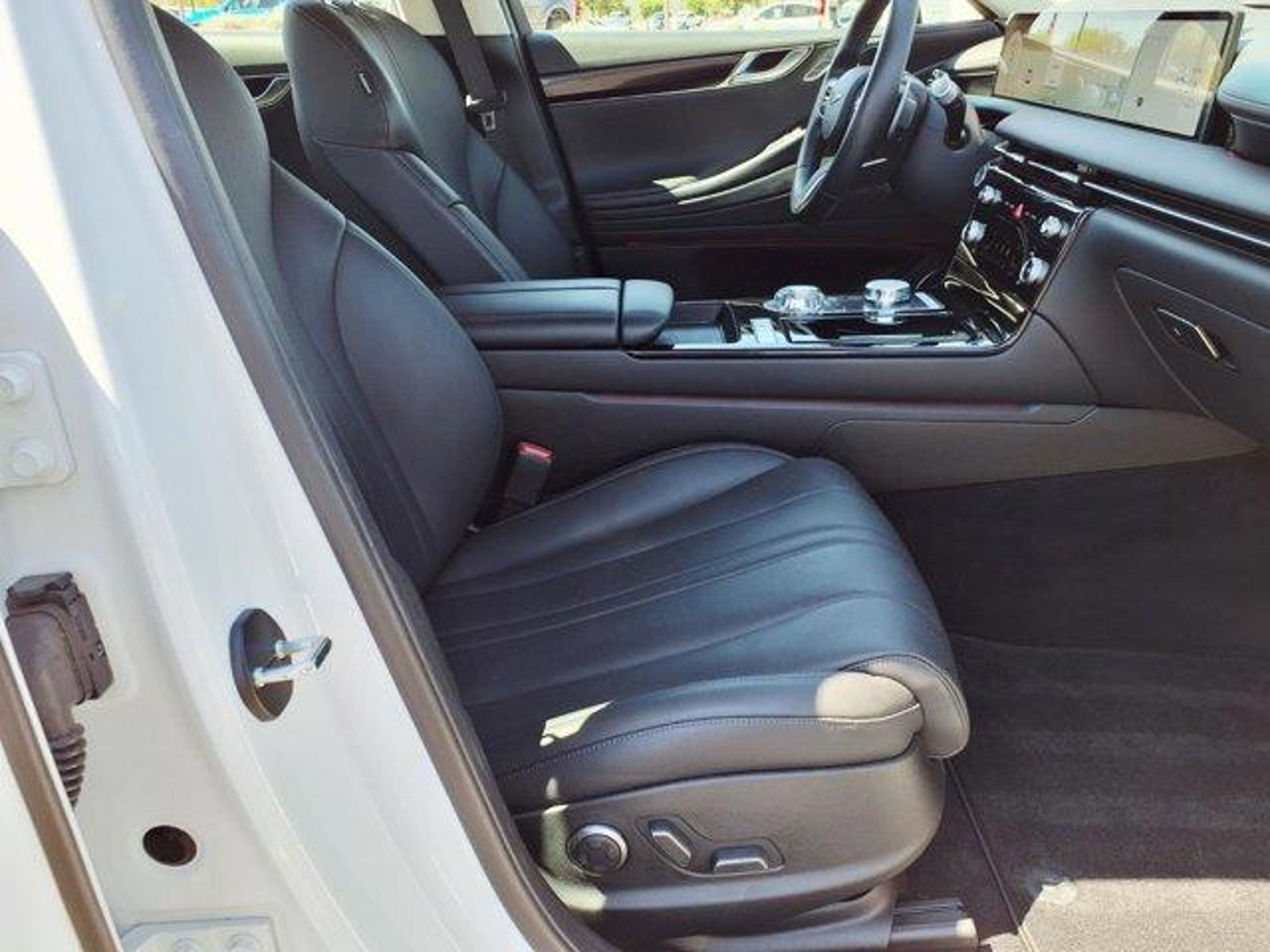 Alta White 2025 Genesis G80 2.5T AWD 8-Speed Automatic I4 12 Speakers, 4-Wheel Disc Brakes, ABS brakes, Air Conditioning, Alloy wheels, AM/FM radio: SiriusXM, Android Auto & Apple CarPlay, Anti-whiplash front head restraints, Auto High-beam Headlights, Auto tilt-away steering wheel, Auto-dimming door mirrors, Auto-dimming Rear-View mirror, Automatic temperature control, Bumpers: body-color, Compass, Delay-off headlights, Driver door bin, Driver vanity mirror, Dual front impact airbags, Dual front side impact airbags, Electronic Stability Control, Emergency communication system: Genesis Connected Services, Exterior Parking Camera Rear, Four wheel independent suspension, Front anti-roll bar, Front Bucket Seats, Front Center Armrest, Front dual zone A/C, Front reading lights, Fully automatic headlights, Garage door transmitter: HomeLink, Heated door mirrors, Heated Front Bucket Seats, Heated front seats, Heated rear seats, Heated steering wheel, Illuminated entry, Knee airbag, Leather steering wheel, Leatherette Seating Surfaces, Low tire pressure warning, Memory seat, Navigation System, Occupant sensing airbag, Option Group 01, Outside temperature display, Overhead airbag, Overhead console, Panic alarm, Passenger door bin, Passenger vanity mirror, Power door mirrors, Power driver seat, Power passenger seat, Power steering, Power windows, Radio data system, Radio: AM/FM/HD/SiriusXM Audio System, Rain sensing wipers, Rear anti-roll bar, Rear reading lights, Rear seat center armrest, Rear side impact airbag, Rear window defroster, Remote keyless entry, Security system, Speed control, Speed-sensing steering, Speed-Sensitive Wipers, Steering wheel memory, Steering wheel mounted audio controls, Tachometer, Telescoping steering wheel, Tilt steering wheel, Traction control, Trip computer, Turn signal indicator mirrors, Variably intermittent wipers, Wheels: 18 x 8.0J Alloy.20/29 City/Highway MPG
