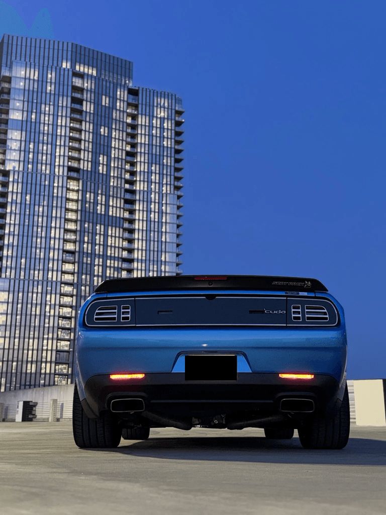 Air-Catcher HID Headlights, a Front Splitter, Widebody Fender Flares, a Satin Black-Finished Rear Spoiler, an Aluminum Hood with Dual Air Scoops, Aftermarket Fender Vents, an Aftermarket Taillight Panel Cover with 'Cuda Badging, and LED Taillights