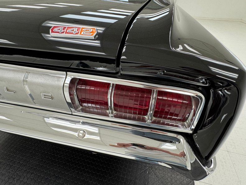 The gentlemen's muscle car begins with 60's era sharp angles and spectacular two stage Ebony Black paint intersected by polished stainless trim on the side, rocker panel, centerline of hood, and around each window. A coveted splash of color is reserved for the three section 442 emblems on the fenders and rear decklid. A chrome bumper underscores the symmetrical rear fascia with segmented tail lights and an equally divided center trim piece with enough segments to spell out OLDSMOBILE. Up front, the face has GM familiarity to it, and an F85 badge is centered on the horizontal rakes of the grille. 15-inch Magnum 500 wheels complement the exterior with black inserts and are wrapped in staggered tires with a mid 2023 date code. The exterior is as nice as they come with the only imperfection being some minor scratches on the molding trim.