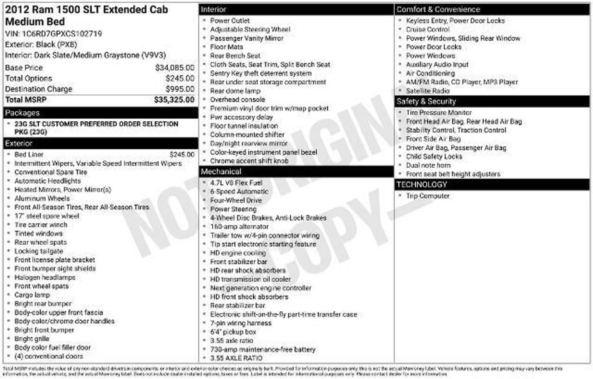 At Mullinax there are NO DEALER FEES ! That SAVES you $900 over our largest competitors every day. This 2012 Ram 1500 SLT is a rugged and capable truck that's ready to take on any task you throw its way. With its powerful 4.7L V8 engine, 4WD capabilities, and impressive towing capacity, this Ram is the perfect companion for your next adventure. - Radio: Uconnect 130 AM/FM/CD/MP3 - Air Conditioning - Power steering - Power windows - Remote keyless entry - Cruise control - Brake assist - Electronic Stability Control - Traction control This Ram 1500 SLT is not only capable, but it's also packed with features that will make your driving experience more comfortable and convenient. Enjoy the heated exterior mirrors, the illuminated entry, and the tilt steering wheel as you navigate the roads with confidence. The 40/20/40 split bench seat provides ample room for passengers, while the under-rail bedliner ensures your cargo stays secure. Mullinax Bronze vehicles give you the assurance of a 5 DAY/300-Mile RETURN POLICY, if you don't like it, BRING IT BACK! Bronze tag vehicles are sold in the condition they are traded for exceptional value, and are not reconditioned. At Mullinax, there are NO DEALER FEES! That saves you over $900 vs. Our largest competitors every day! Just add tax! Mullinax has over 3,500 vehicles to choose from! JUST ADD TAX! At Mullinax, there are NO DEALER FEES! We save you over $900 vs. Our largest competitors every day! Over 3,500 vehicles to choose from!
