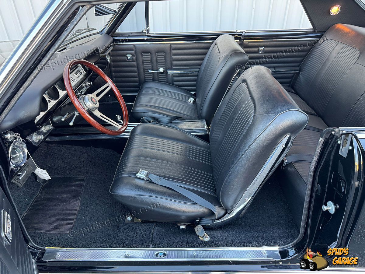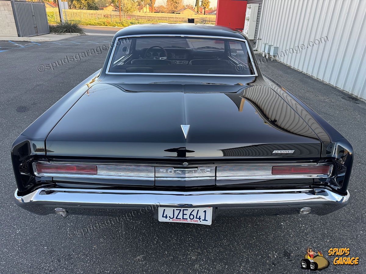 Exterior: Model #64-2237 2dr Sport Coupe (hardtop), original rust-free CA body, mild resto-mod, body-off frame rotisserie restoration, professional Onyx Black base-clear paint, trim-bright-work and trim restored, dual chrome sport mirrors, steel 15" body-color wheels, Pontiac Motor Division dog-dish hub caps, BF Goodrich Radial TA tires (Front 205/60R15-Rear 245/60R15).