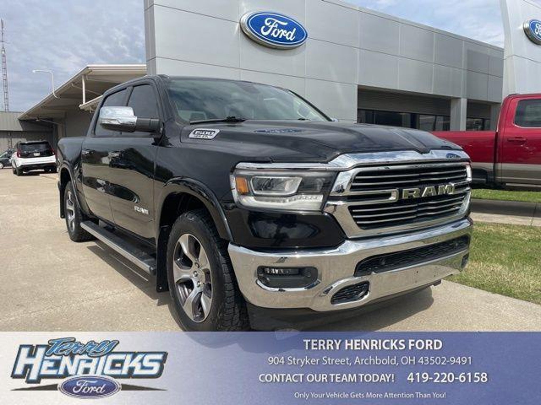 BLUETOOTH, uCONNECT, AM/FM/CD, SIRIUSXM, REMOTE START, HEATED FRONT SEATS, HEATED STEERING WHEEL, VENTILATED FRONT SEATS, POWER SEATS, POWER ADJUSTABLE PEDALS, REAR POWER SLIDE WINDOW, REAR CAMERA, BLIND SPOT AND CROSSPATH DETECTION, FRONT AND REAR PARK ASSIST, CLASS IV RECEIVER HITCH, 1500 Laramie, HEMI 5.7L V8 Multi Displacement VVT, 8-Speed Automatic, 4WD, 10 Speakers, 3.21 Rear Axle Ratio, Adjustable pedals, Alloy wheels, AM/FM radio: SiriusXM, Auto High Beam Headlamp Control, Blind Spot & Cross Path Detection, Foam Bottle Insert (Door Trim Panel), Heated Front Seats, Heated Steering Wheel, Laramie Level 1 Equipment Group, ParkSense Front/Rear Park Assist w/Stop, ParkView Rear Back-Up Camera, Power driver seat, Power passenger seat, Quick Order Package 25H Laramie, Radio: Uconnect 4 w/8.4 Display, Rain Sensitive Windshield Wipers, Remote Tailgate Release, Single Disc Remote CD Player, SiriusXM Satellite Radio, Tailgate Ajar Warning Lamp, Ventilated Front Seats, Wheels: 20 x 9 Premium Paint/Polished. Laramie 4D Crew Cab 4WD 8-Speed Automatic HEMI 5.7L V8 Multi Displacement VVT 2019 Ram 1500 Laramie Awards: * Motor Trend Automobiles of the year * NACTOY 2019 North American Truck of the Year * 2019 KBB.com 10 Best Road Trip Cars * 2019 KBB.com Best Auto Tech Awards * 2019 KBB.com 10 Favorite New-for-2019 Cars ******** At Terry Henricks, we know you're looking for that certain vehicle which offers the best value for your hard-earned money and ranks best in price and mileage. Great news! Terry uses Live Market Pricing that eliminates the guesswork and drastically reduces your research time, because Terry prices all our cars haggle-free and well below market value. ****** CALL NOW FOR AVAILABILITY ****** At Terry Henricks we carry all Makes and Models in All Colors! * Terry Henricks, serving the Archbold, Ohio and surrounding markets for over 25 years - Your true 'Home Town Dealer' * Our reputation stands on its own ~ Every used vehicle goes through a 48-point inspection (excluding AS-IS) ~ This is our standard ~ This is our way ~ We will not risk our reputation * Only your vehicle gets more attention than you! *