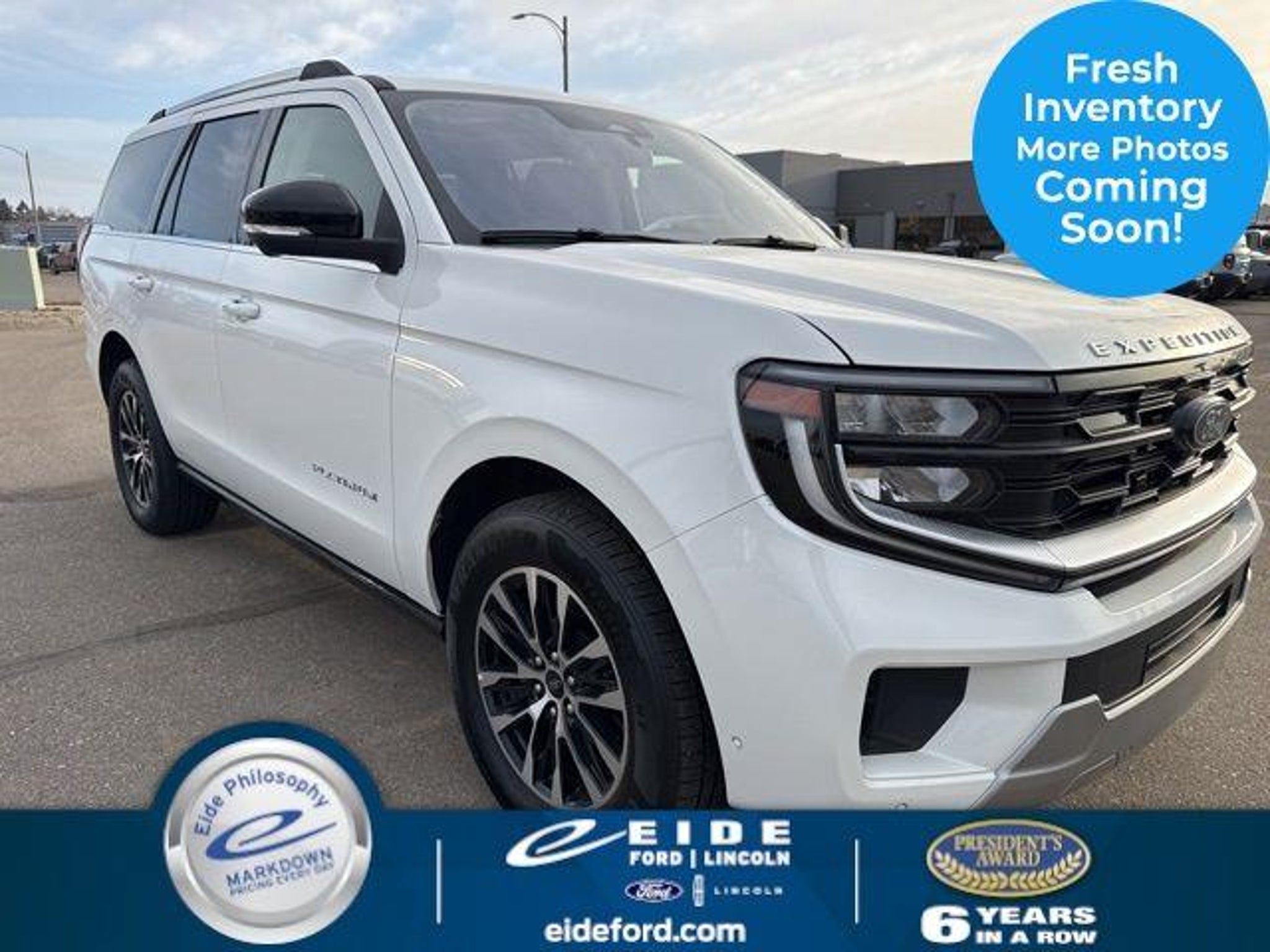 Discover the Pinnacle of Luxury and Capability in the 2025 Ford Expedition Platinum Meticulously crafted with the discerning driver in mind, the 2025 Ford Expedition Platinum is a true masterpiece of automotive engineering. This stunning SUV boasts an array of premium features that elevate the driving experience to new heights. - 360 Camera - 3rd Row Seating - Accident Free Auto Check - Adaptive Cruise Control - Apple CarPlay/Android Auto - B & O Play Premium Audio - Blind Spot Monitoring System - Blue Cruise - Bluetooth Handsfree Phone - Dual-Pane Panoramic Vista Roof - Heated Rear Seats - Heated Steering Wheel - Heated/Cooled Front Seats - Lane Departure Warning - Lane Keep Assist Powered by the renowned EcoBoost 3.5L V6 GTDi DOHC 24V Twin Turbocharged engine, this Expedition Platinum delivers exceptional performance and efficiency, effortlessly conquering any terrain. Paired with a seamless 10-Speed Automatic transmission and 4-Wheel Drive, this SUV is a true force to be reckoned with. Stepping inside, you'll be greeted by a cabin that exudes sophistication and comfort. The Leather Seats, Heated and Ventilated Front Captain's Chairs, and Heated Steering Wheel ensure unparalleled relaxation, while the Dual-Pane Panoramic Vista Roof floods the interior with natural light, creating a truly breathtaking atmosphere. The Expedition Platinum's advanced technology features, including the Connectivity Package, Navigation/GPS, and the renowned B&O Sound System, keep you connected, entertained, and in complete control. The Reverse Sensing System and Backup Camera provide added peace of mind, while the Pro Trailer Back Up Assist simplifies even the most challenging towing tasks. This 1-Owner, Accident Free vehicle is a true testament to Ford's commitment to quality and innovation. With its stunning White Exterior and meticulously maintained interior, the 2025 Ford Expedition Platinum is a sight to behold. This vehicle qualifies for our exclusive RISK FREE guarantee. This includes: - 5 Day/250 Mile Money Back Guarantee - No Exception Inspection - 60 day/3,000 mile powertrain warranty - Autocheck Vehicle History Report - 1 year complimentary Roadside Assistance - Engine For Life coverage We are Western North Dakota's largest Ford Dealer. Winner of Ford Motor Company's prestigious President's Award for sales, service & customer satisfaction for the past six years in a row! We have been in business since 1981 and are locally owned and operated. At Eide Ford, we believe in giving you a fair and competitive pri