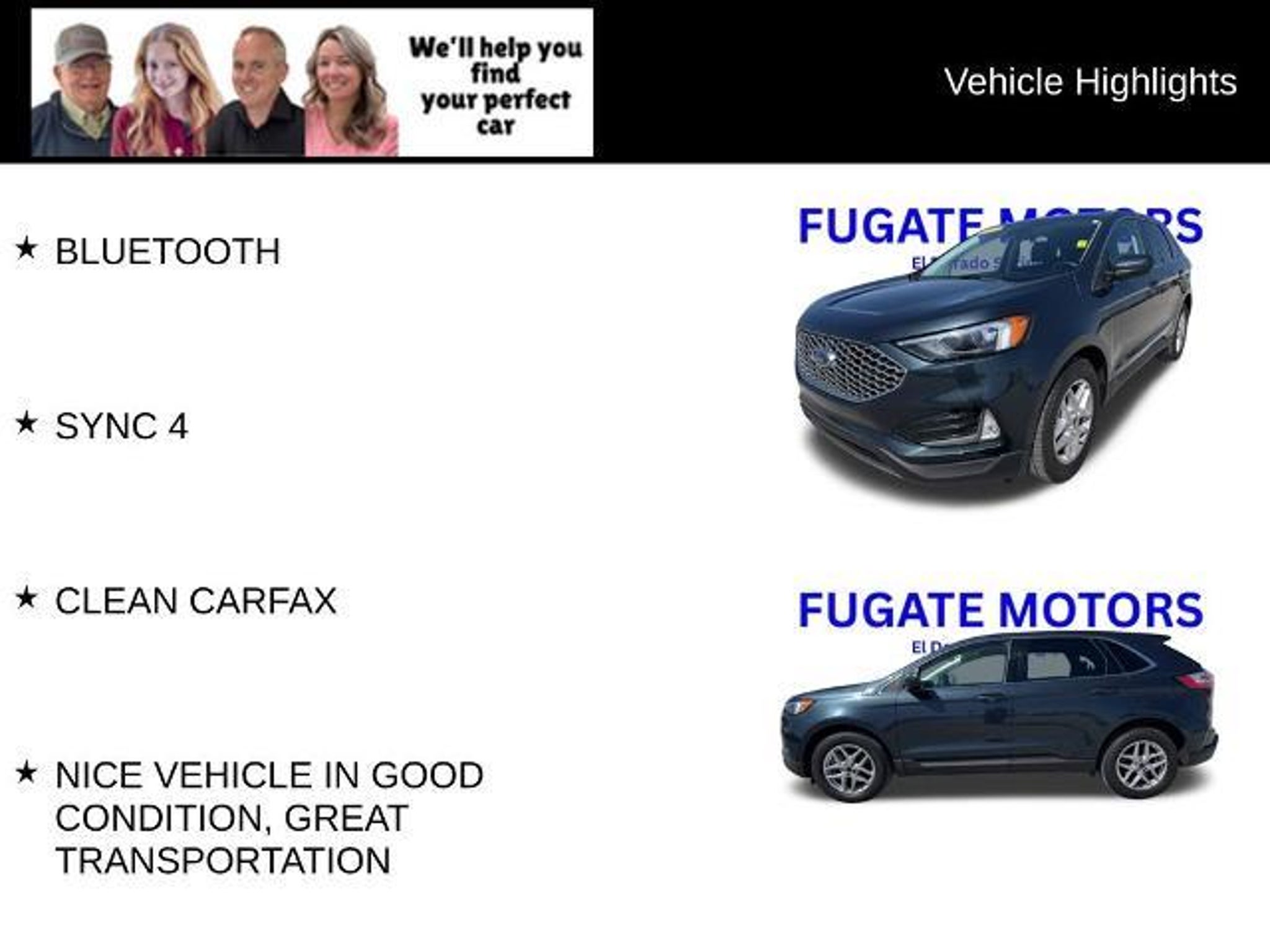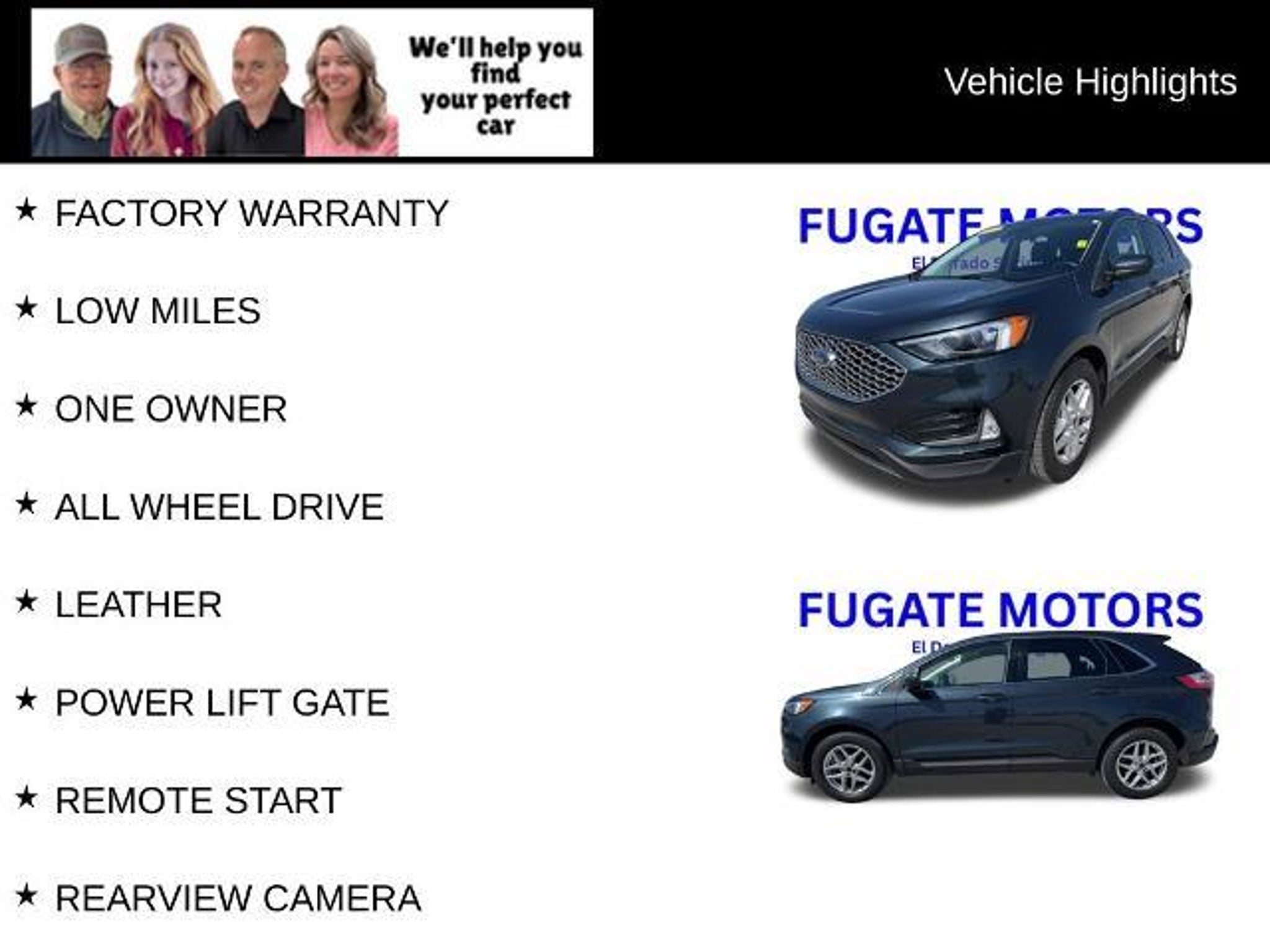 As always-ABSOLUTELY NO FEES! This 2023 Ford Edge SEL is a standout choice for the discerning buyer. With its sleek Blue exterior and a wealth of premium features, this vehicle is poised to exceed your expectations. - One Owner - Low Mileage - All-Wheel Drive - Leather Upholstery - Power Liftgate - Remote Start - Rearview Camera - Bluetooth Connectivity - SYNC 4 Infotainment System - Wireless Charging Pad - Universal Garage Door Opener - Perimeter Alarm - Fog Lamps with Iconic Silver Bezel - 110V/150W AC Power Outlet The EcoBoost 2.0L I4 engine, paired with an 8-speed automatic transmission, delivers an impressive balance of power and efficiency, with 21 MPG in the city and 28 MPG on the highway. The all-wheel-drive system ensures confident handling in a variety of road conditions, making this Edge SEL a versatile and capable companion. Slip into the heated, leather-wrapped steering wheel and experience the refined comfort of the ActiveX seating material. The heated front seats and dual-zone automatic climate control will keep you and your passengers cozy, no matter the weather. The Convenience Package adds even more convenience with features like the wireless charging pad, universal garage door opener, and power liftgate. Safety is paramount, and this Edge SEL comes equipped with a comprehensive suite of advanced driver-assistance technologies, including a rearview camera, rear parking sensors, and Ford's SYNC 4 911 Assist system for added peace of mind. With its sleek styling, impressive performance, and wealth of premium features, this 2023 Ford Edge SEL is a true standout in its class. Don't miss the opportunity to experience this exceptional vehicle firsthand. Visit our showroom today and let us demonstrate how this Edge SEL can elevate your driving experience. As always-ABSOLUTELY NO FEES!