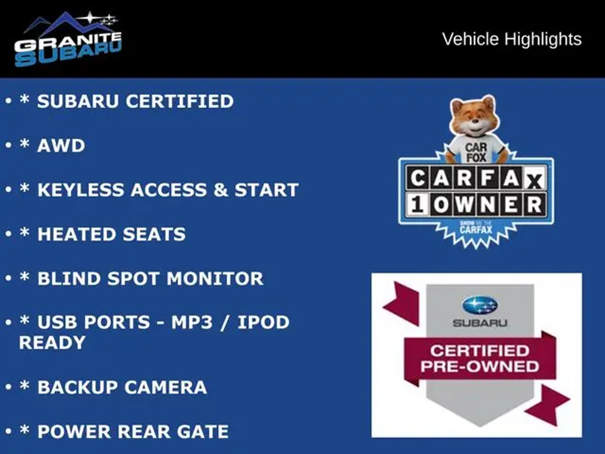 * SUBARU CERTIFIED, * AWD, * KEYLESS ACCESS & START, * HEATED SEATS, * BLIND SPOT MONITOR, * USB PORTS - MP3 / IPOD READY, * BACKUP CAMERA, * POWER REAR GATE. Subaru Certified Pre-Owned Details: * Warranty Deductible: $0 * Roadside Assistance * Powertrain Limited Warranty: 84 Month/100,000 Mile (whichever comes first) from original in-service date * Vehicle History * 152 Point Inspection * Transferable Warranty * SiriusXM 3-Month trial subscription, $500 Owner Loyalty coupon & 1 year trial subscription to STARLINK At Granite Subaru in Hudson, NH we use real market data from credible 3rd parties like Edmunds so you can get a market proven price and a clear value of what your trade is worth. It's all about transparency, honesty, and integrity so you can purchase with confidence and walk away with a great deal. Our experienced sales staff is eager to share its knowledge and enthusiasm with you. We encourage you to browse our online inventory, schedule a test drive and investigate financing options. You can also request more information about a vehicle using our online form or by calling .