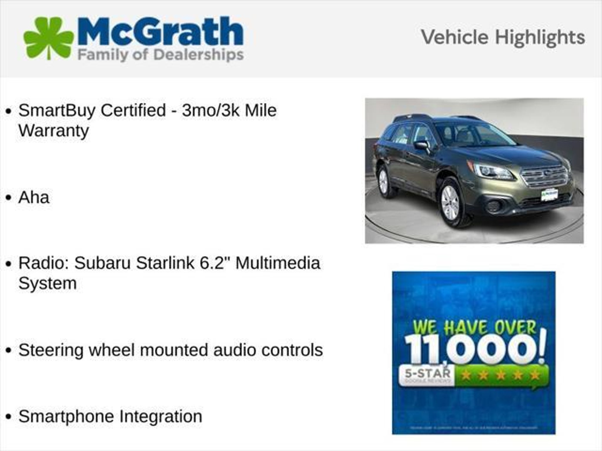 Details > 2017 Subaru Outback AWD 2.5I 4DR Wagon For Sale in Dubuque, IA Private Party Sellers Click here to place your ad now! You auta tell them you saw the ad in AutaBuy when you call or email. 1/29 2/29 3/29 4/29 5/29 6/29 7/29 8/29 9/29 10/29 11/29 12/29 13/29 14/29 15/29 16/29 17/29 18/29 19/29 20/29 21/29 22/29 23/29 24/29 25/29 26/29 27/29 28/29 29/29 View 29 Photos View All Add to My Garage Parked in Your Garage! Mcgrath Hyundai of Dubuque Contact Seller: I would like to: Make Offer Check Availability Ask A Question Request More Photos Check Financing Options Send a copy of this message to me Add this listing to my garage Send to Mobile Mileage 71,000 Exterior Color Wilderness Green Metallic Interior Color Warm Ivory Doors 4 Engine 2.5L H4 Transmission 6 Speed Stock # N14287 VIN 4S4BSAACXH3278671 Estimated Monthly Payment $301 mo Apply Now J.J. Best Banc & Co. 2017 Subaru Outback AWD 2.5I 4DR Wagon Description: Mcgrath Hyundai Of Dubuque · Mileage: 71,000 · Color: Wilderness Green Metallic Price: $17,277. Mileage 71,000 Exterior Color Wilderness Green Metallic Interior Color Warm Ivory Doors 4 Engine 2.5L H4 Transmission 6 Speed Stock # N14287 VIN 4S4BSAACXH3278671 Estimated Monthly Payment $301 mo Apply Now J.J. Best Banc & Co. Add to My Garage Parked in Your Garage! Message Seller Mcgrath Hyundai of Dubuque Contact Seller: I would like to: Make Offer Check Availability Ask A Question Request More Photos Check Financing Options Send a copy of this message to me Add this listing to my garage Offered for sale by Mcgrath Hyundai of Dubuque DUBUQUE, IA Price: $17,277. Offered for sale by Mcgrath Hyundai of Dubuque DUBUQUE, IA [entire inventory] Ask Auta Intelligence The first collector-car AI built directly into a classic car marketplace When was this model first introduced? How many Outbacks were produced in Green? How far is this from me? Tell me more about this model What colors did these come in? What does this VIN number tell me? Can you show me more cars for a similar price? How easy are parts to find for this model? What trim levels were available for this model? What engine options did these come with? What kind of mileage do these get? Where is this located? What transmission options did these offer? What factory options were available on this model? How many of these were produced? Do you have a similar car to sell? List It Now! Questions about this car? Ask Auta Intelligence for production numbers, available options, etc. · Subscribe to AutaBuy! · Send a Gift Subscription Notice to a Friend