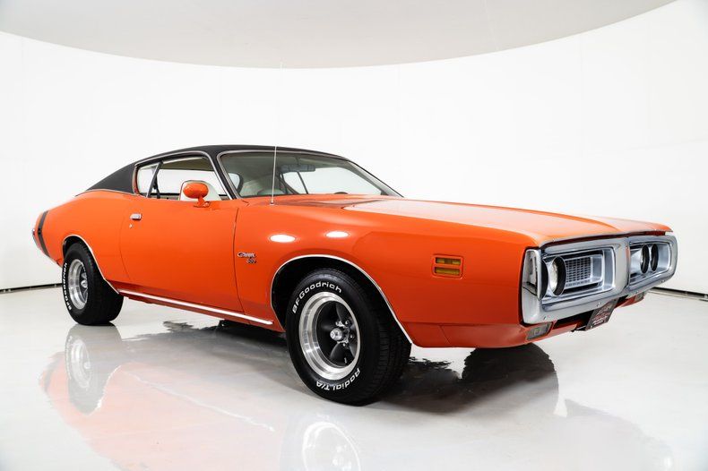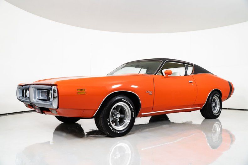 This 1971 Dodge Charger 500 for sale has a Matching-Numbers 383 V8, 727 TorqueFlite Automatic Transmission, 8 3/4 Rear End w/ 3.23 Gears, Hemi Orange Exterior w/ Black Vinyl Top, White Interior w/ Bucket Seats, Power Brakes, Power Steering, Factory Air Conditioning, 15" American Racing Wheels, 275/60R15 Rear Tires & 245/60R15 Front Tires, A well-documented 1971 Dodge Charger for sale, this example highlights the style and performance of early '70s Mopar muscle!!