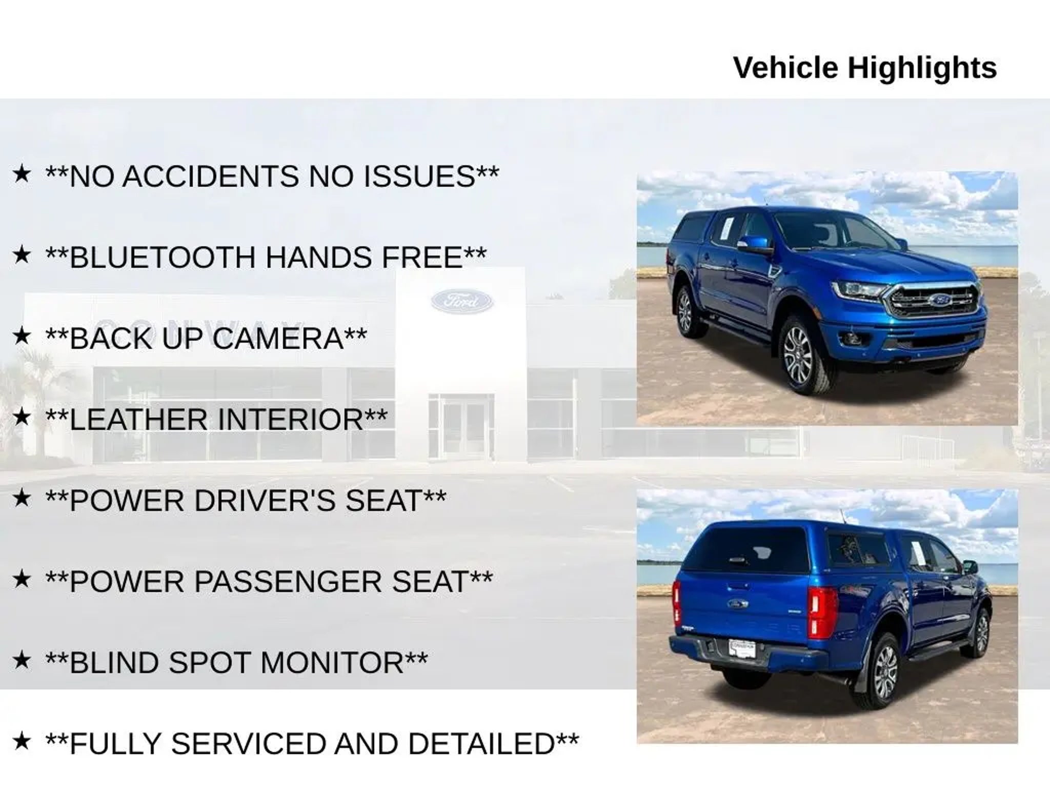 Discover the perfect blend of power, capability, and modern convenience with this 2019 Ford Ranger Lariat. This exceptional mid-size truck boasts a remarkable combination of features that make it an outstanding choice for both work and play. - **NO ACCIDENTS NO ISSUES** - **BLUETOOTH HANDS FREE** - **BACK UP CAMERA** - **LEATHER INTERIOR** - **POWER DRIVER'S SEAT** - **POWER PASSENGER SEAT** - **BLIND SPOT MONITOR** - **FULLY SERVICED AND DETAILED** - Apple Carplay-Android Auto - Remote Start - Lane Keep Assist - Front and Rear Parking Sensors - Heated Power Mirrors - FordPass Connect Powered by the impressive EcoBoost 2.3L I4 GTDi DOHC Turbocharged VCT engine and paired with a smooth-shifting 10-Speed Automatic transmission, this Ranger Lariat delivers exceptional performance and efficiency. With its 4WD capabilities, you'll conquer any terrain with confidence, while the Bed Utility Package enhances its versatility for all your hauling needs. Stepping inside, you'll be greeted by a premium leather-wrapped interior, complete with heated power-adjustable front seats and a host of advanced technology features. The SYNC 3 infotainment system with Apple CarPlay and Android Auto integration keeps you connected and entertained on the go, while the Blind Spot Monitor and Rear Parking Sensors provide added peace of mind. Beyond its impressive capabilities, this Ranger Lariat also boasts a striking Blue exterior that commands attention. The 5 Rectangular Black Running Boards and Plastic Drop-In Bedliner add a touch of rugged style, while the Front Fog Lights and Fully Automatic Headlights ensure excellent visibility in any driving conditions. Whether you're tackling tough jobs or seeking an adventure-ready companion, this 2019 Ford Ranger Lariat is the perfect choice. With its exceptional performance, advanced features, and head-turning style, it's a true standout in the mid-size truck segment. Experience the difference for yourself and schedule a test drive today.